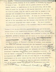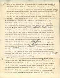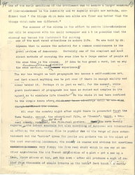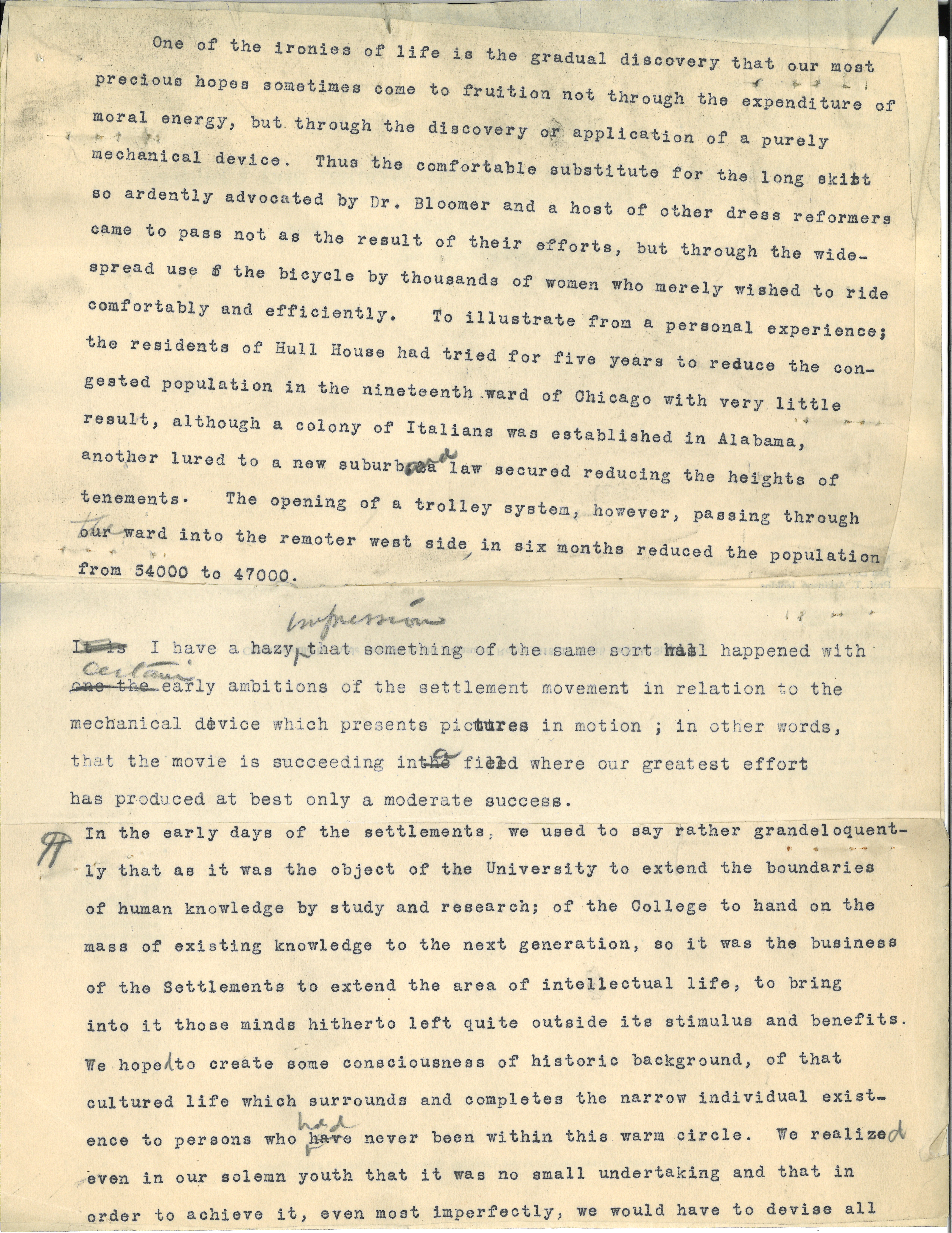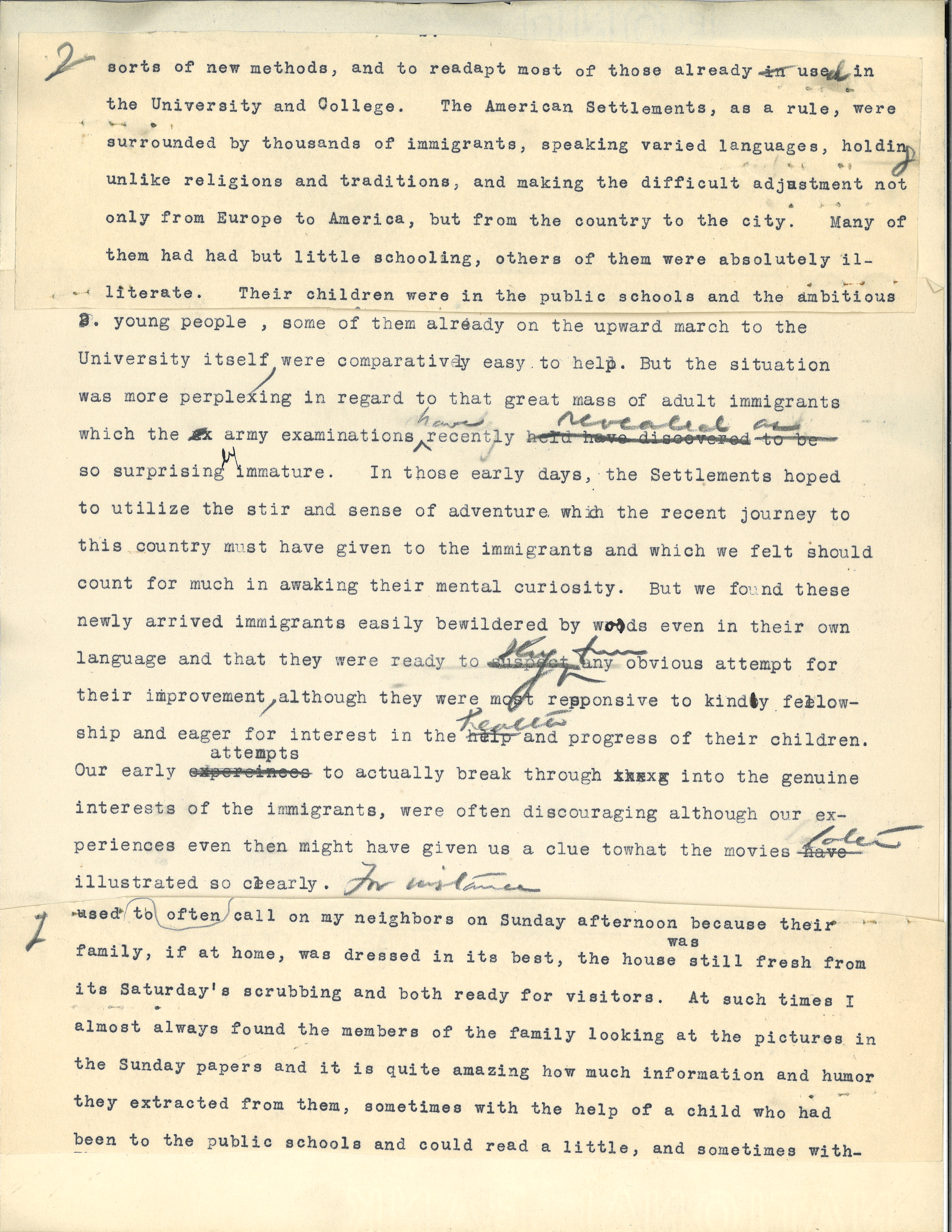 In the early days of the settlements, we used to say rather grandiloquently that as it was the object of the University to extend the boundaries of human knowledge by study and research; of the College to hand on the mass of existing knowledge to the next generation, so it was the business of the Settlements to extend the area of intellectual life, to bring into it those minds hitherto left quite outside its stimulus and benefits. We hoped to create some consciousness of historic background, of that cultured life which surrounds and completes the narrow individual existence to persons who ↑had↓ have never been within this small circle. We realized even in our solemn youth that it was no small undertaking and that in order to achieve it, even most imperfectly, we would have to devise all [page 2] sorts of new methods, and to readapt most of those already in used in the University and College. The American Settlements, as a rule, were surrounded by thousands of immigrants, speaking varied languages, holding unlike religions and traditions, and making the difficult adjustment not only from Europe to America, but from the country to the city. Many of them had had but little schooling, others of them were absolutely illiterate. Their children were in the public schools and the ambitious young people, some of them already on the upward march to the University itself, were comparatively easy to help. But the situation was more perplexing in regard to that great mass of adult immigrants which the ex army examinations ↑have↓ recently held have discovered to be ↑revealed as↓ so surprisingly immature. In those early days, the Settlements hoped to utilize the stir and sense of adventure which the recent journey to this country must have given to the immigrants and which we felt should count for much in awaking their mental curiosity. But we found these newly arrived immigrants easily bewildered by words even in their own language and that they were ready to suspect ↑shy from↓ any obvious attempt for their improvement, although they were most responsive to kindly fellowship and eager for interest in the help ↑health↓ and progress of their children. Our early experiences ↑attempts↓ to actually break through [illegible] into the genuine interests of the immigrants, were often discouraged although our experiences even then might have given us a clue to what the movies have ↑later↓ illustrated so clearly.