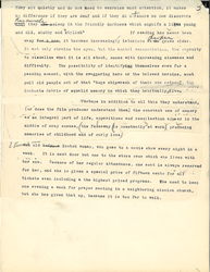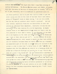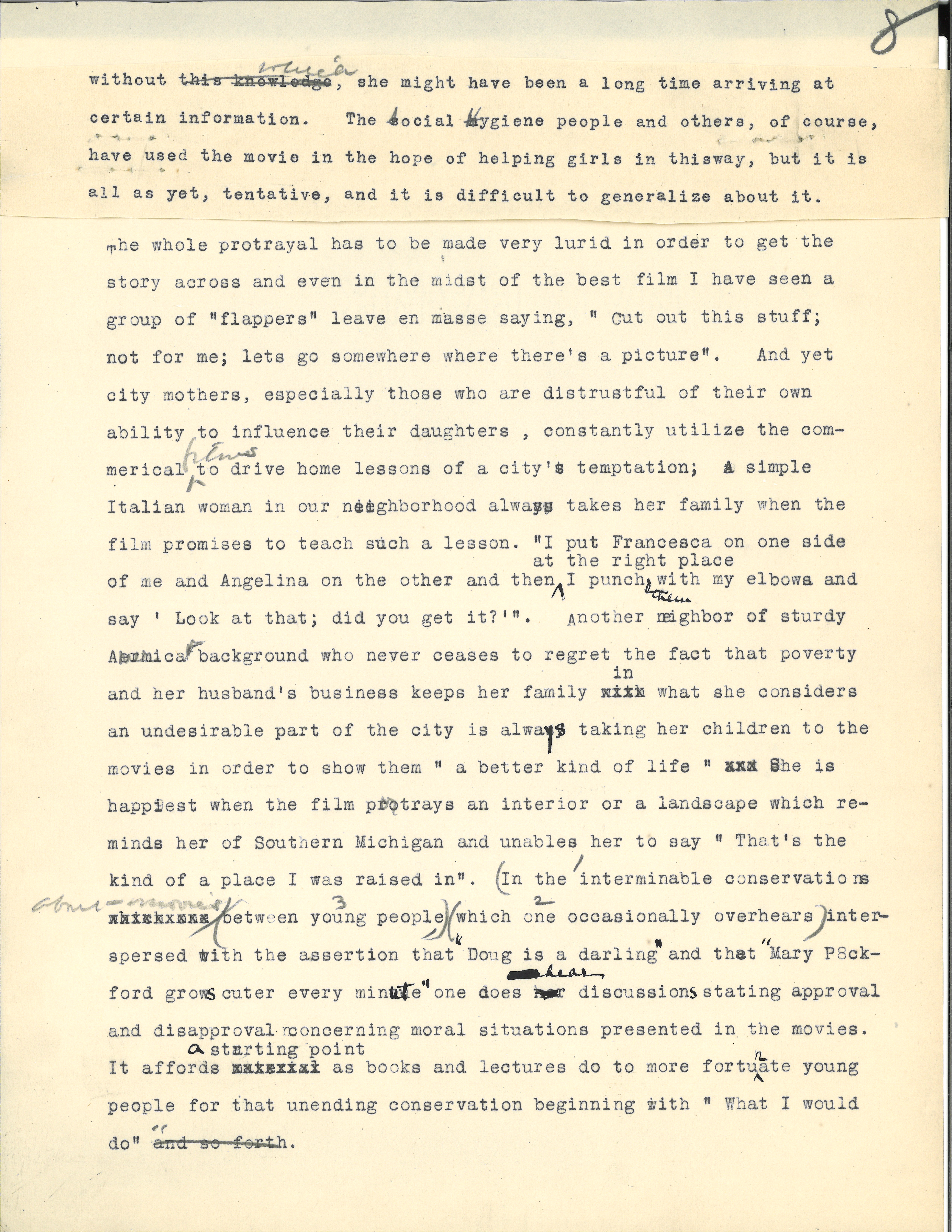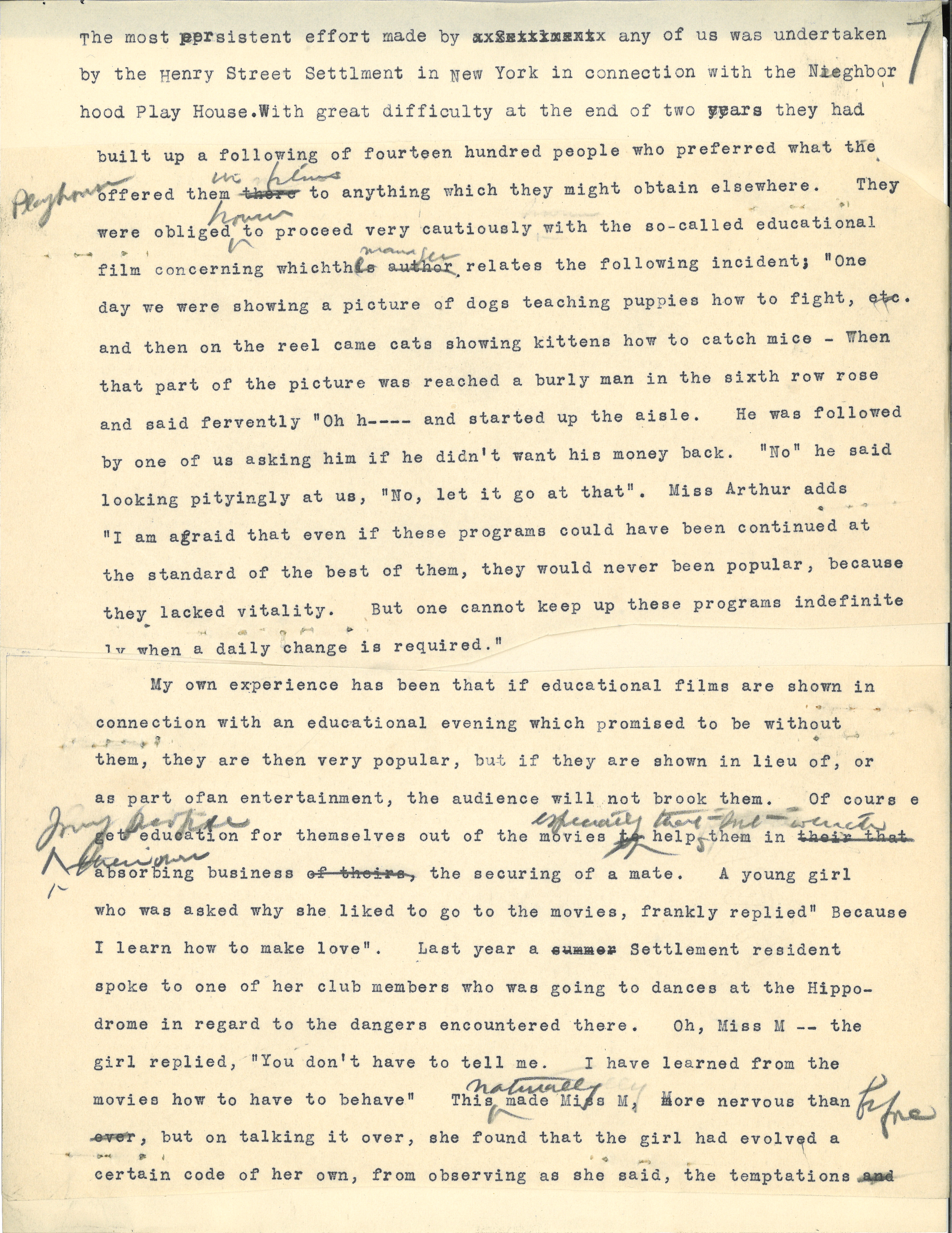 My own experience has been that if educational films are shown in connection with an educational evening which promised to be without them, they are then very popular, but if they are shown in lieu of, or as part of an entertainment, the audience will not brook them. Of course ↑young people↓ get education for themselves out of the movies ↑especially that part which↓ to helps them in their that ↑their own↓ absorbing business of theirs, the securing of a mate. A young girl who was asked why she like to go to the movies, frankly replied "Because I learn how to make love." Last year a summer Settlement resident spoke to one of her club members who was going to dances at the Hippodrome in regard to the dangers encountered there. "Oh, Miss M --" the girl replied, "You don’t have to tell me. I have learned from the movies how to have to behave." This ↑naturally↓ made Miss M. more nervous than ↑before↓ ever, but on talking it over, she found that the girl had evolved a certain code of her own, from observing as she said, the temptations and [page 8] without this knowledge ↑which↓, she might have been a long time arriving at certain information. The Social Hygiene people and others, of course, have used the movie in the hope of helping girls in this way, but it is all as yet, tentative, and it is difficult to generalize about it. The whole portrayal has to be made very lurid in order to get the story across and even in the midst of the best film I have seen a group of "flappers" leave en masse saying, "Cut out this stuff; not for me; let's go somewhere where there's a picture." And yet city mothers, especially those who are distrustful of their own ability to influence their daughters, constantly utilize the commercial ↑films↓ to drive home lessons of a city's temptation; a simple Italian woman in our neighborhood always takes her family when the film promises to teach such a lesson. "I put Francesca on one side of me and Angelina on the other and then ↑at the right place↓ I punch ↑them↓ with my elbows and say 'Look at that; did you get it?'" Another neighbor of sturdy [American] background who never ceases to regret the fact that poverty and her husband's business keeps her family [illegible] ↑in↓ what she considers an undesirable part of the city is always taking her children to the movies in order to show them "a better kind of life." [illegible] She is happiest when the film portrays an interior or a landscape which reminds her of Southern Michigan and [enables] her to say "That's the kind of a place I was raised in." In the interminable [conversations?] [illegible] ↑about movies↓ which one occasionally overhears between young people, interspersed with the assertion that "Doug is a darling" and that "Mary Pickford grows cuter every minute" one does her ↑hear↓ discussions stating approval and disapproval concerning moral situations presented in the movies. It affords [illegible] ↑a starting point↓ as books and lectures do to more fortunate young people for that unending [conversation?] beginning with "What I would do" And so forth . [page 9]