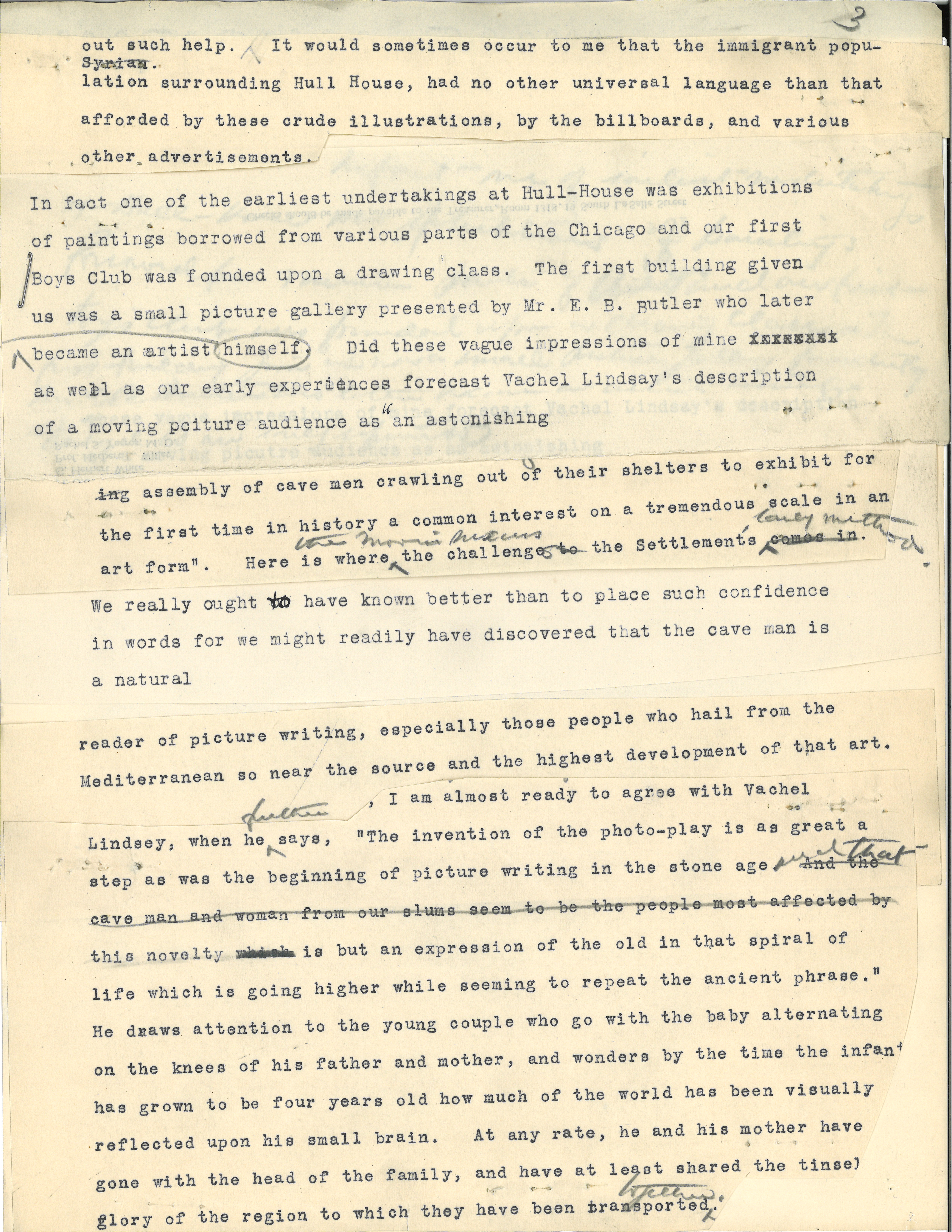 In fact one of the earliest undertakings at Hull House was exhibitions of paintings borrowed from various parts of Chicago and our first Boys Club was founded upon a drawing class. The first building given us was a small picture gallery presented by Mr. E. B. Butler who himself became an artist. Did these vague impressions of mine [illegible] as well as our early experiences forecast Vachel Lindsay's description of a moving picture audience as "an astonishing assembly of cave men crawling out of their shelters to exhibit for the first time in history a common interest on a tremendous scale in an art form." Here is where ↑the movie's success↓ the challenges to the Settlement's ↑early method↓ comes in. We really ought to have known better than to place such confidence in words for we might readily have discovered that the cave man is a natural reader of picture writing, especially those people who hail from the Mediterranean so near the source and the highest development of that art.