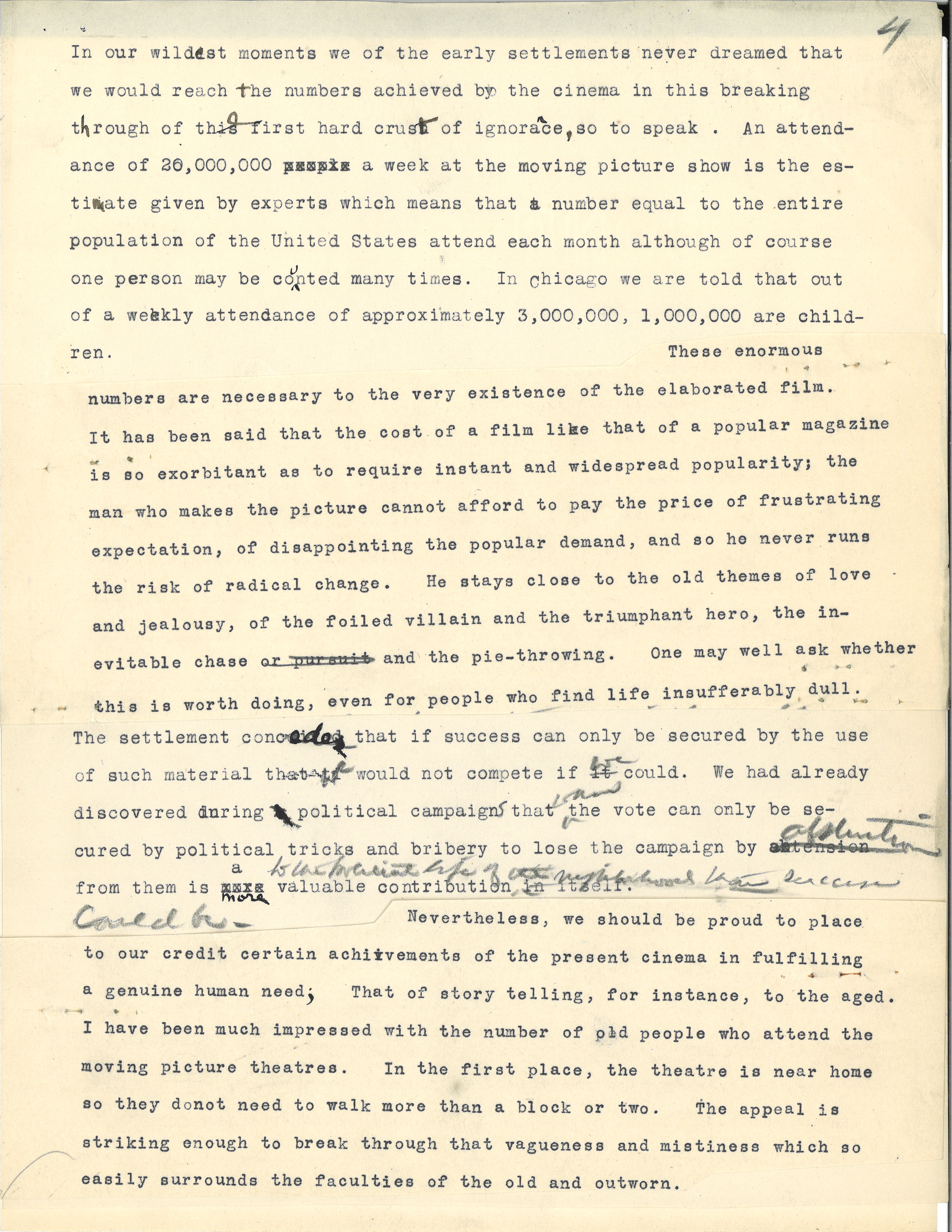 These enormous numbers are necessary to the very existence of the elaborated film. It has been said that the cost of a film like that of a popular magazine is so exorbitant as to require instant and widespread popularity; the man who makes the picture cannot afford to pay the price of frustrating expectation, of disappointing the popular demand, and so he never runs the risk of radical change. He stays close to the old themes of love and jealousy, of the foiled villain and the triumphant hero, the inevitable chase or pursuit and the pie-throwing. One may well ask whether this is worth doing, even for people who find life insufferably dull. The settlement concedes that if success can only be secured by the use of such material that [we] would not compete if it ↑we↓ could. We had already discovered during a political campaigns that ↑when↓ the vote can only be secured by political tricks and bribery to lose the campaign by [illegible] ↑abstention↓ from them is ↑a↓ [illegible] ↑more↓ valuable contribution ↑to the political life of the neighborhood than success could be↓ in itself.