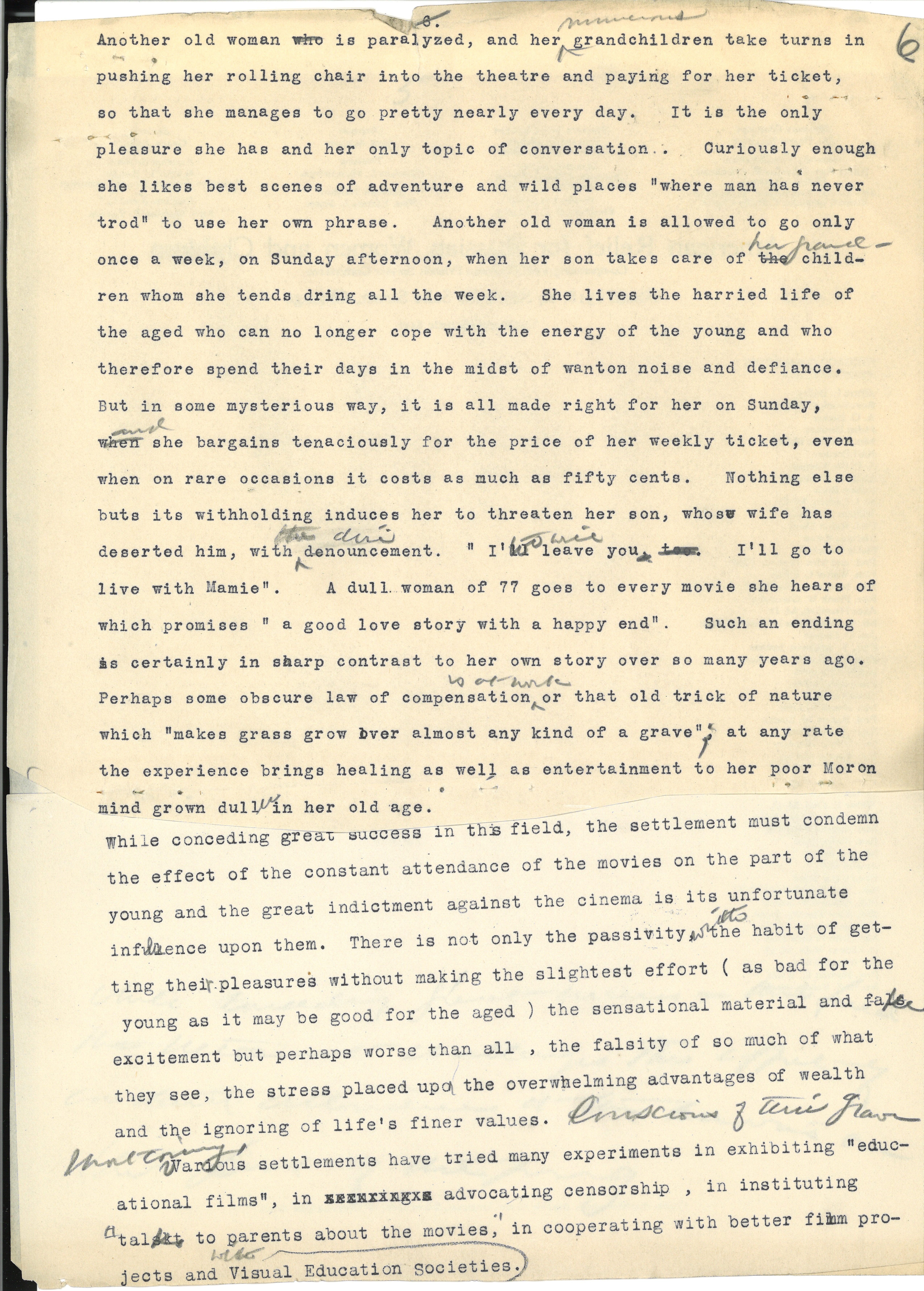 ↑I know an↓ one old lady, a Scotch woman, who goes to a movie shows every night in a week. It is next door but one to the store over which she lives with her son. Because of her regular attendance, one seat is always reserved for her, and she is given a special price of fifteen cents for all tickets even including a the highest priced programs. She used to keep one evening a week for prayer meeting in a neighboring mission church, but she has given that up, because it is too far to walk. [page 6] Another old woman who is paralyzed, and her ↑numerous↓ grandchildren take turns pushing her rolling chair into the [theater] and paying for her ticket, so that she manages to go pretty nearly every day. It is the only pleasure she has and her only topic of conversation. Curiously enough she likes best scenes of adventure and wild places "where man has never trod" to use her own phrase. Another old woman is allowed to go only once a week, on Sunday afternoon, when her son takes care of the ↑her grand↓ children whom she tends [during] all the week. She lives the harried life of the aged who can no longer cope with the energy of the young and who therefore spend their days in the midst of wanton noise and defiance. But in some mysterious way, it is all made right for her on Sunday, when ↑and↓ she bargains tenaciously for the price of her weekly ticket, even when on rare occasions it cost as much as fifty cents. Nothing else [but] its withholding induces her to threaten her son, whose wife has deserted him, with ↑the dire↓ denouncement, "I too will↓ leave you, too. I'll go to live with Mamie." A dull woman of 77 goes to every movie she hears of which promises "a good love story with a happy end." Such an ending is certainly in sharp contrast to her own story over so many years ago. Perhaps some obscure law of compensation ↑is at work↓ or that old trick of nature which "makes grass grow over almost any kind of a grave," at any rate the experience brings healing as well as entertainment to her poor moron mind grown duller in her old age.