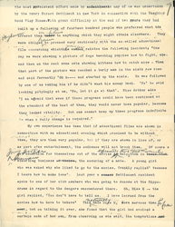 The [illegible] infant cinema was born of honest mechanics starting life quite free from any moral taint but it was almost immediately adopted by vulgar people who used it to show questionable subjects in penny arcades and as a performing stunt in vaudeville shows often between vulgar songs and ribald dances. The industry to this day shows many traces of its unhappy childhood but perhaps ever more of the its later rapid rise into prosperity. It is as if a young man drunk with power and too early acquired wealth was bent on a vulgar display [page 15] of his prosperity and ↑unconsciously↓ exhibited a total although unconscious disregard of all the finer tests of living. [illegible]