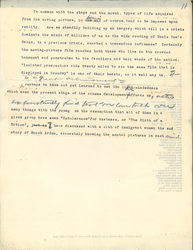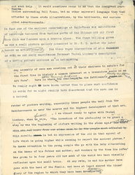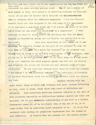 All over the country night after night there is presented first the News Weekly; second, the educational film, or "Scenic;" third, a two-reel comedy; and ↑forth and↓ last, the five-reel picture. That The news weekly reports the latest scandals but also something of national and international affairs; the educational film is popular for to the verge of pure entertainment but the "native" dives for pearls and gathers tea in the midst of the most enchanting landscape; the comedy is coarse and obvious but sometimes [illegible] very funny; the five reel story which in one way or another approximates the old French definition of a plot -- get a man up a tree, throw stones at him, get him down -- after all produces a sigh of relief from thousands of simple breasts as the hero's feet touch the earth. [page 11]
