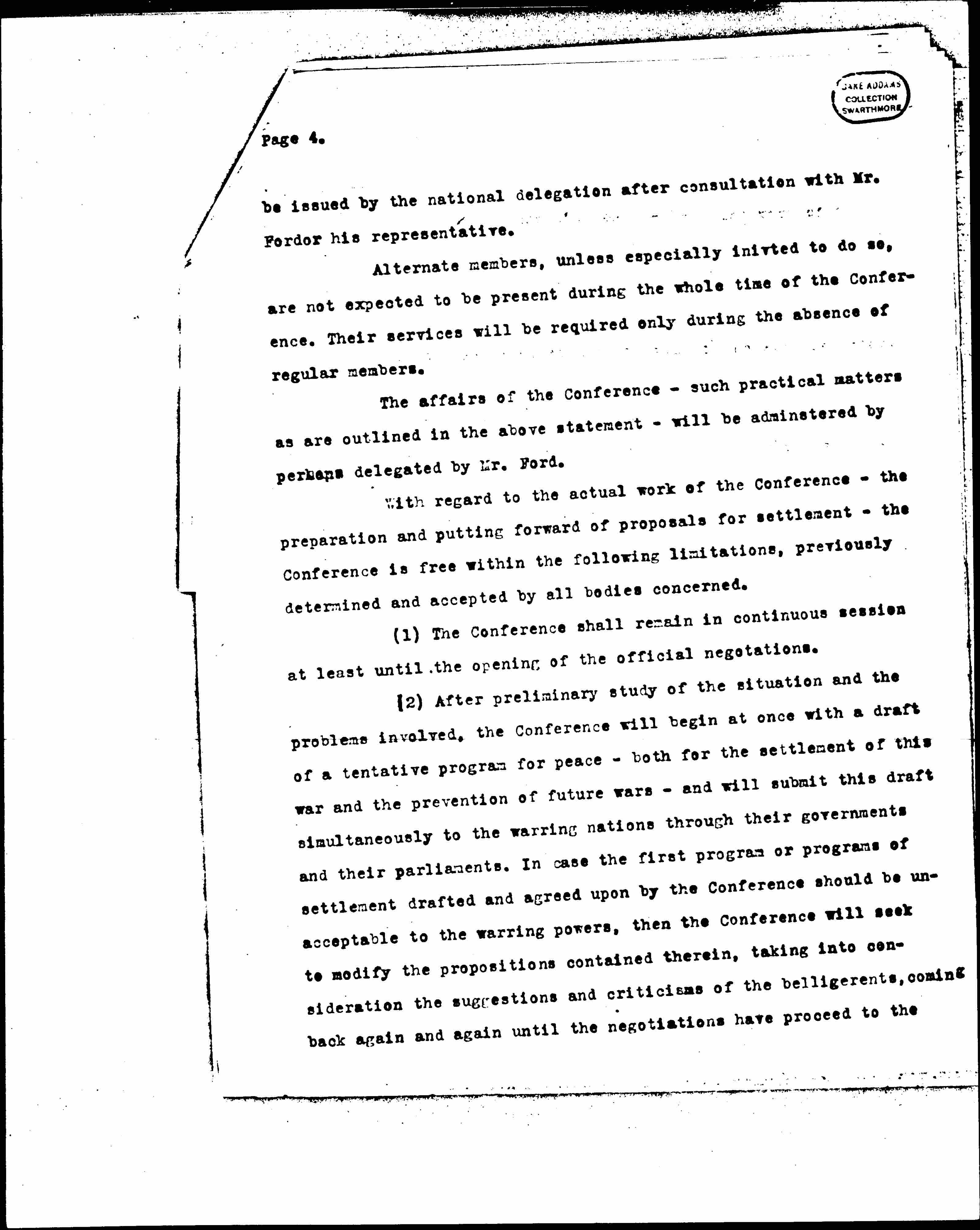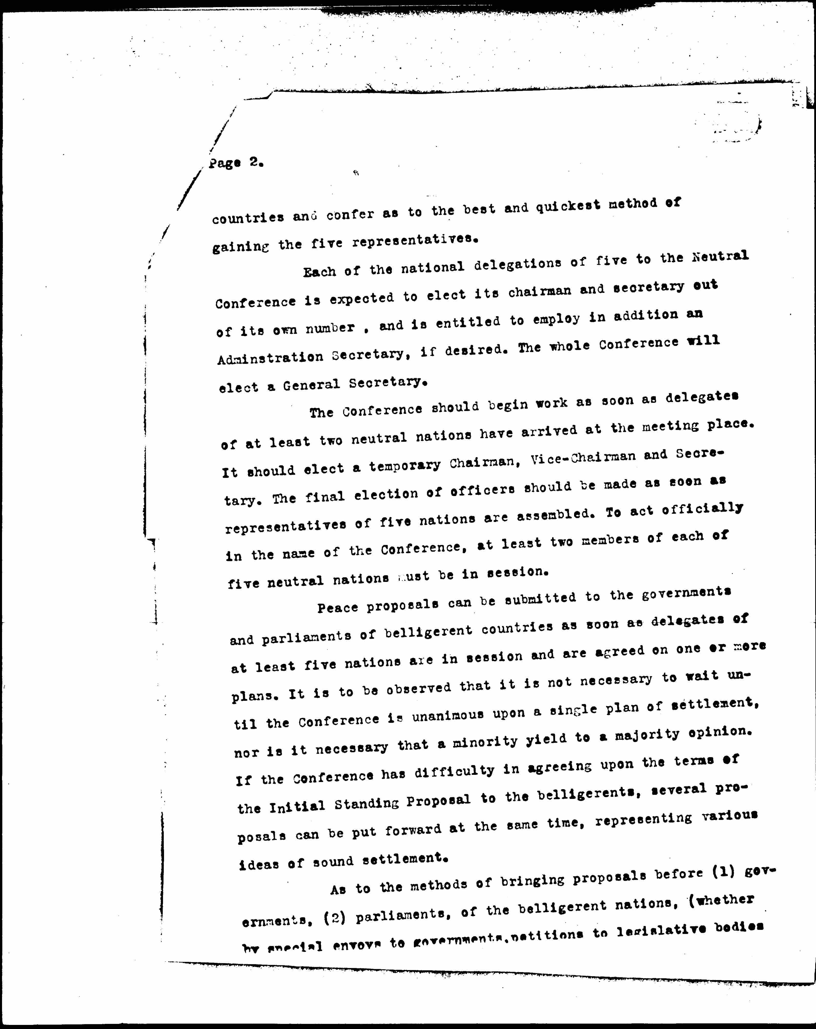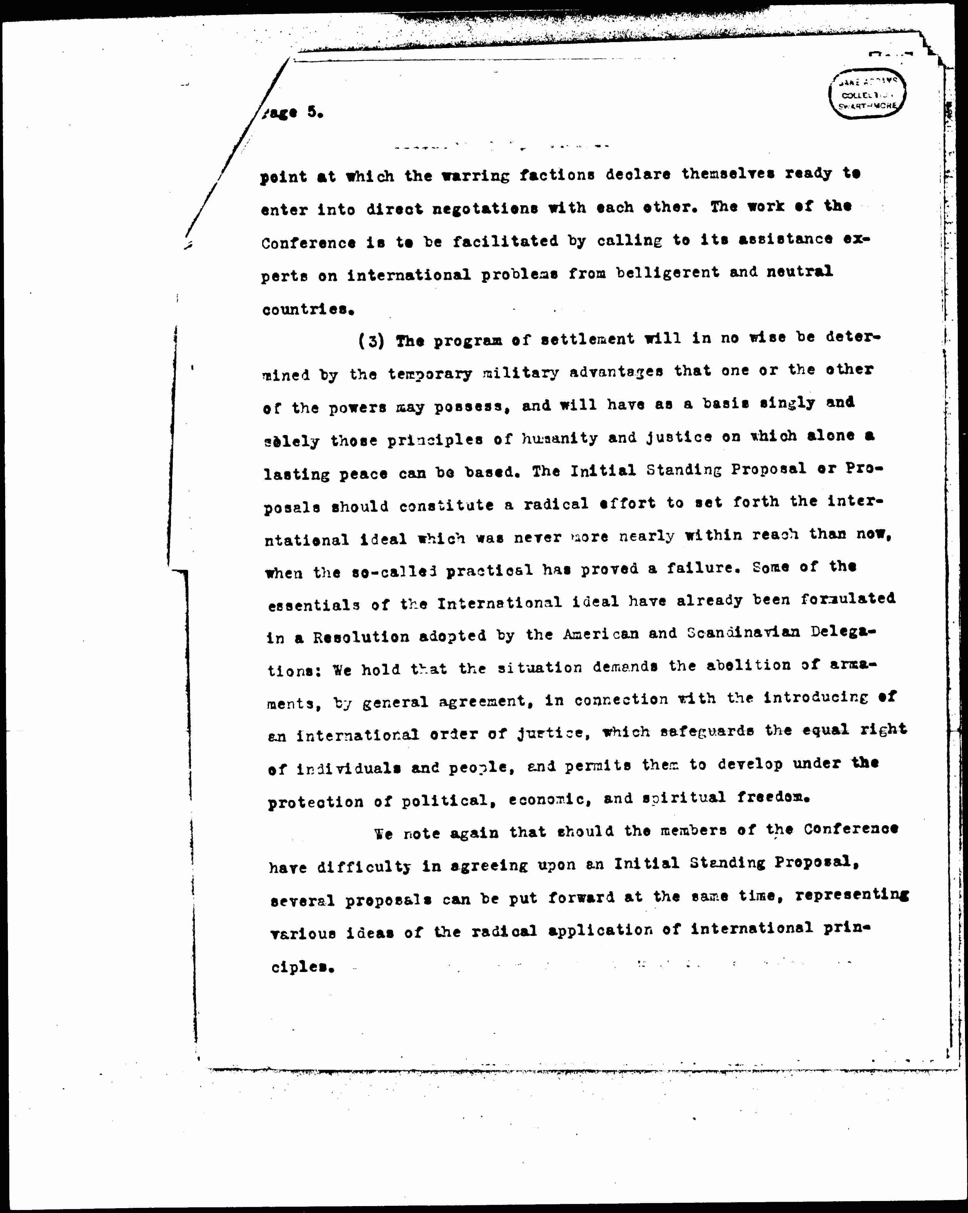 (2) After preliminary study of the situation and the problems involved, the Conference will begin at once with a draft of a tentative program for peace -- both for the settlement of this war and the prevention of future wars -- and will submit this draft simultaneously to the warring nations through their governments and their parliaments. In case the first program or programs of settlement drafted and agreed upon by the Conference should be unacceptable to the warring powers, then the Conference will seek to modify the propositions contained therein, taking into consideration the suggestions and criticisms of the belligerents, coming back again and again until the negotiations have [proceeded] to the [page 5] point at which the warring factions declare themselves ready to enter into direct negotiations with each other. The work of the Conference is to be facilitated by calling to its assistance experts on international problems from belligerent and neutral countries.