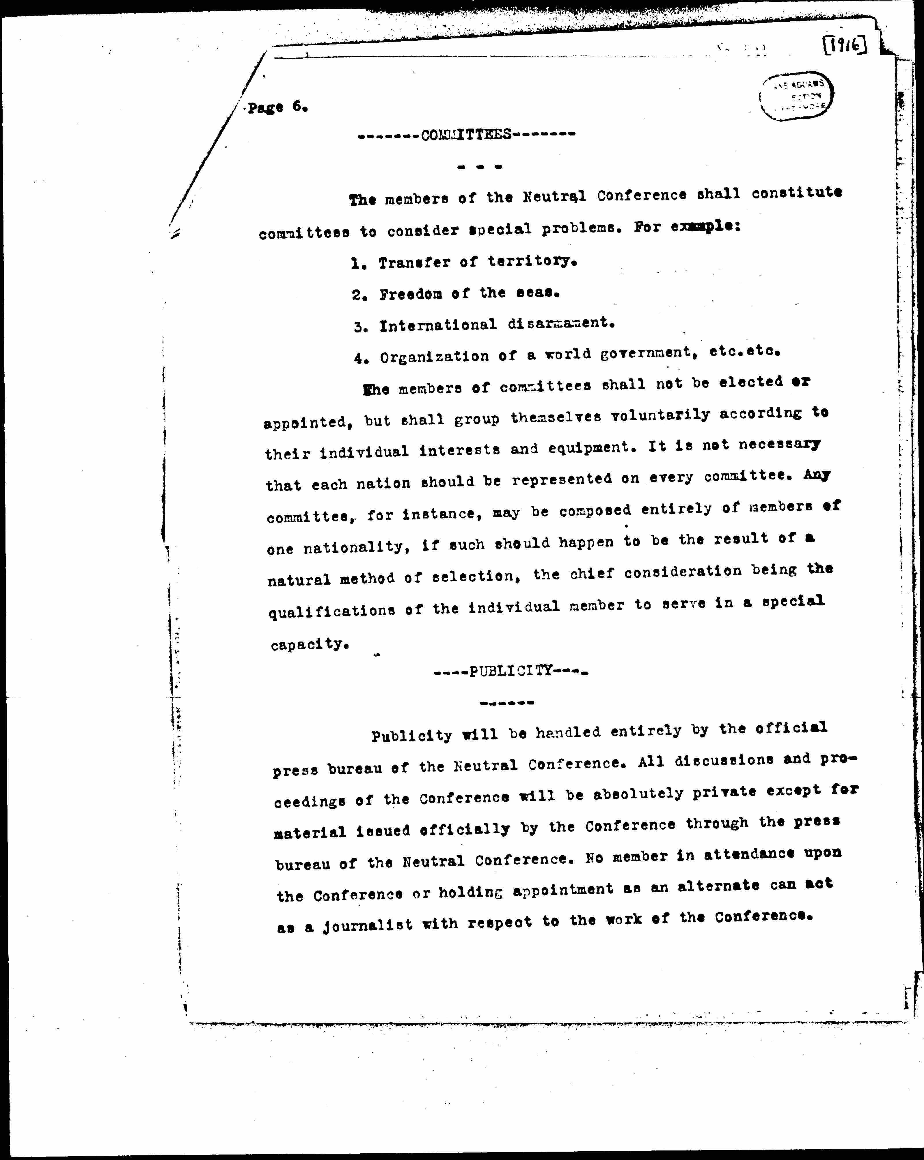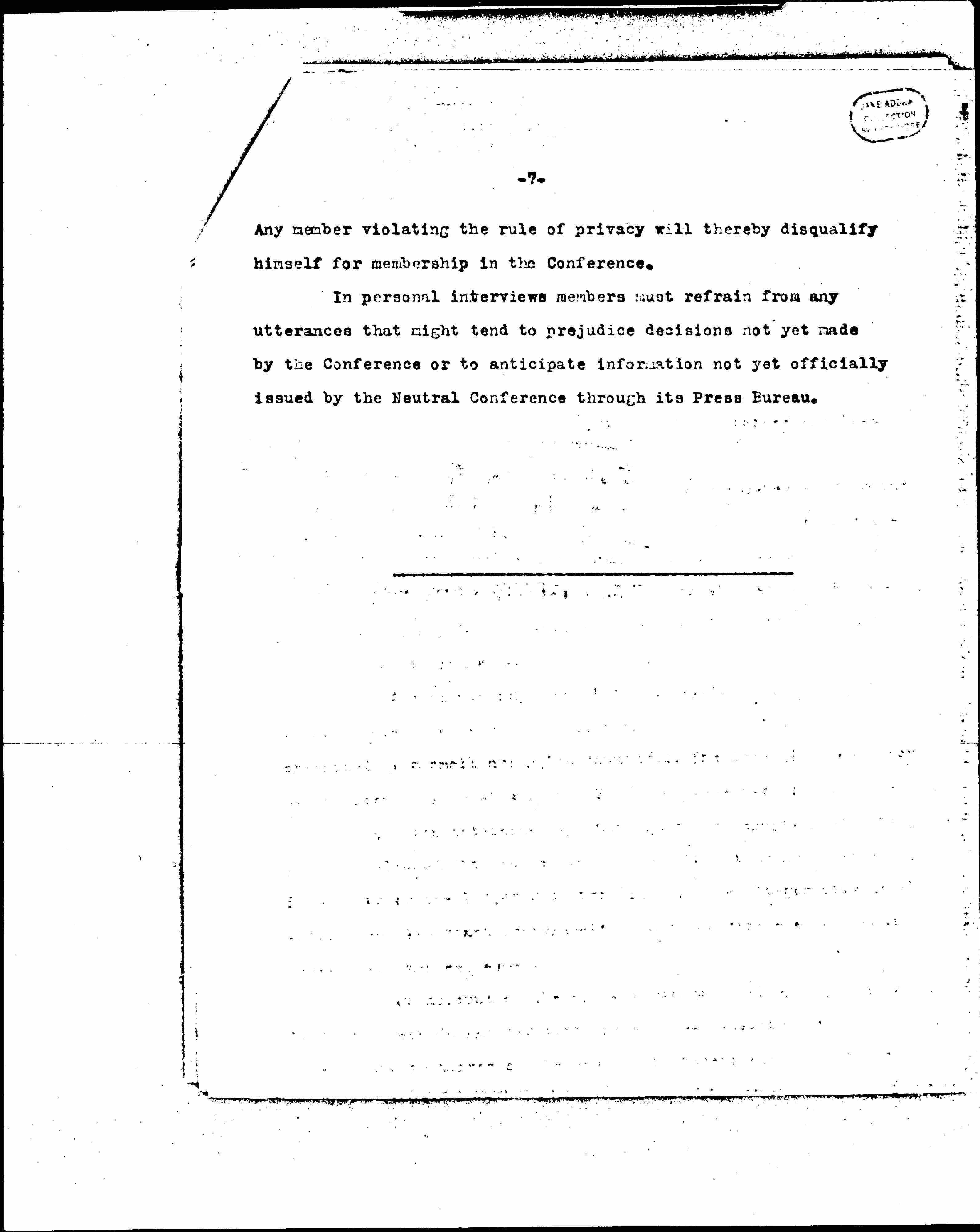 Publicity will be handled entirely by the official press bureau of the Neutral Conference. All discussions and proceedings of the Conference will be absolutely private except for material issued officially by the Conference through the press bureau of the Neutral Conference. No member in attendance upon the Conference or holding appointment as an alternate can act as a journalist with respect to the work of the Conference. [page 7] Any member violating the rule of privacy will thereby disqualify himself for membership in the Conference.