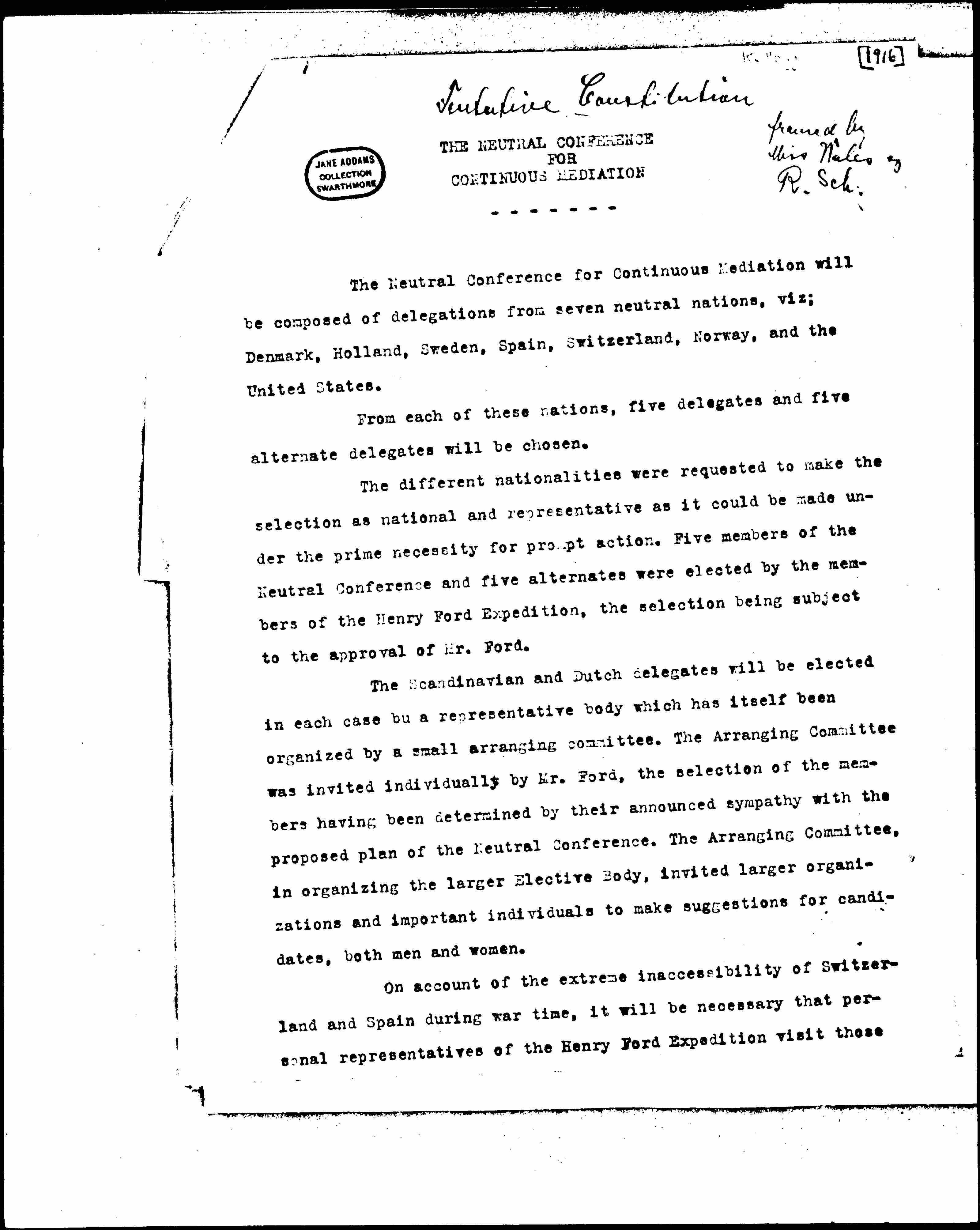 The Scandinavian and Dutch delegates will be elected in each case by a representative body which has itself been organized by a small arranging committee. The Arranging Committee was invited individually by Mr. Ford, the selection of the members having been determined by their announced sympathy with the proposed plan of the Neutral Conference. The Arranging Committee, in organizing the larger Elective Body, invited larger organizations and important individuals to make suggestions for candidates, both men and women.