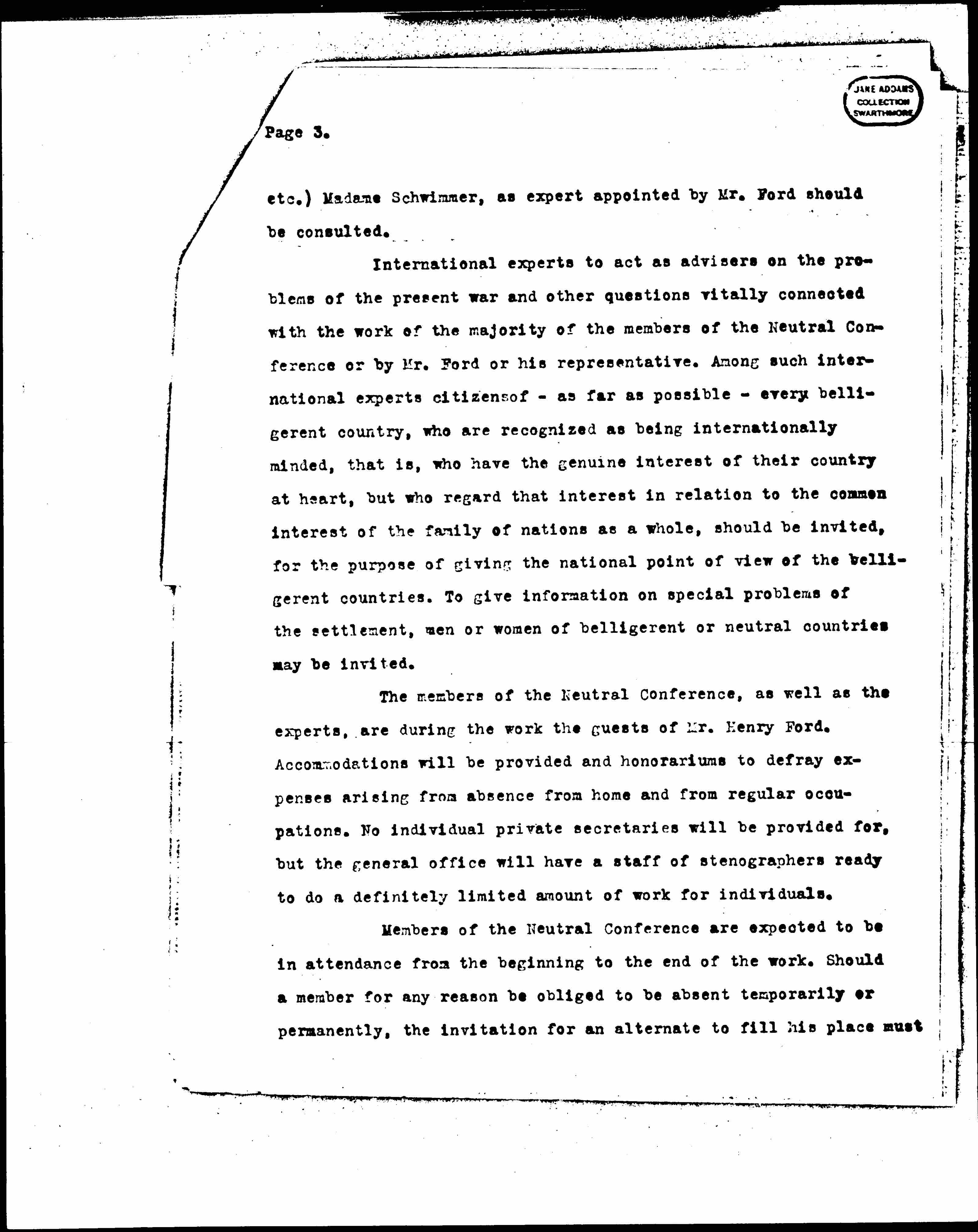 The members of the Neutral Conference, as well as the experts, are during the work the guests of Mr. Henry Ford. Accommodations will be provided and honorariums to defray expenses arising from absence from home and from regular occupations. No individual private secretaries will be provided for, but the general office will have a staff of stenographers ready to do a definitely limited amount of work for individuals.