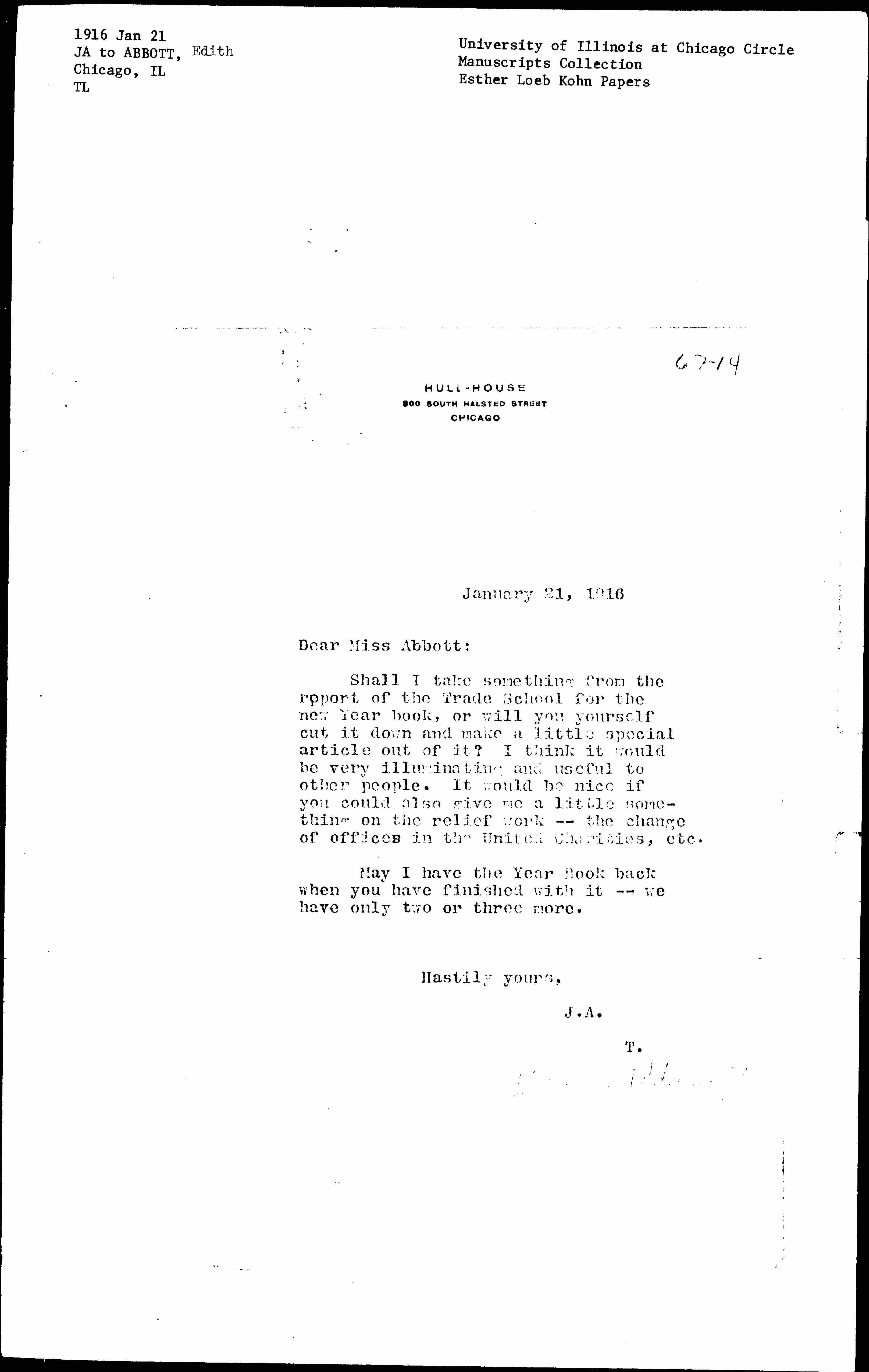 Shall I take something from the report of the Trade School for the new Year book, or will you yourself cut it down and make a little special article out of it? I think it would be very illuminating and useful to other people. It would be nice if you could also give me a little something on the relief work -- the change of offices in the United Charities, etc.