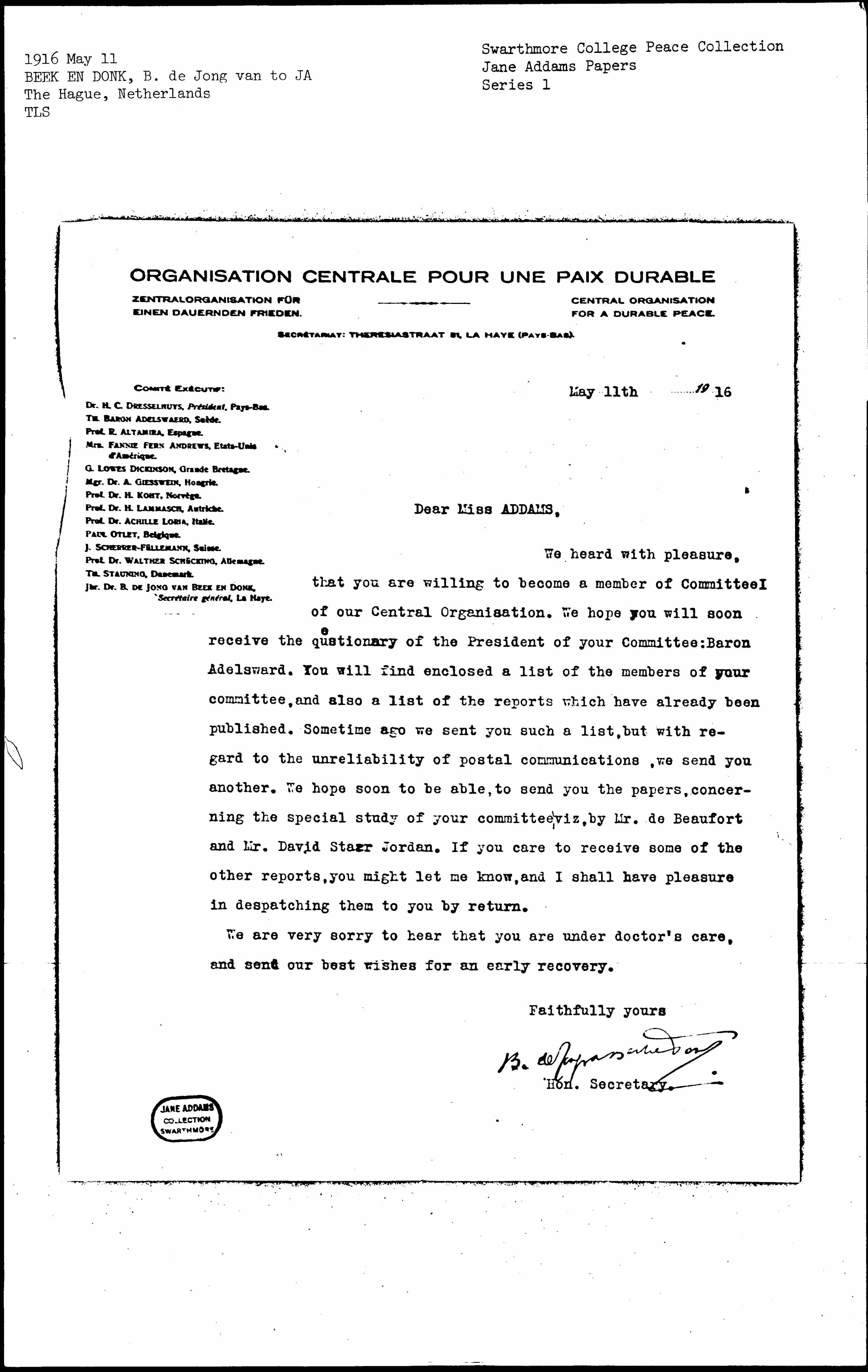 We heard with pleasure, that you are willing to become a member of Committee of our Central [Organization]. We hope you will soon receive the questionary of the President of your Committee: Baron [d'Adelsward]. You will find enclosed a list of the members of your committee, and also a list of the reports which have already been published. Sometime ago we sent you such a list, but with regard to the unreliability of postal communications, we send you another. We hope soon to be able, to send you the papers, concerning the special study of your committee viz, by Mr. de Beaufort and Mr. David Starr Jordan. If you care to receive some of the other reports, you might let me know, and I shall have pleasure in [dispatching] them to you by return.