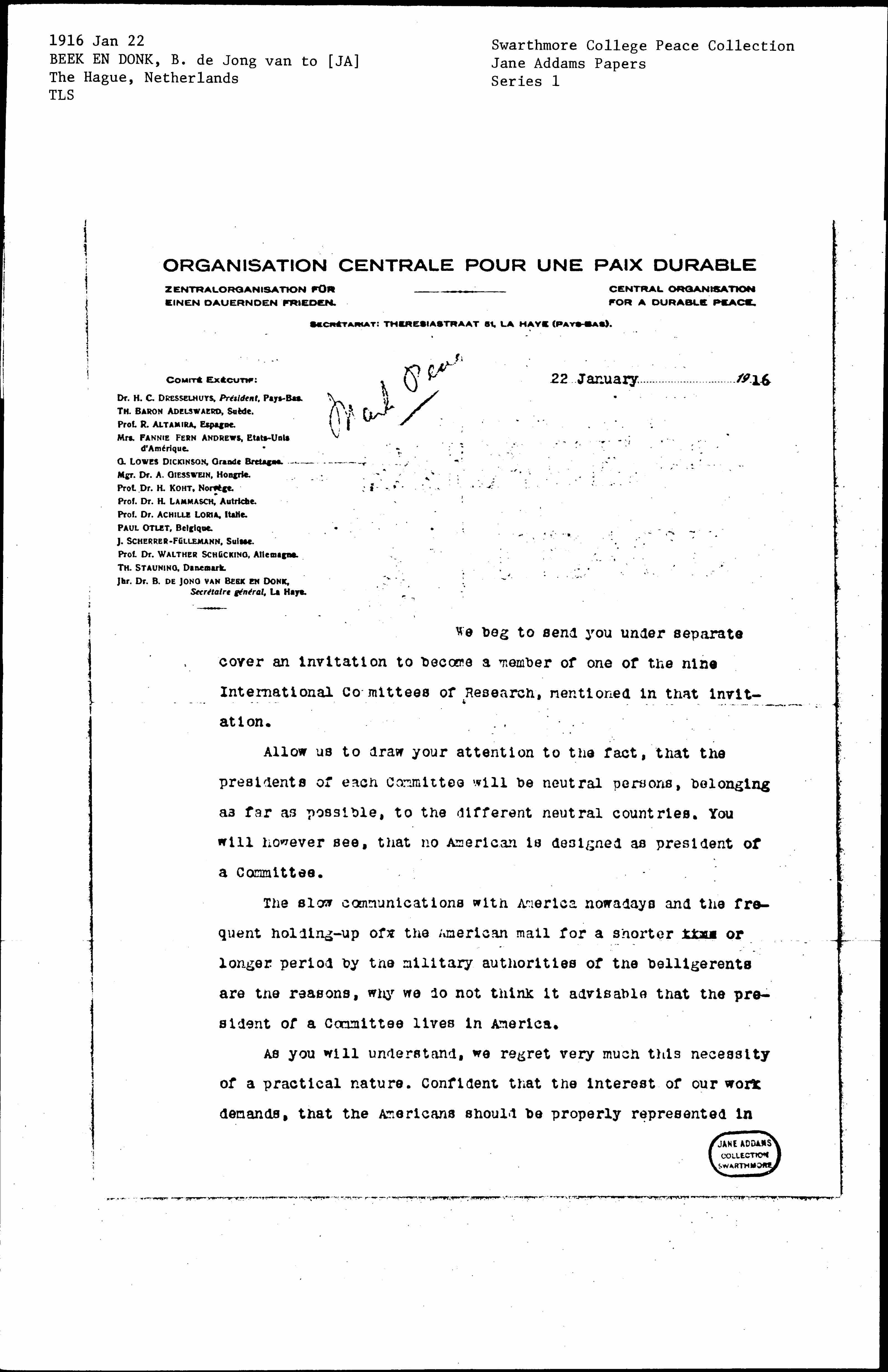 The slow communications with America nowadays and the frequent holding-up of the American mail for shorter [illegible] or longer period by the military authorities of the belligerents are the reasons, why we do not think it advisable that the president of a Committee lives in America.