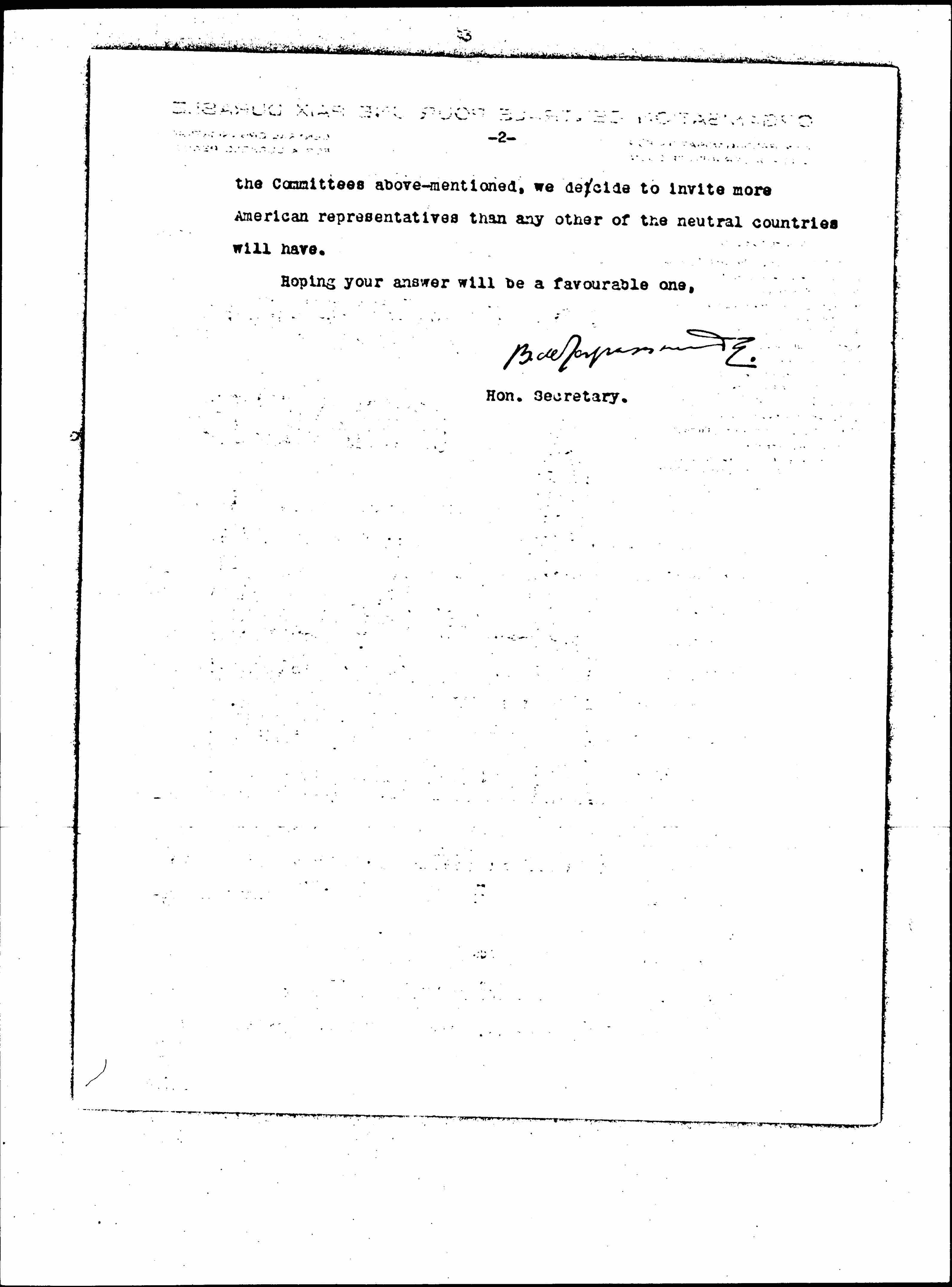 As you will understand, we regret very much this necessity of a practical nature. Confident that the interest of our work demands, that the Americans should be properly represented in [page 2] the Committees above-mentioned, we decide to invite more American representatives than any other of the neutral countries will have.