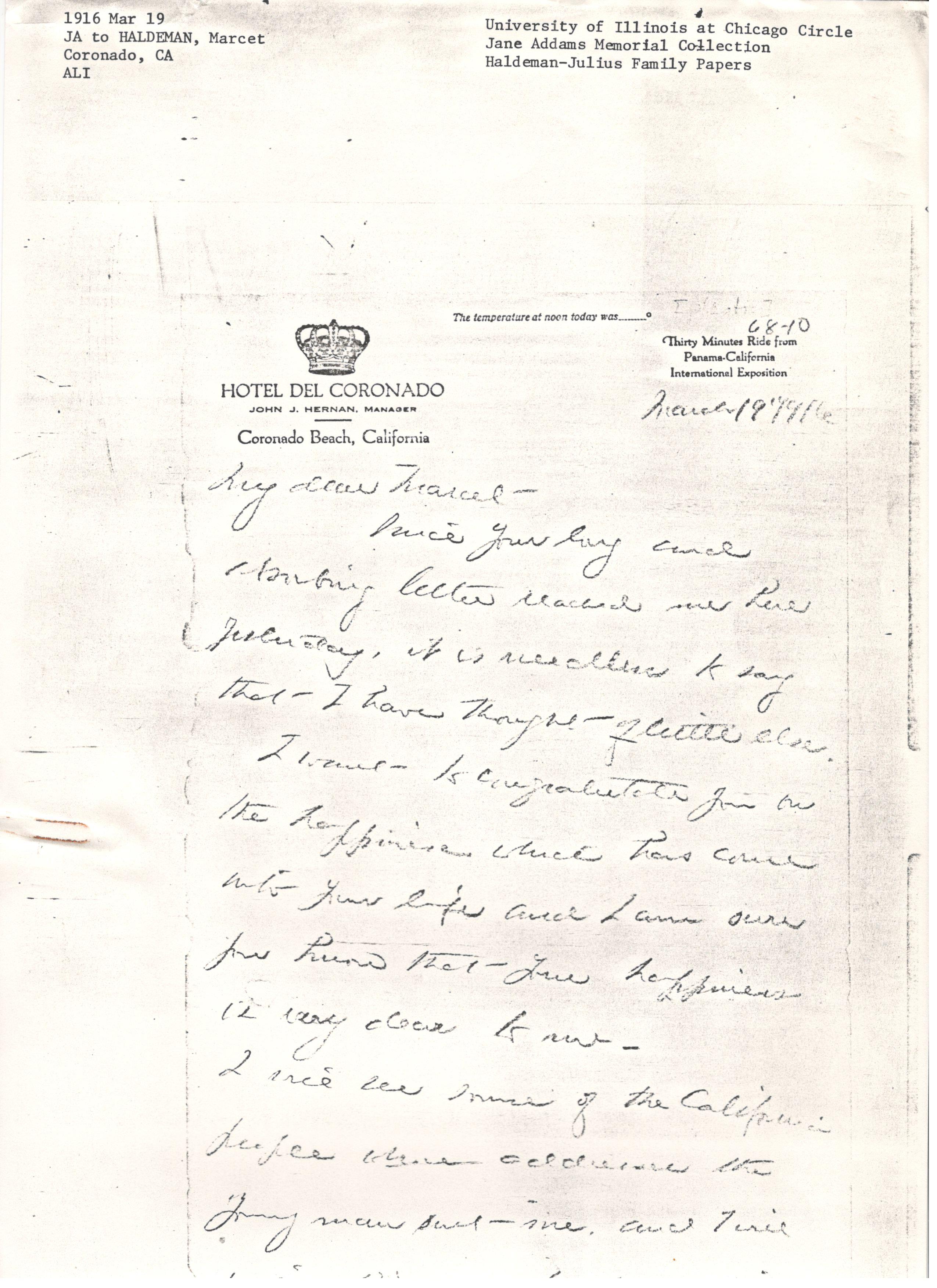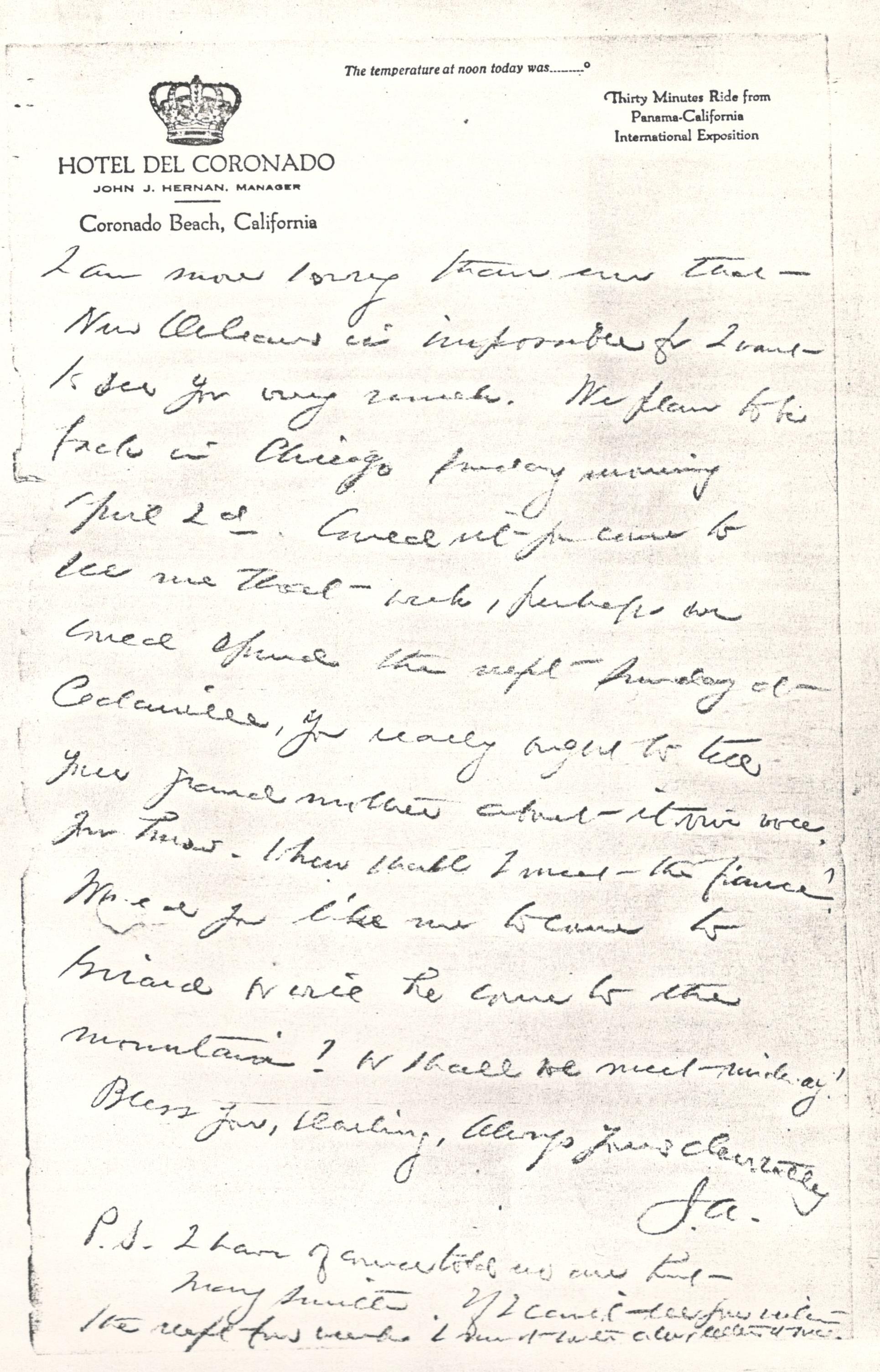 I will see some of the California people where addresses the young man sent me, and I will [missing line of text]. [page 2] I am more sorry than ever that New Orleans is impossible for I want to see you very much. We plan to be back in Chicago Sunday morning April 2d. Couldn't you come to see me that week, perhaps we could spend the next Sunday at Cedarville. You really ought to tell your grandmother about it viva voce, you know. When shall I meet the fiancé? Would you like me to come to Girard or will he came to the mountain? Or shall we meet midway?