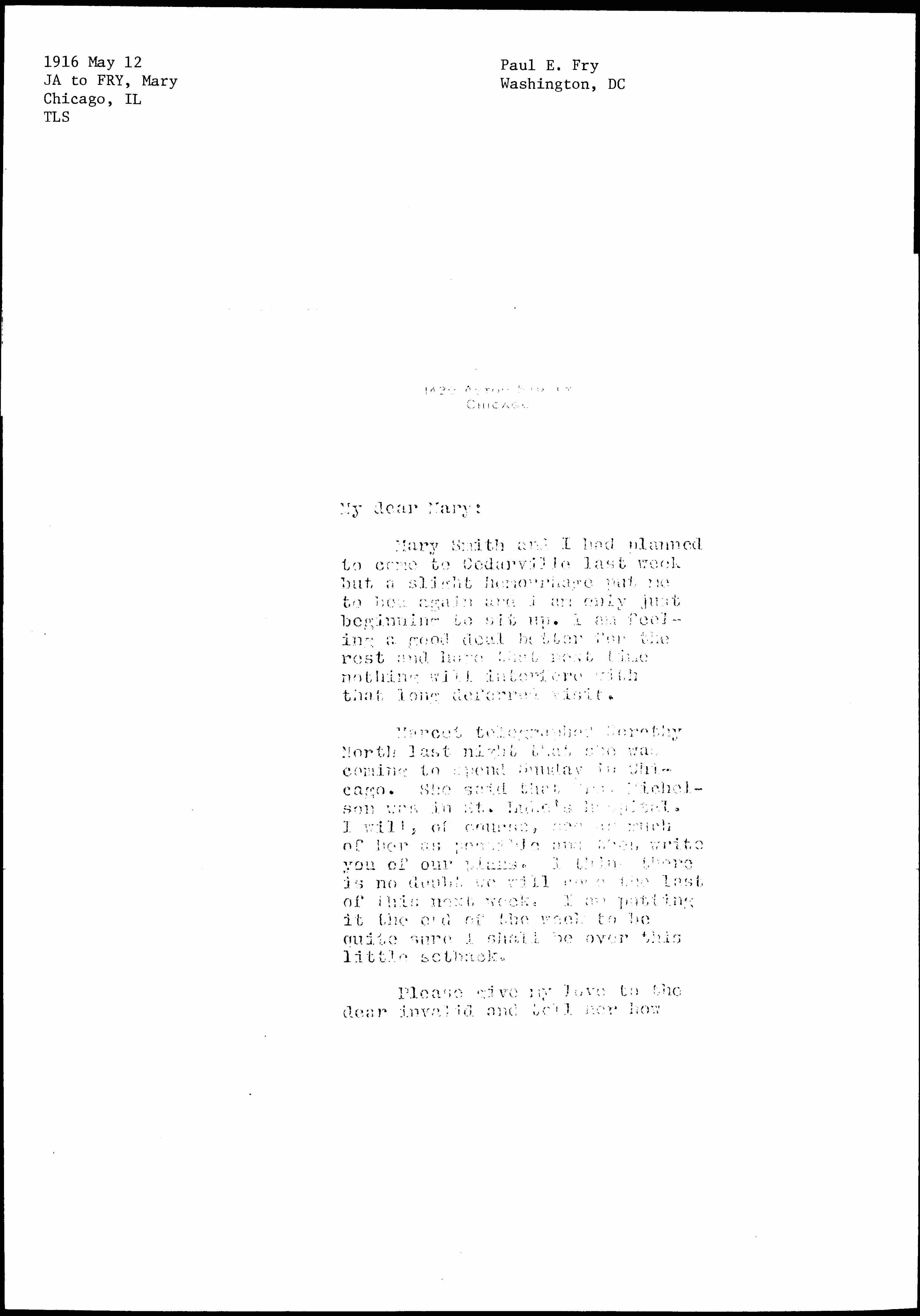 Mary Smith and I had planned to come to Cedarville last week but a slight hemorrhage put me to bed again and I am only just beginning to sit up. I am feeling a good deal better for the rest and hope that next time nothing will interfere with that long deferred visit.
