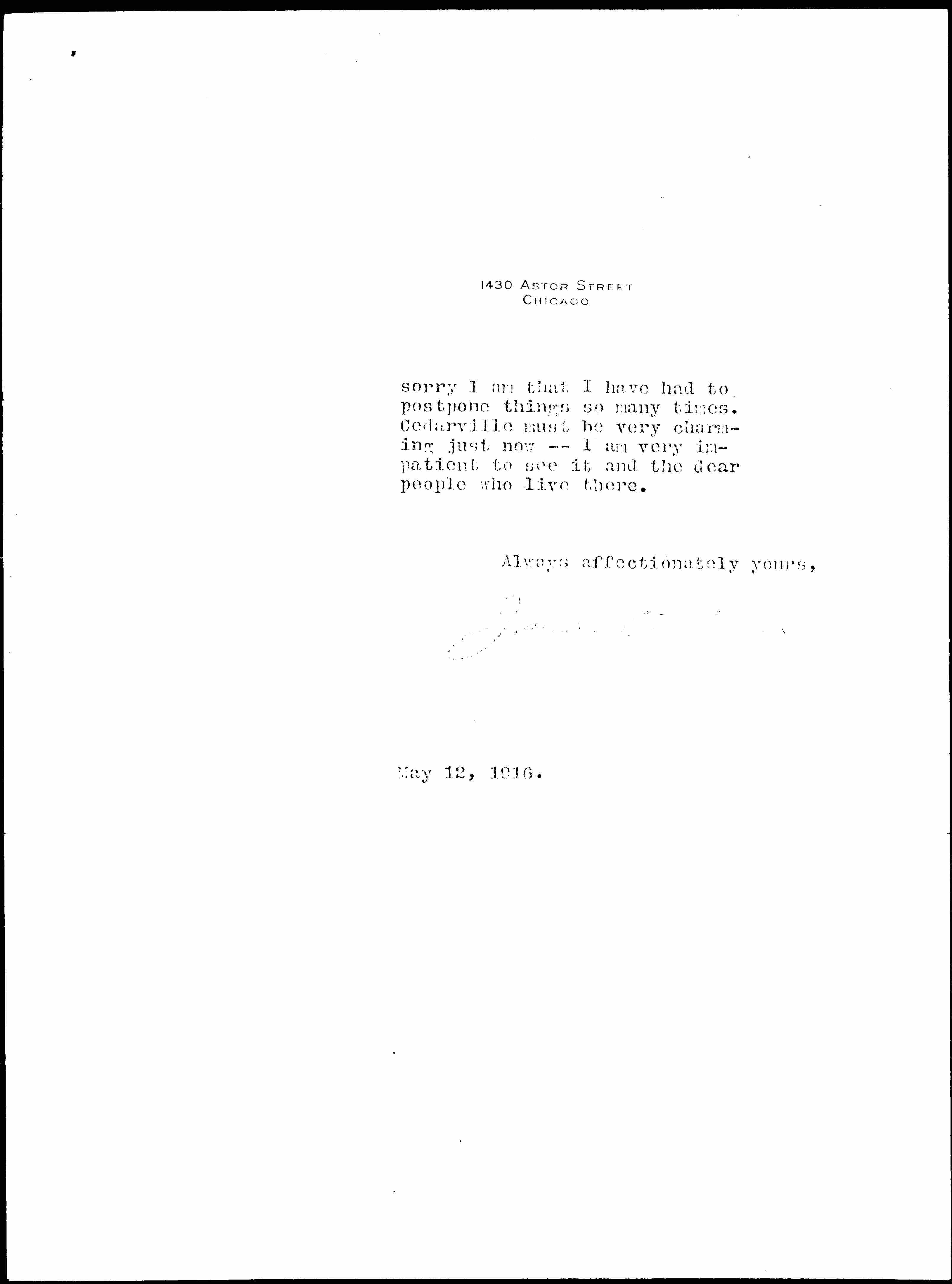 Please give my love to the dear invalid and tell her how [page 2] sorry I am that I have had to postpone things so many times. Cedarville must be very charming just now -- I am very impatient to see it and the dear people who live there.
