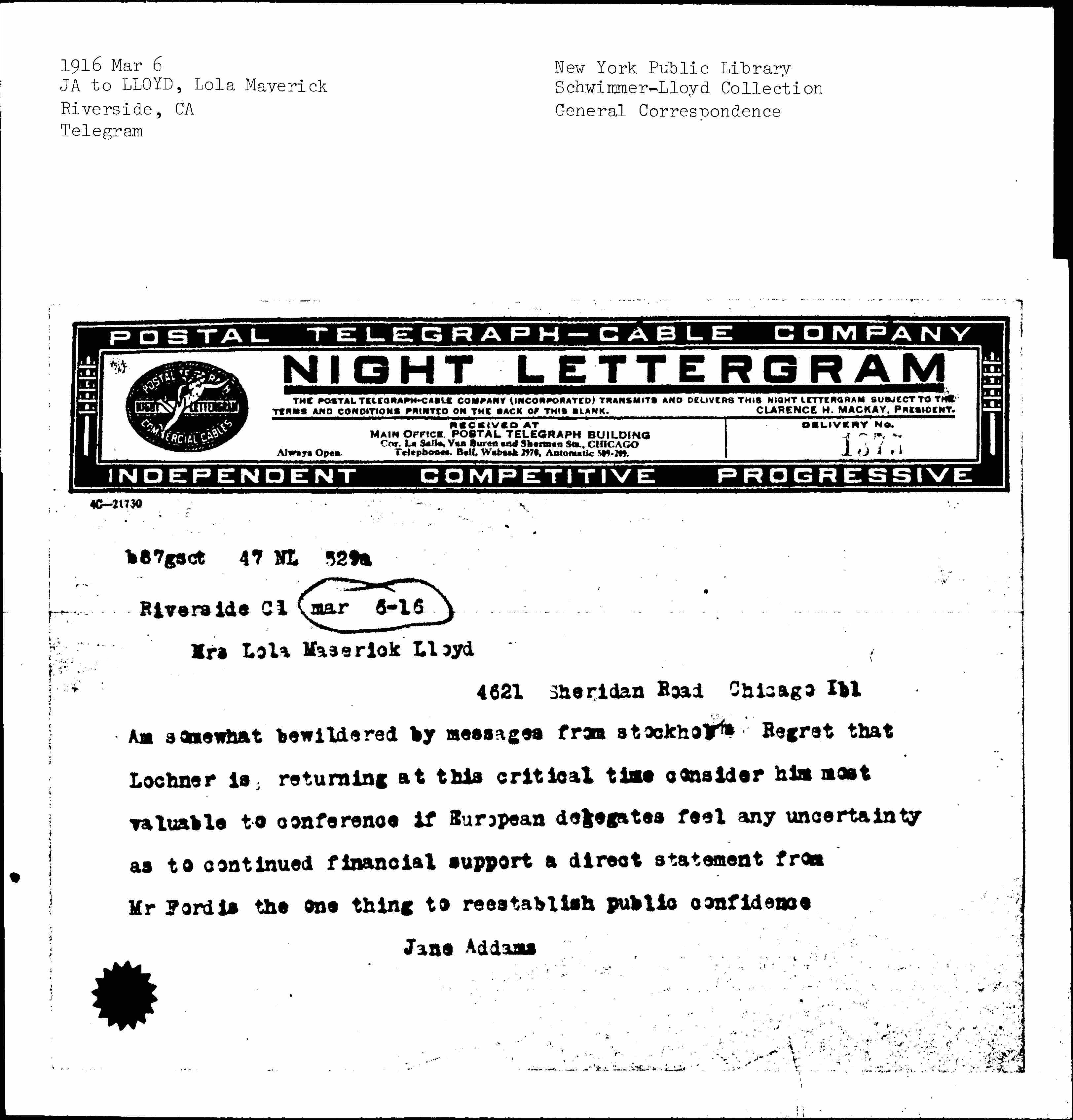 Am somewhat bewildered by messages from Stockholm. Regret that Lochner is returning at this critical time consider him most valuable to conference if European delegates feel any uncertainty as to continued financial support a direct statement from Mr Ford is the one thing to reestablish public confidence