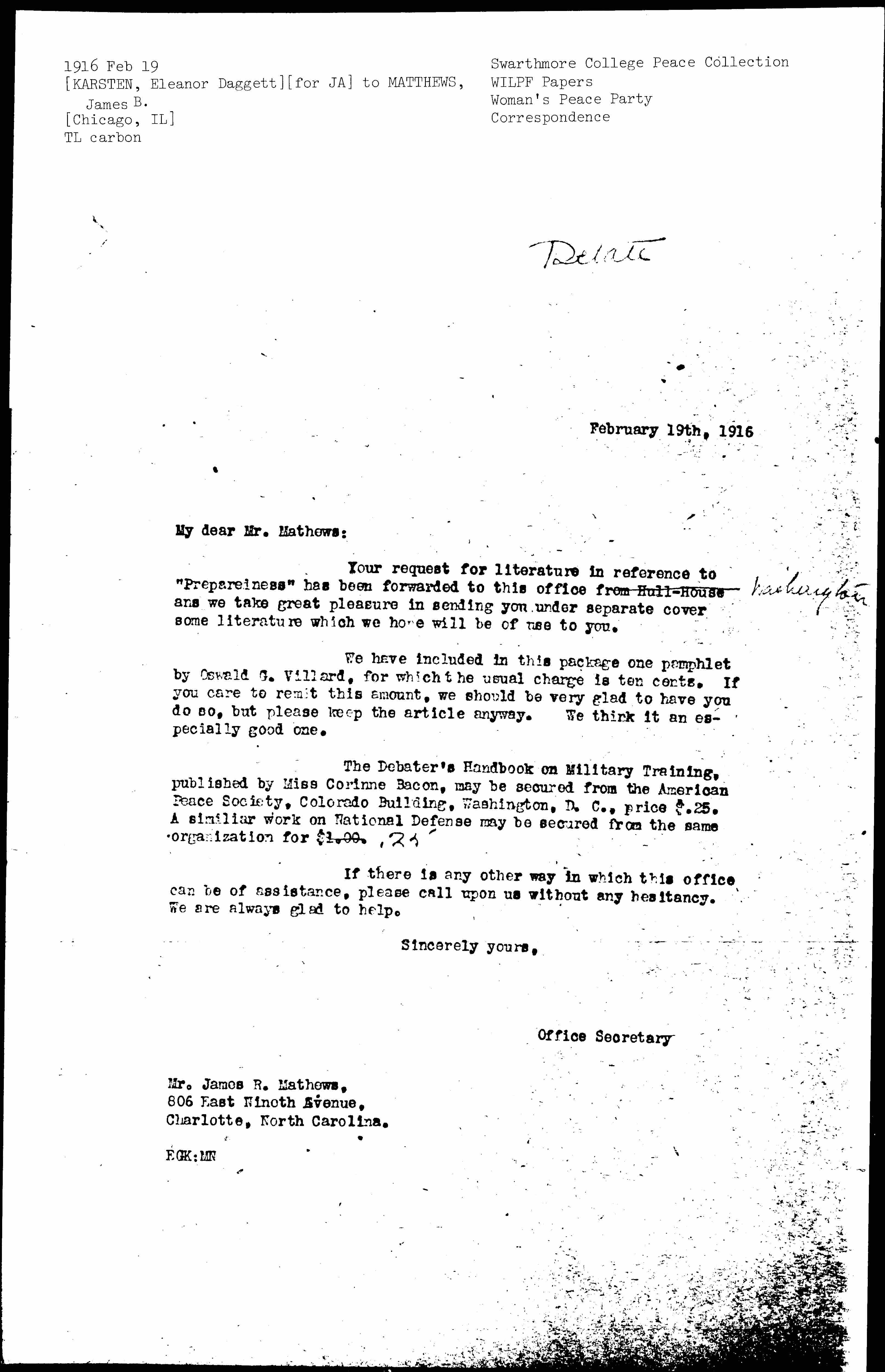 Your request for literature in reference to "Preparedness" has been forwarded to this office from Hull-House <Washington> and we take great pleasure in sending you under separate cover some literature which we hope will be of use to you.
