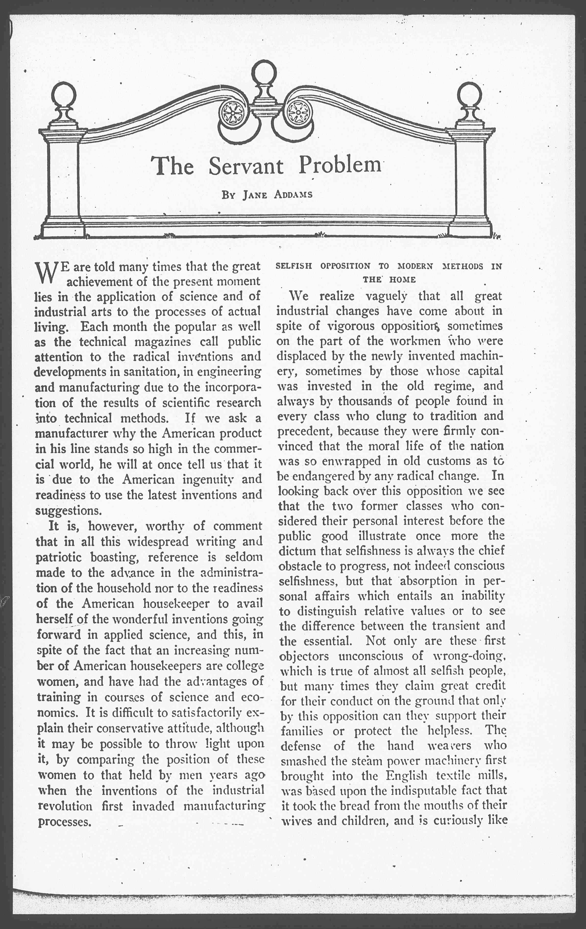 We realize vaguely that all great industrial changes have come about in spite of vigorous opposition sometimes on the part of the workmen who were displaced by the newly invented machinery, sometimes by those whose capital was invested in the old regime, and always by thousands of people found in every class who clung to tradition and precedent, because they were firmly convinced that the moral life of the nation was so enwrapped in old customs as to be endangered by any radical change. In looking back over this opposition we see that the two former classes who considered their personal interest before the public good illustrate once more the dictum that selfishness is always the chief obstacle to progress, not indeed conscious selfishness, but that absorption in personal affairs which entail an inability to distinguish relative values or to see the difference between the transient and the essential. Not only are these first objectors unconscious of wrong-doing, which is true of almost all selfish people, but many times they claim great credit for their conduct on the ground that only by this opposition can they support their families or protect the helpless. The defense of the hand weavers who smashed the steam power machinery first brought into the English textile mills, was based upon the indisputable fact that it took the bread from the mouths of their wives and children, and is curiously like [page 2] the argument of the street car company, resisting a loss of franchise based upon a change of motive power, on the ground of protecting the investments of widows and orphans, or the argument of those who lose by the larger organizations of capital into combinations and trusts, and who cite the sad plight of the displaced man and make no mention of the advantage accruing to the general consumer.