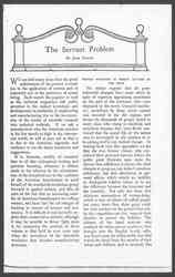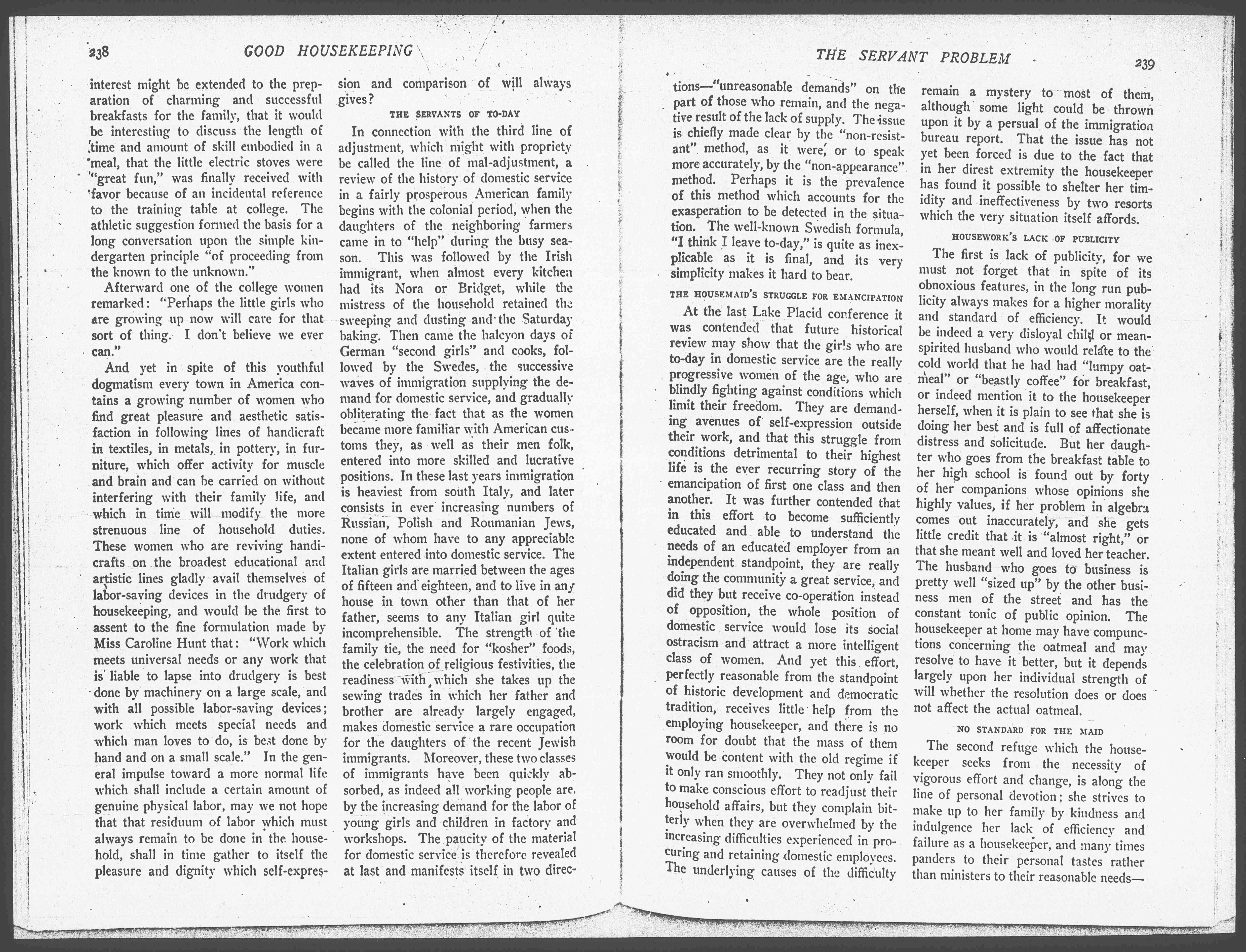 At the last Lake Placid conference it was contended that future historical review may show that the girls who are today in domestic service are the really progressive women of the age, who are blindly fighting against conditions which limit their freedom. They are demanding avenues of self-expression outside their work, and that this struggle from conditions detrimental to their highest life is the ever recurring story of the emancipation of first one class and then another. It was further contended that in this effort to become sufficiently educated and able to understand the needs of an educated employer from an independent standpoint, they are really doing the community a great service, and did they but receive cooperation instead of opposition, the whole position of domestic service would lose its social ostracism and attract a more intelligent class of women. And yet this effort, perfectly reasonable from the standpoint of historic development and democratic tradition, receives little help from the employing housekeeper, and there is no room for doubt that the mass of them would be content with the old regime if it only ran smoothly. They not only fail to make conscious effort to readjust their household affairs, but they complain bitterly when they are overwhelmed by the increasing difficulties experienced in procuring and retaining domestic employees. The underlying causes of the difficulty remain a mystery to most of them, although some light could be thrown upon it by a [perusal] of the immigration bureau report. That the issue has not yet been forced is due to the fact that in her direst extremity the housekeeper has found it possible to shelter her timidity and ineffectiveness by two resorts which the very situation itself affords.
