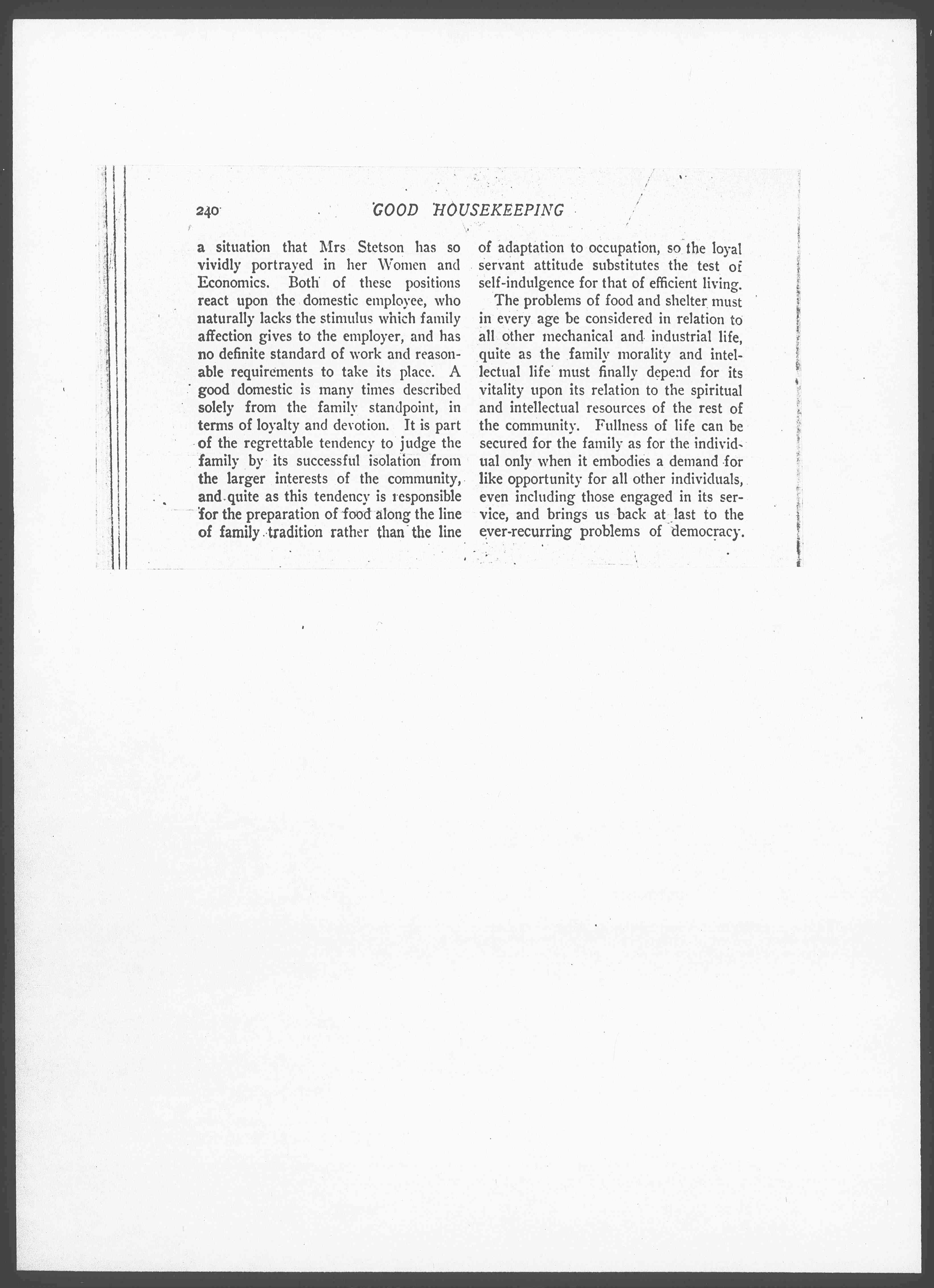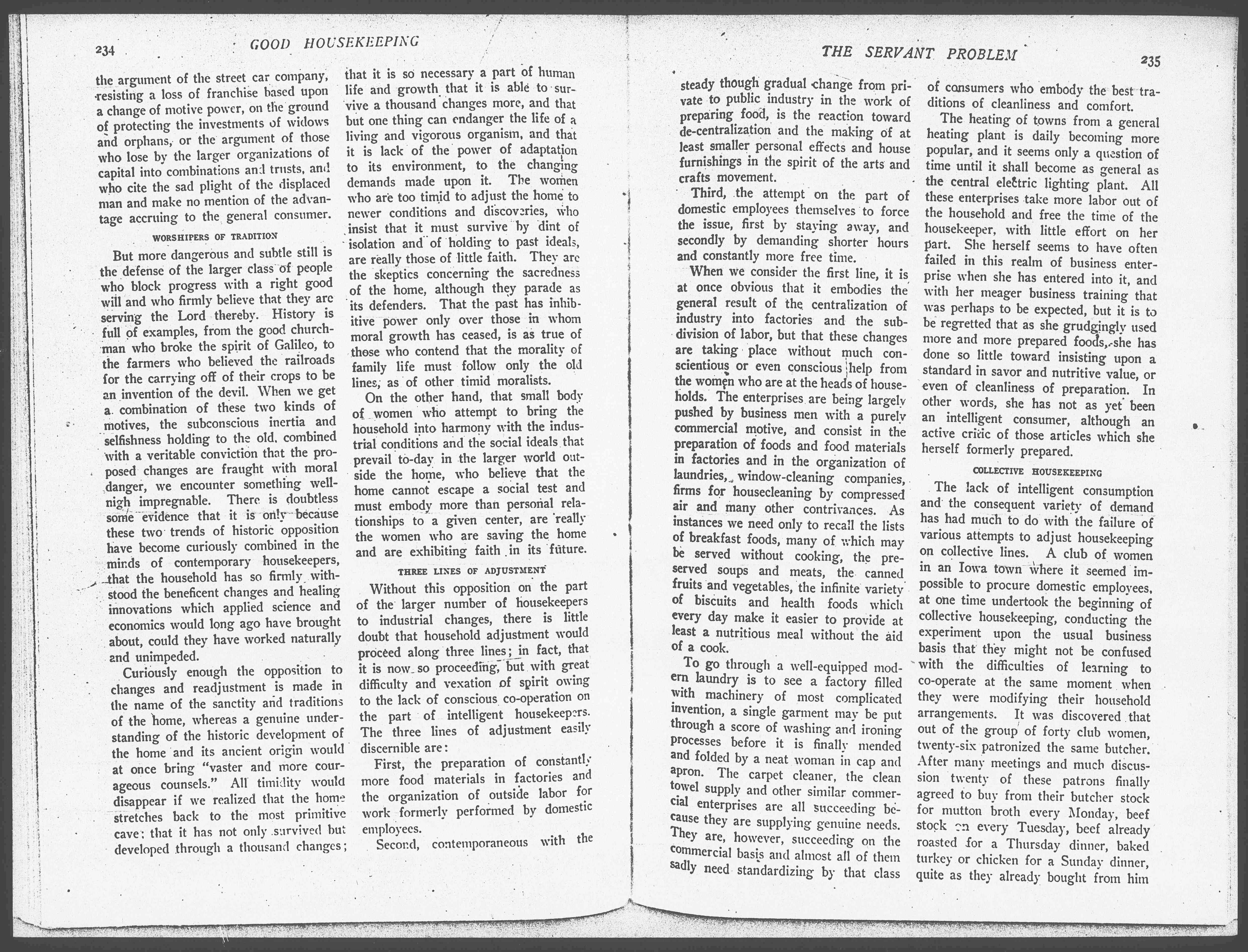 The second refuge which the housekeeper seeks from the necessity of vigorous effort and change, is along the line of personal devotion: she strives to make up to her family by kindness and indulgence her lack of efficiency and failure as a housekeeper, and many times panders to their personal tastes rather than ministers to their reasonable needs -– [page 8] a situation that Mrs Stetson has so vividly portrayed in her Women and Economics. Both of these positions react upon the domestic employee, who naturally lacks the stimulus which family affection gives to the employer, and has no definite standard of work and reasonable requirements to take its place. A good domestic is many times described solely from the family standpoint, in terms of loyalty and devotion. It is part of the regrettable tendency to judge the family by its successful isolation from the larger interests of the community, and quite as this tendency is responsible for the preparation of food along the line of family tradition rather than the line of adaption to occupation, so the loyal servant attitude substitutes the test of self-indulgence for that of efficient living.