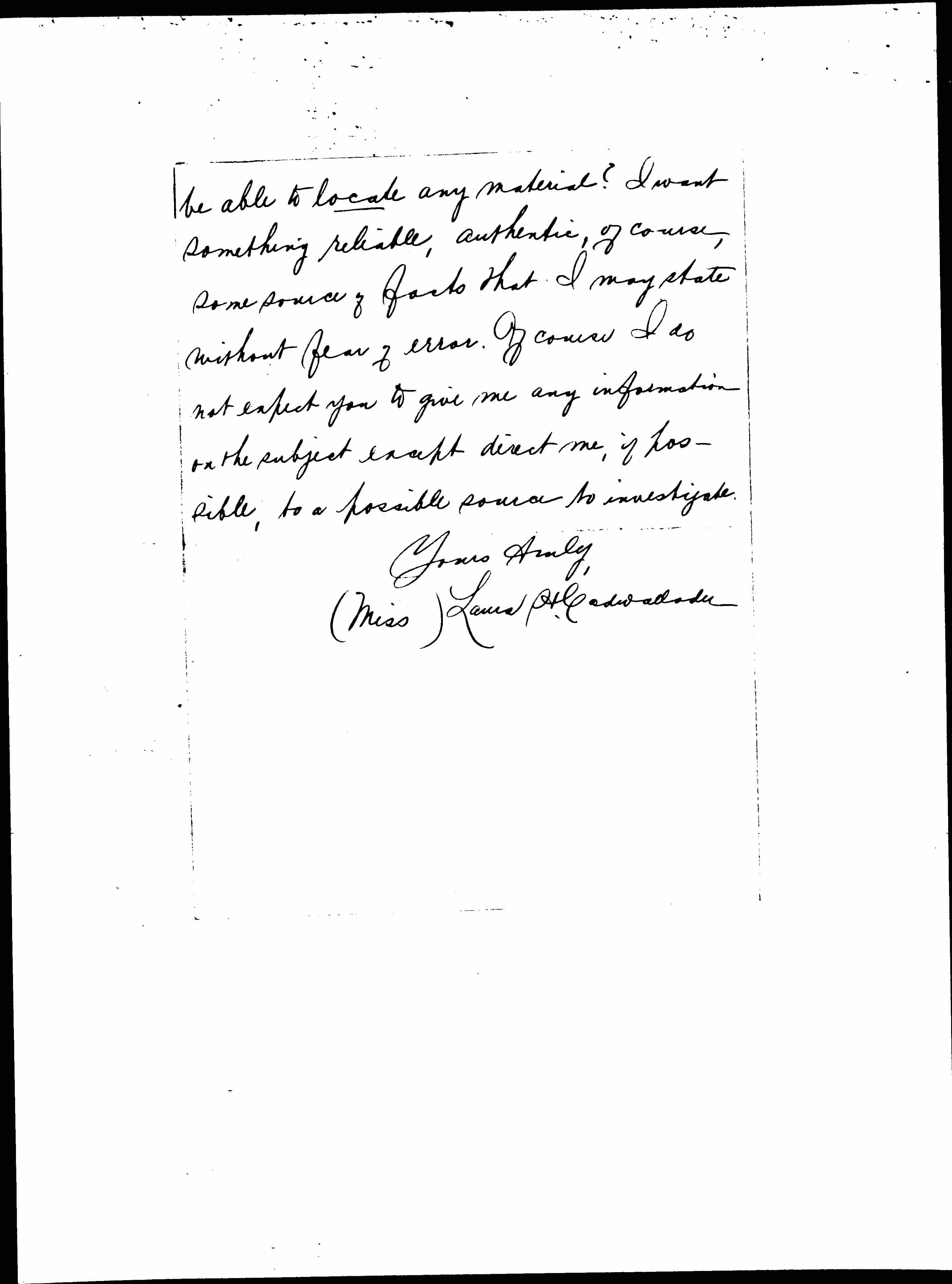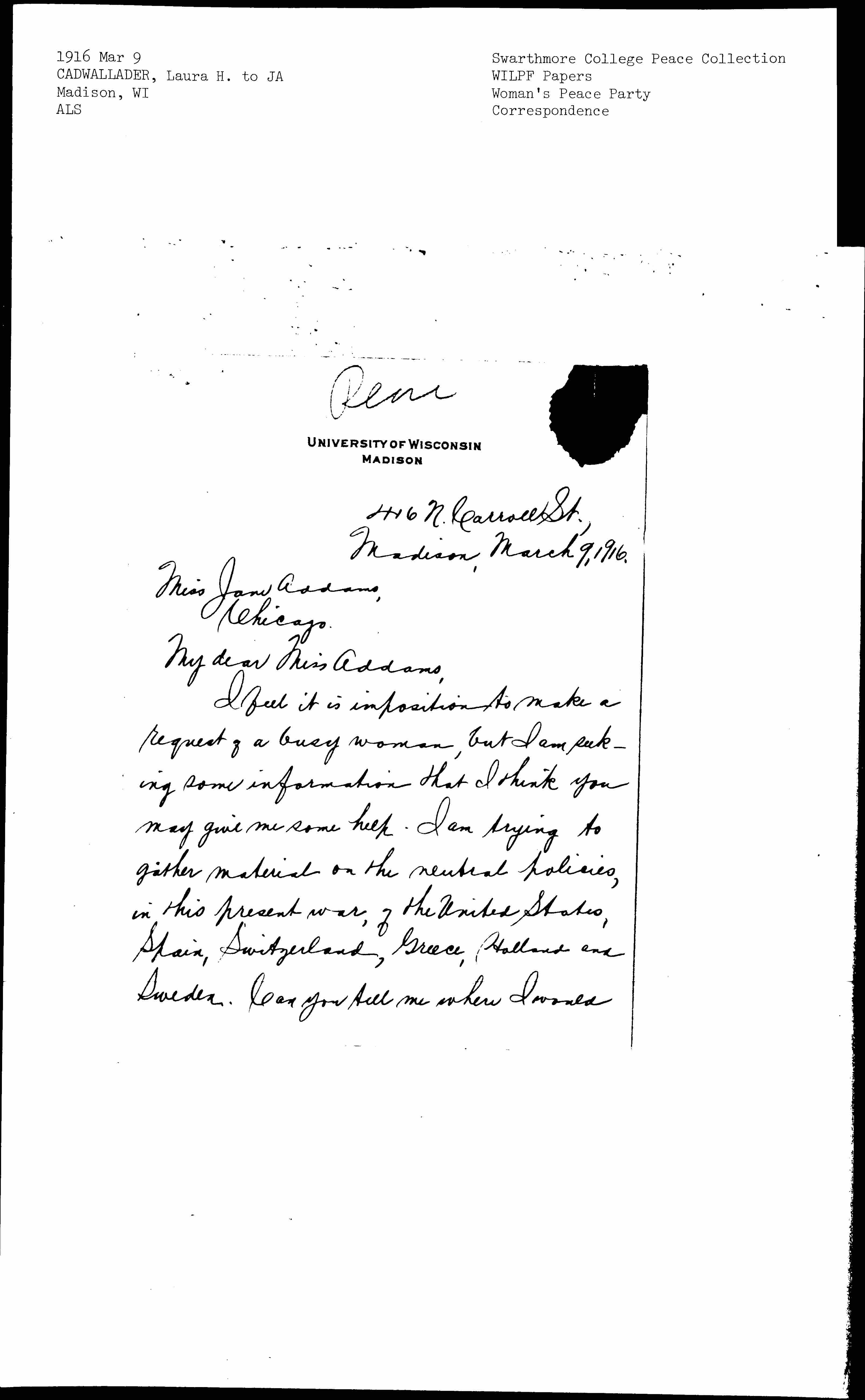 I feel it is imposition to make a request of a busy woman, but I am seeking some information that I think you may give me some help. I am trying to gather material on the neutral policies, in this present war, of the United States, Spain, Switzerland, Greece, Holland and Sweden. Can you tell me where I would [page 2] be able to locate any material? I want something reliable, authentic, of course, some source of facts that I may state without fear of error. Of course I do not expect you to give me any information on the subject except direct me, if possible, to a possible source to investigate.