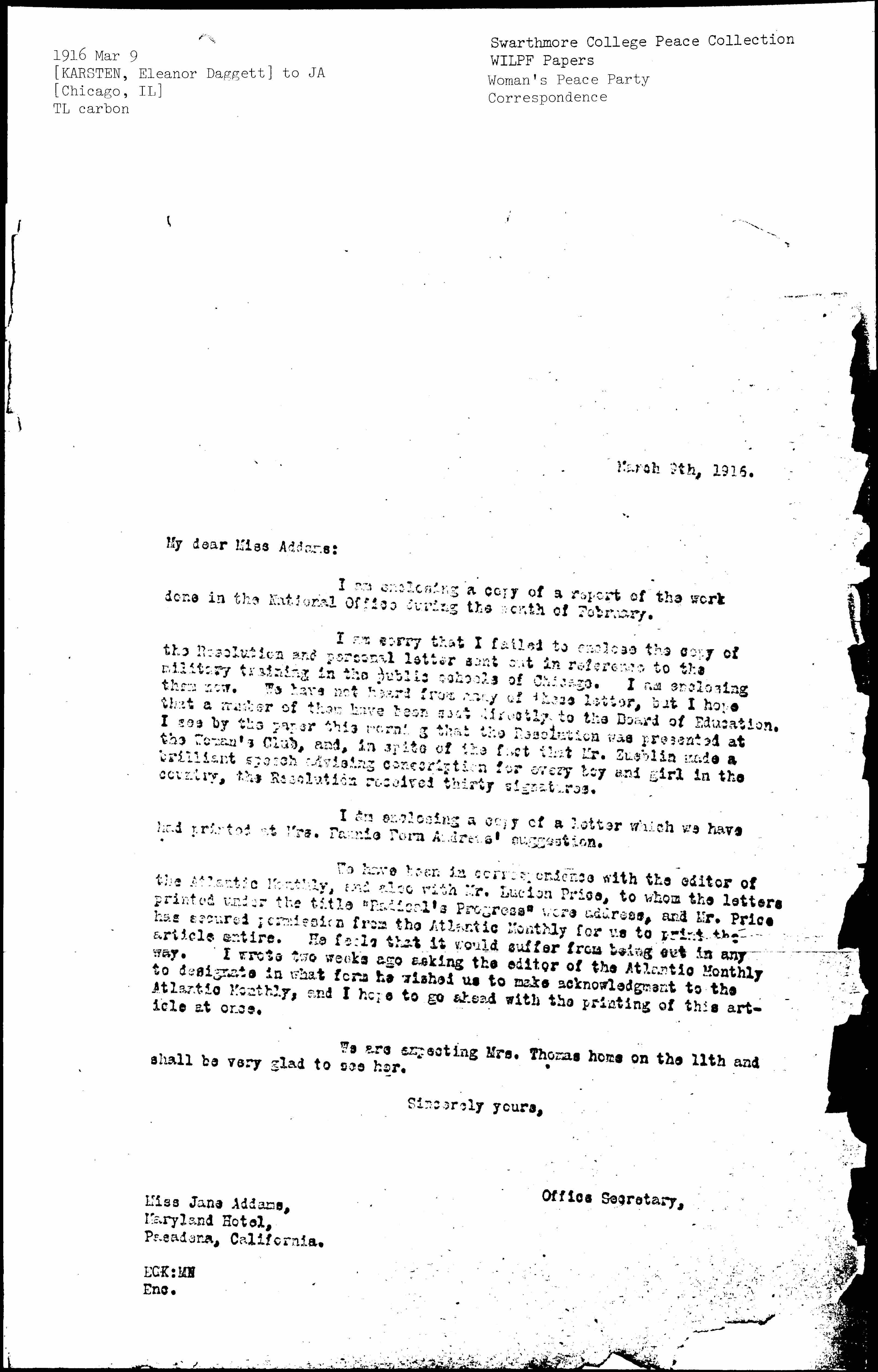 I am sorry that I failed to enclose the copy of the Resolution and personal letter sent out in reference to the military training in the public schools of Chicago. I am enclosing them now. We have not heard from many of these [letters], but I hope that a number of them have been sent directly to the Board of Education. I see by the paper this morning that the Resolution was presented at the Woman's Club, and, in spite of the fact that Mr. Zueblin made a brilliant speech advising conscription for every boy and girl in the country, the Resolution received thirty signatures.