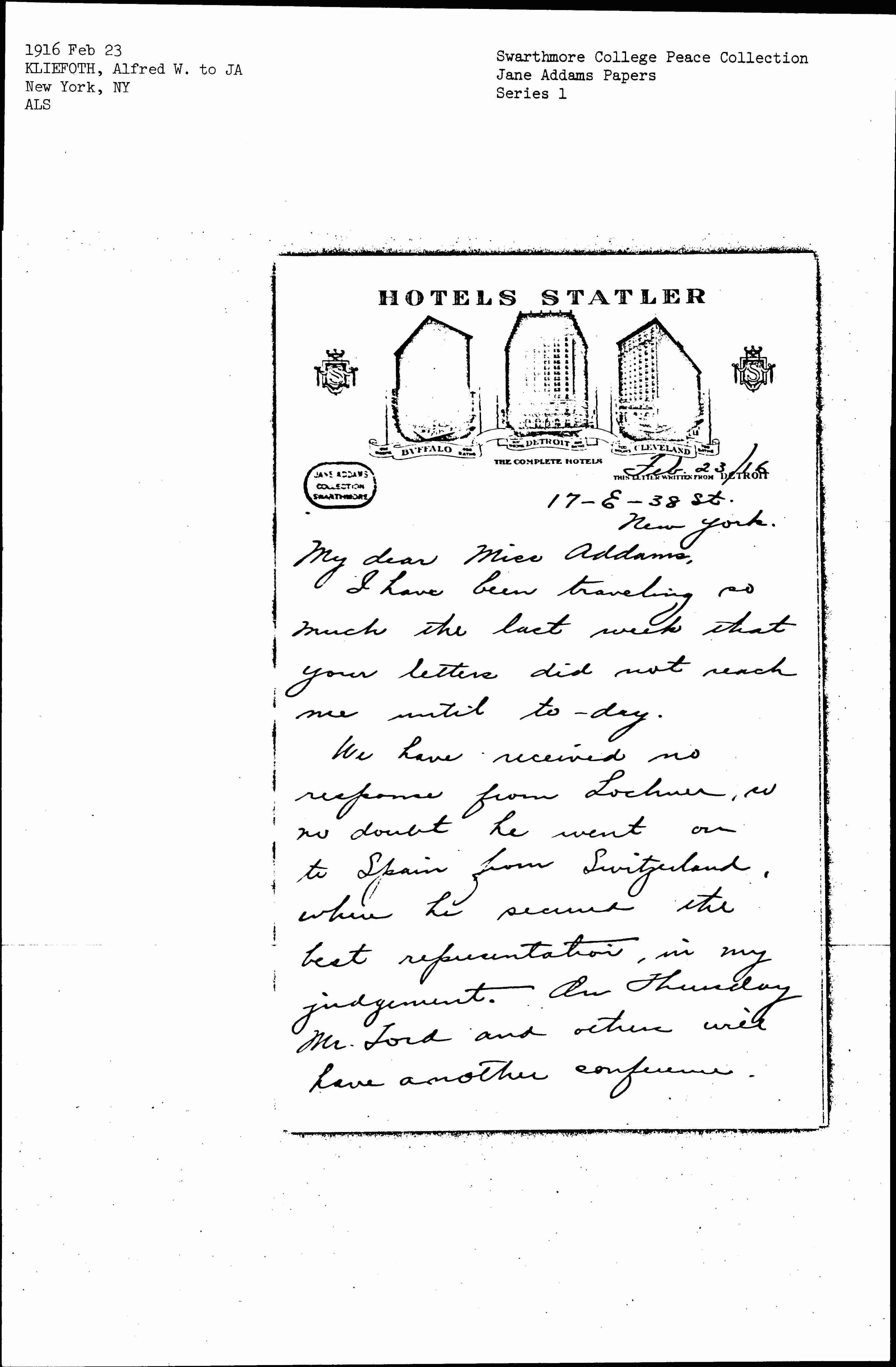 We have received no response from Lochner, so no doubt he went on to Spain from Switzerland, when he secured the best representation, in my [judgment]. On Thursday Mr. Ford and others will have another conference. [page 2] Dear Kirchwey and I am of the opinion that Mr. Lochner's return at this time would be very unfortunate and we will attempt to dissuade Mr. Ford to have him return. In any event I will do my best to bring him together with you, <if he comes> and I am certain that he is equally anxious to see you.