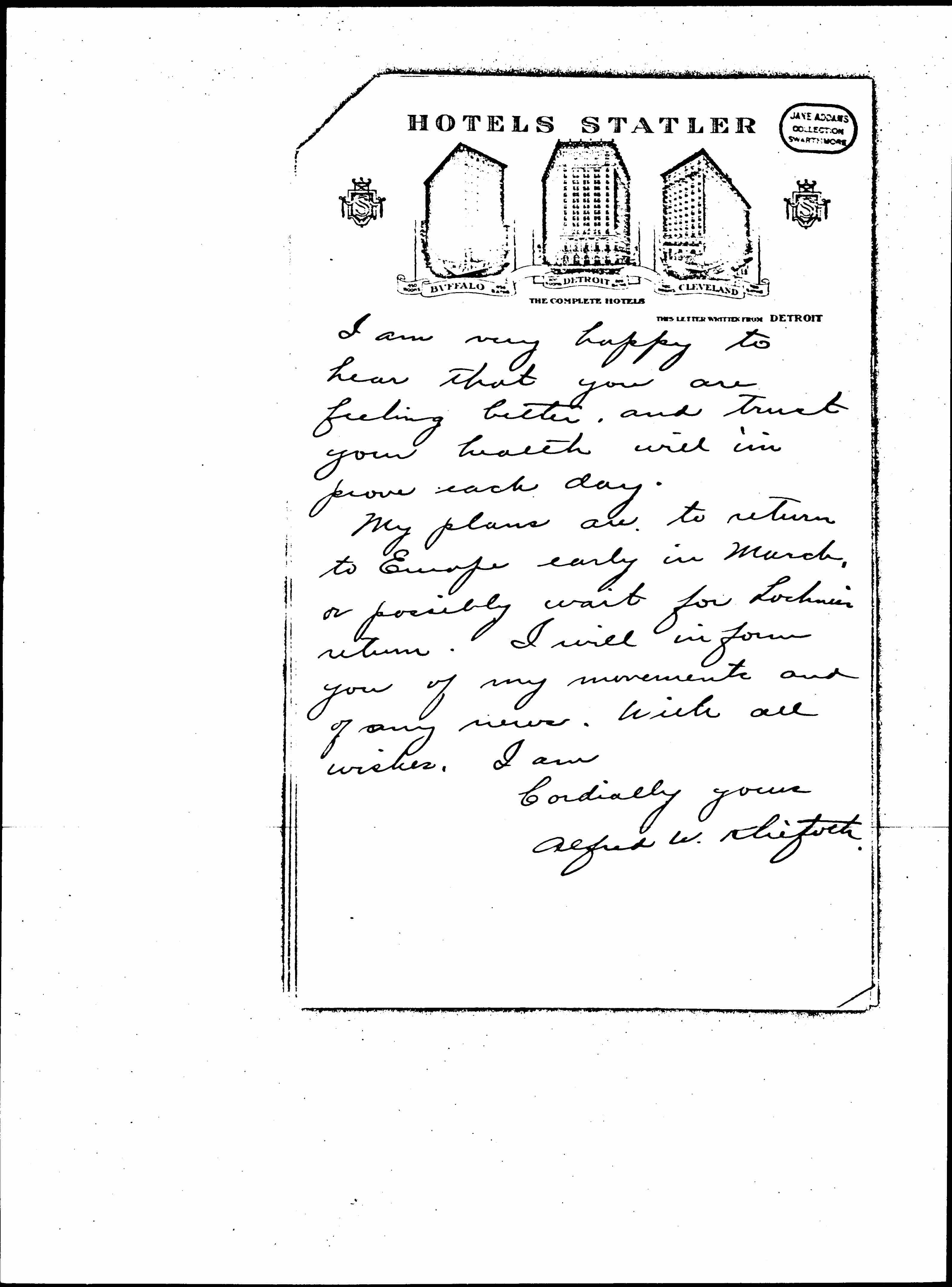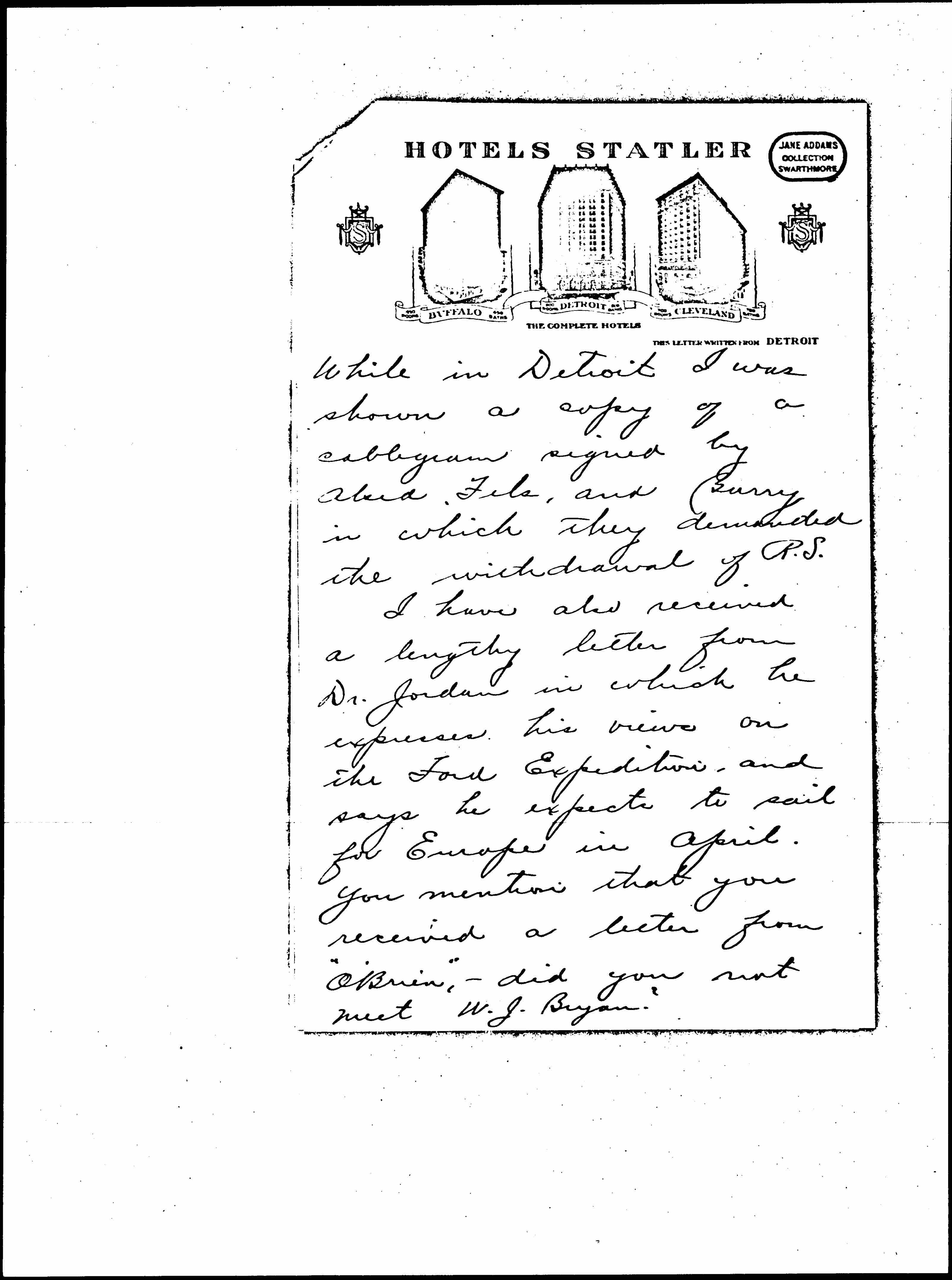 I have also received a lengthy letter from Dr. Jordan in which he expresses his views on the Ford Expedition, and says he expects to sail for Europe in April. You mention that you received a letter from "O'Brien," -- did you not [mean] W. J. Bryan? [page 5] I am very happy to hear that you are feeling better, and trust your health will improve each day.