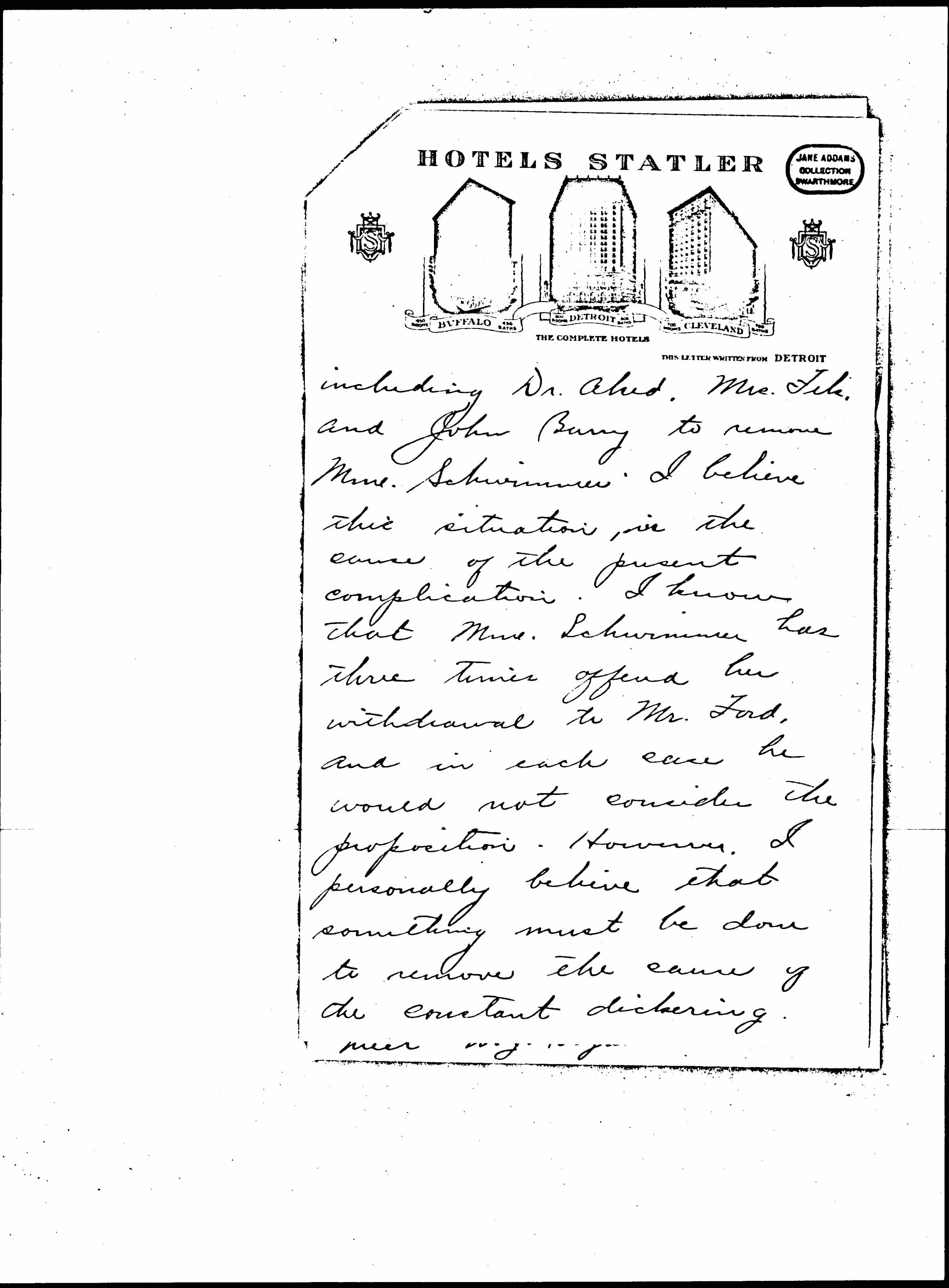 There seems to be a concerted attempt just now on the part of many [page 3] including Dr. Aked, Mrs. Fels, and John Barry to remove Mme. Schwimmer. I believe this situation is the cause of the present complication. I know that Mme. Schwimmer has three times offered her withdrawal to Mr. Ford, and in each case he would not consider the proposition. However, I personally believe that something must be done to remove the cause of the constant dickering. [page 4] While in Detroit I was shown a copy of a cablegram signed by Aked, Fels, and Barry in which they demanded the withdrawal of R. S.