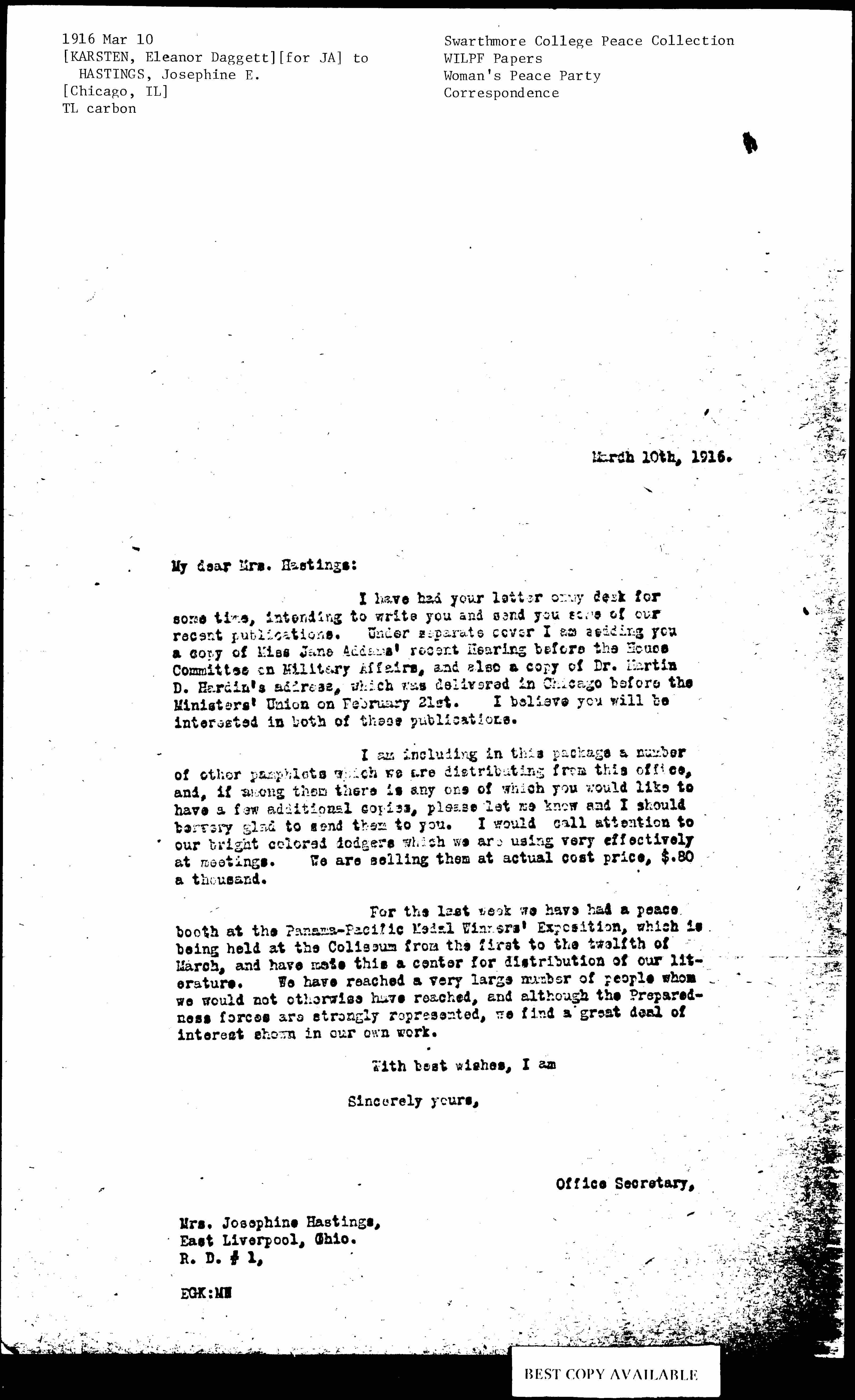 I have had your letter on my desk for some time, intending to write you and send you some of our recent publications. Under separate cover I am [sending] you a copy of Miss Jane Addams' recent Hearing before the House Committee on Military Affairs, and also a copy of Dr. Martin D. Hardin's address, which was delivered in Chicago before the Ministers' Union on February 21st. I believe you will be interested in both of these publications.
