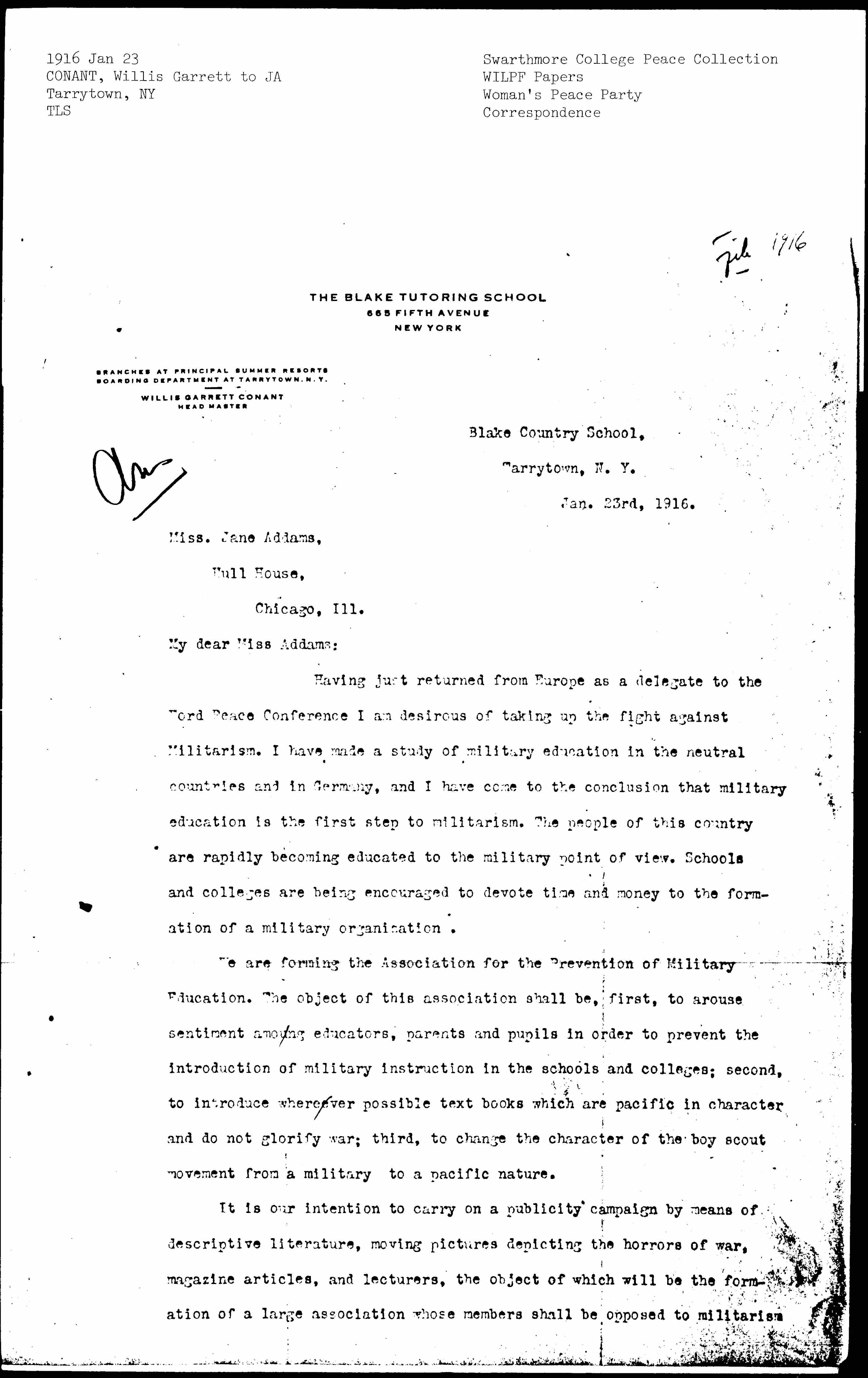 Having just returned from Europe as a delegate to the [Ford] Peace Conference I am desirous of taking up the fight against Militarism. I have made a study of military education in the neutral countries and in Germany, and I have come to the conclusion that military education is the first step to militarism. The people of this country are rapidly becoming educated to the military point of view. Schools and colleges are being encouraged to devote time and money to the formation of a military organization.