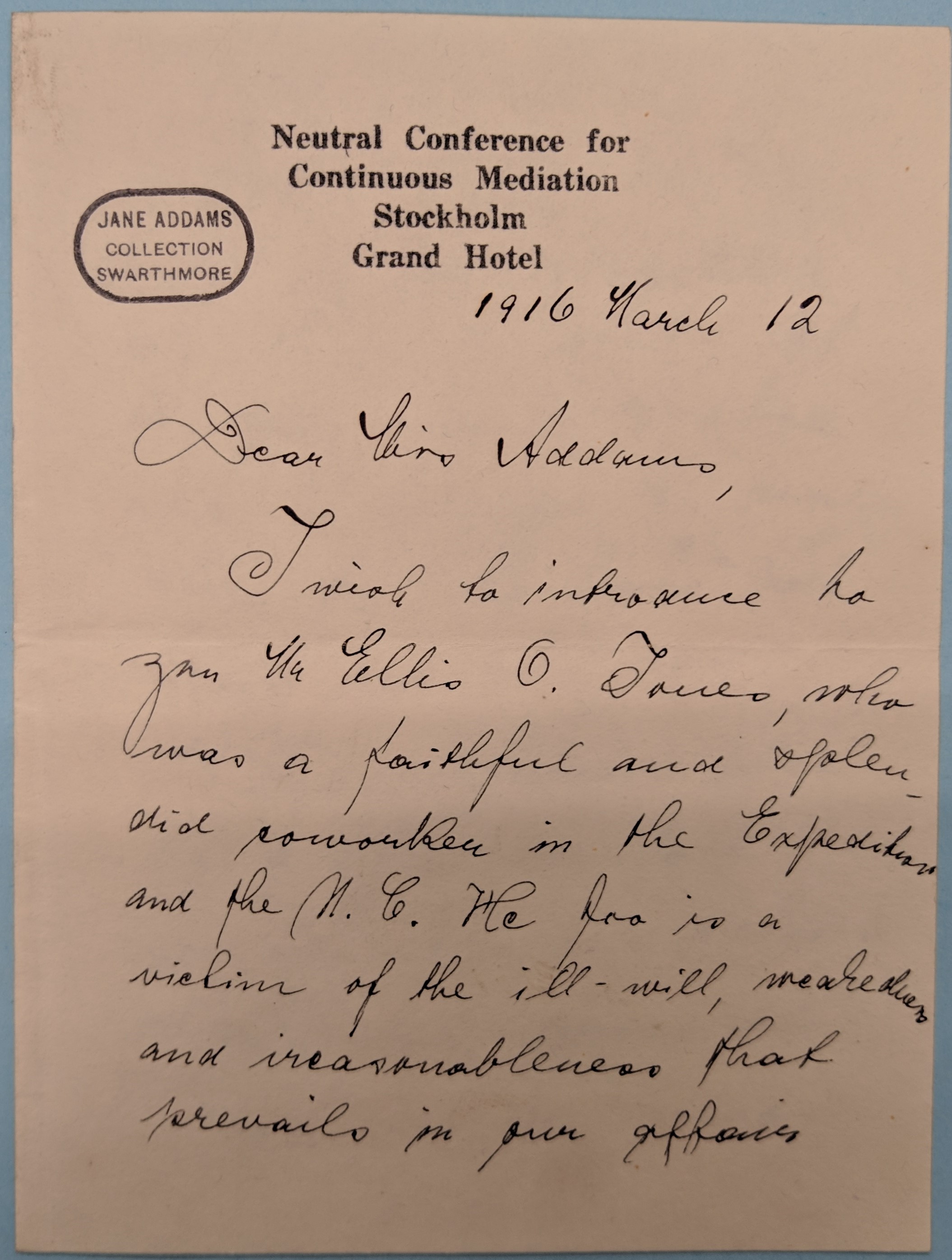 I wish to introduce to you Mr Ellis O. Jones, who was a faithful and splendid coworker in the Expedition and the N.C. He too is a victim of the ill-will, weakedness and [unreasonableness] that prevails in our affairs. [page 2]