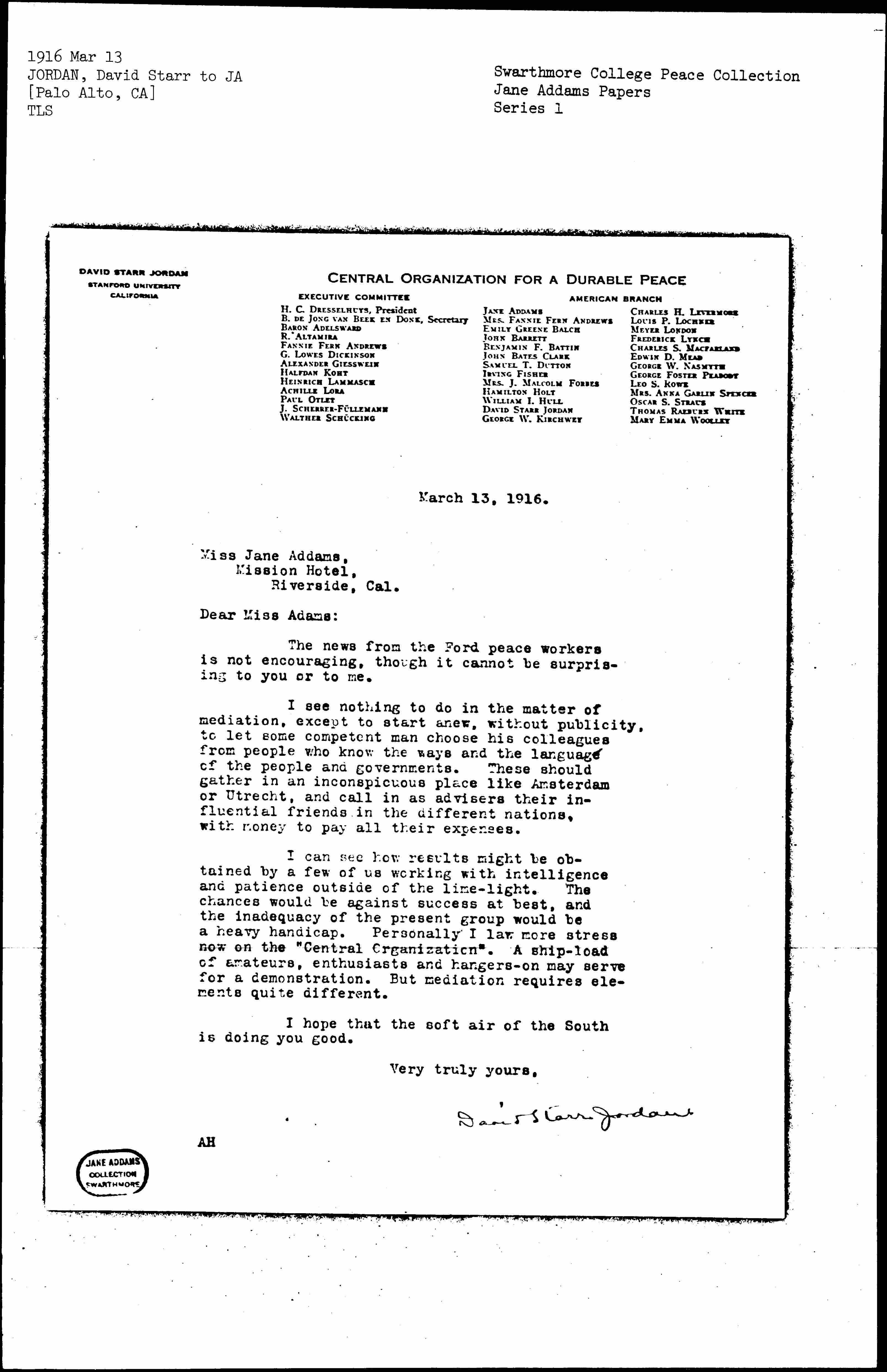 I can see how results might be obtained by a few of us working with intelligence and patience outside of the lime-light. The chances would be against success at best, and the inadequacy of the present group would be a heavy handicap. Personally I [lay] more stress now on the "Central Organization". A ship-load of amateurs, enthusiasts and hangers-on may serve for a demonstration. But mediation requires elements quite different.