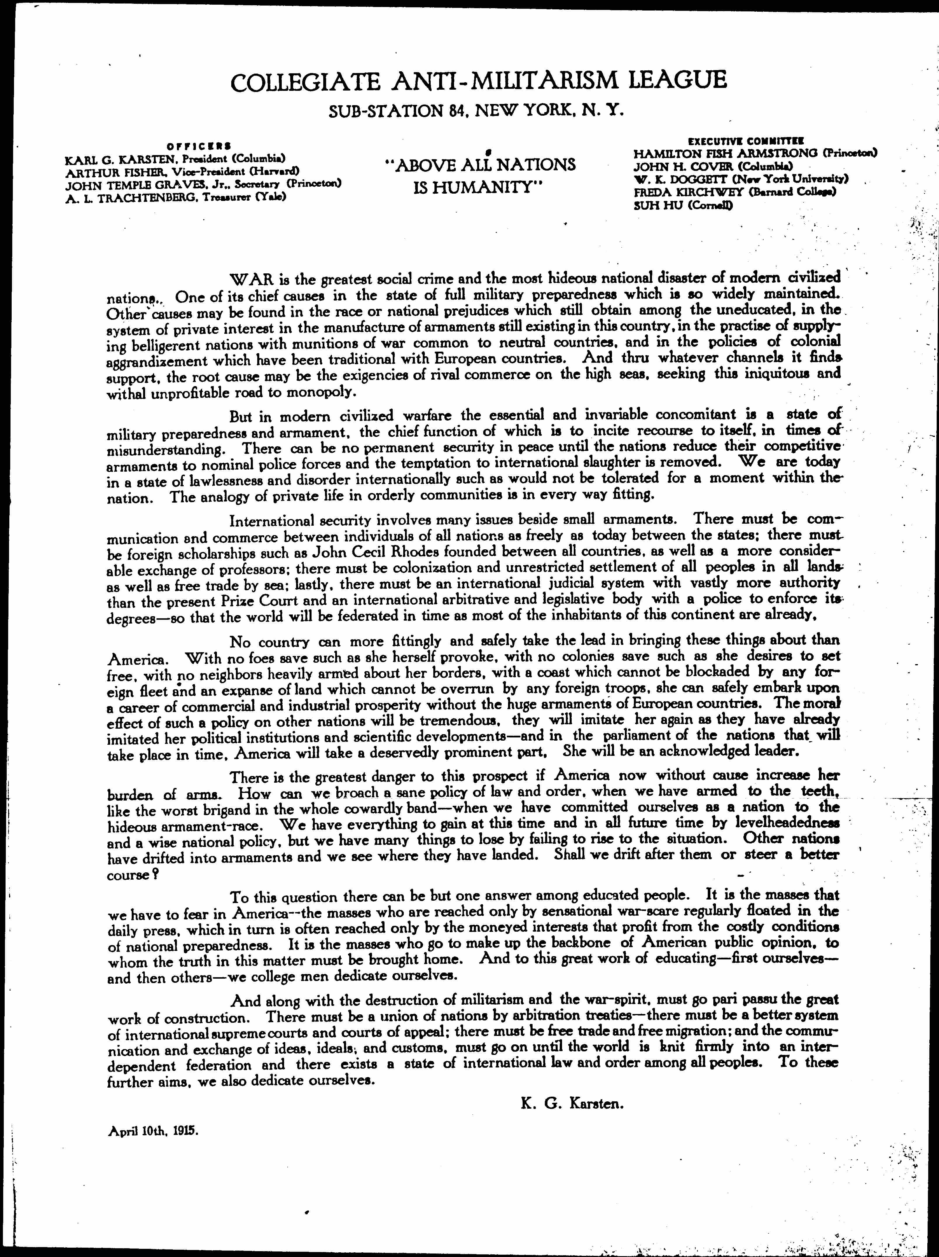 To this question there can be but one answer among educated people. It is the masses that we have to fear in America -- the masses who are reached only by sensational war-scare regularly floated in the daily press, which in turn is often reached only by the moneyed interests that profit from the costly conditions of national preparedness. It is the masses who go to make up the backbone of American public opinion, to whom the truth in this matter must be brought home. And to this great work of educating -- first ourselves -- and then others -- we college men dedicate ourselves.