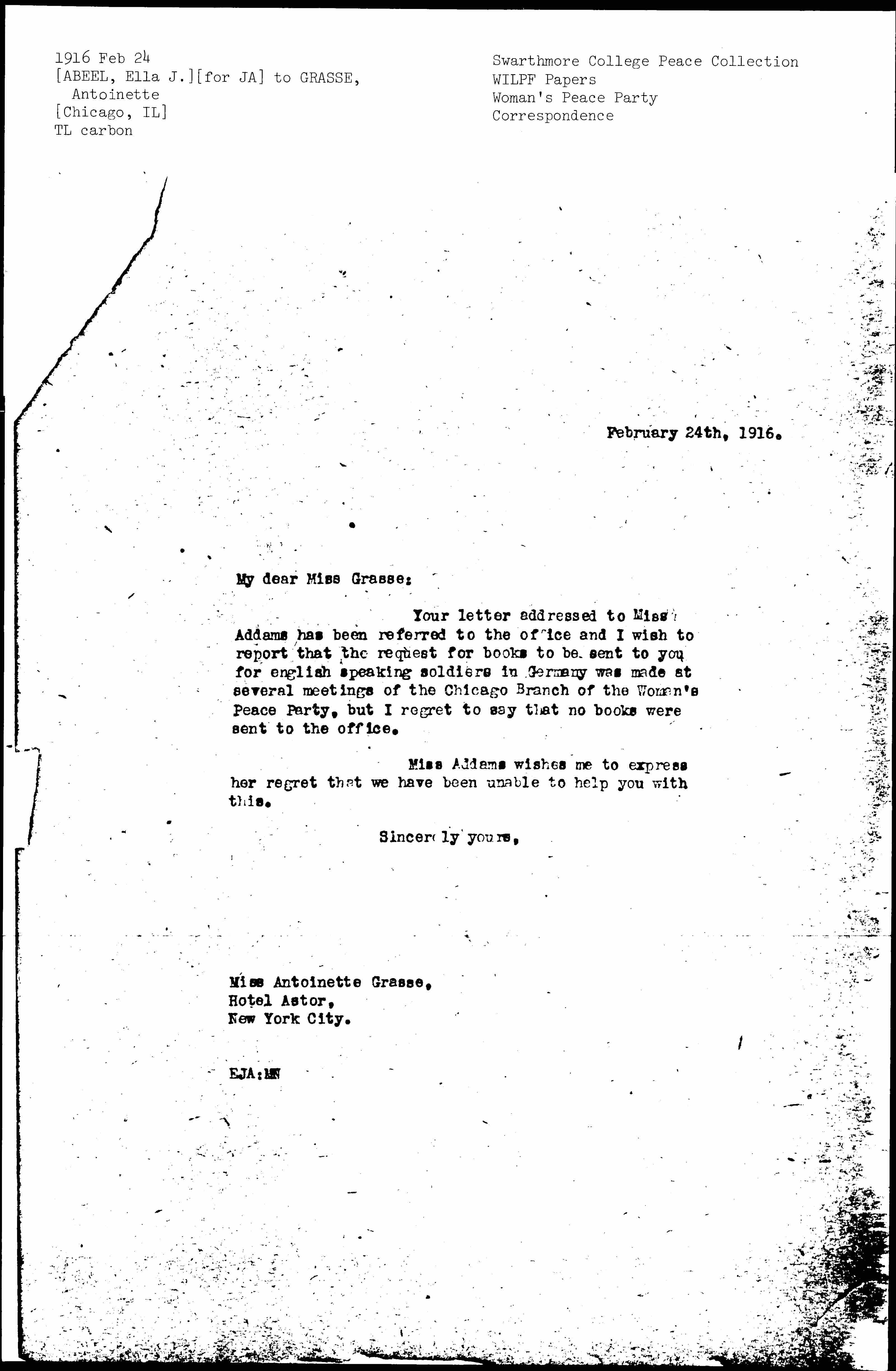 Your letter addressed to Miss Addams has been referred to the office and I wish to report that the request for books to be sent to you for English speaking soldiers in Germany was made at several meetings of the Chicago Branch of the Woman's Peace Party, but I regret to say that no books were sent to the office.