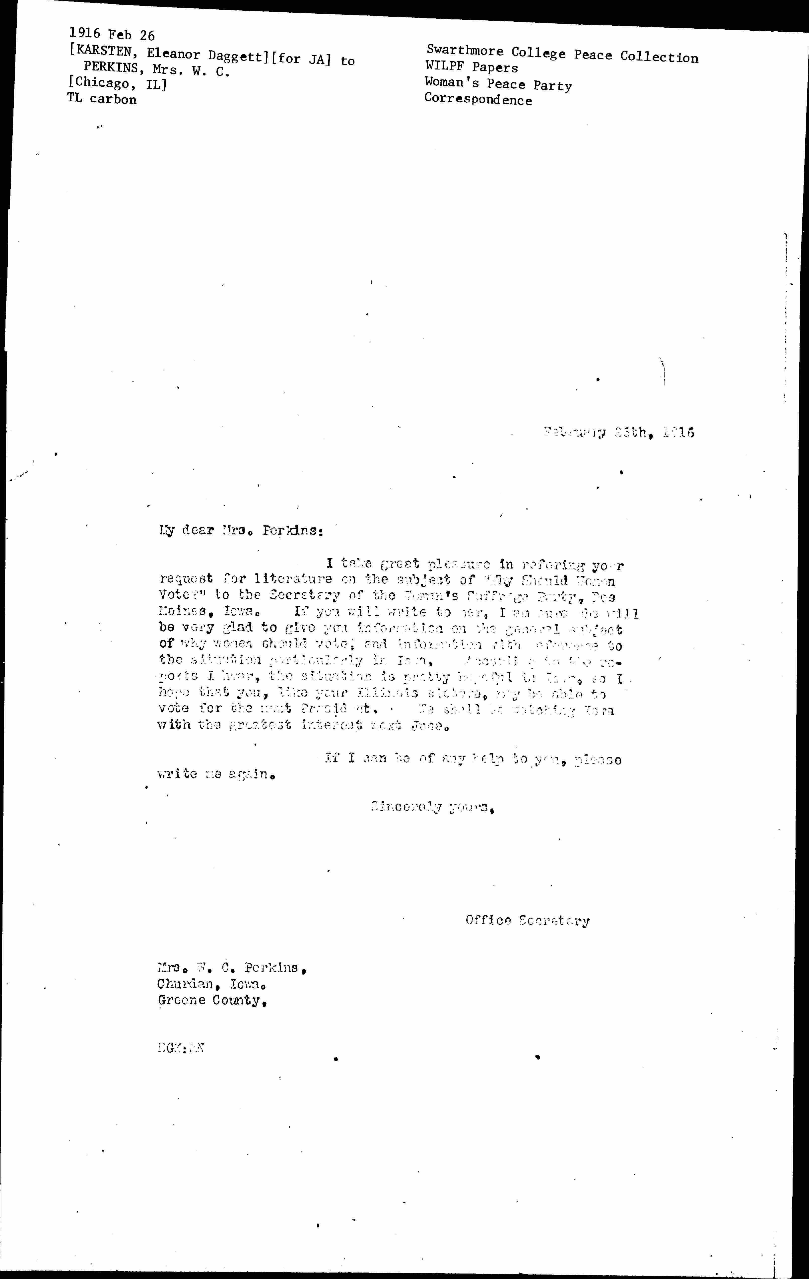 I take great pleasure in [referring] your request for literature on the subject of "Why Should Women Vote?" to the Secretary of the Woman's Suffrage Party, Des Moines, Iowa. If you will write to her, I am sure she will be very glad to give you information on the general subject of why women should vote, and information with [reference] to the situation particularly in Iowa. According to the reports I hear, the situation is pretty hopeful in Iowa, so I hope that you, like your Illinois sisters, may be able to vote for the next President. We shall be watching Iowa with the greatest interest next June.