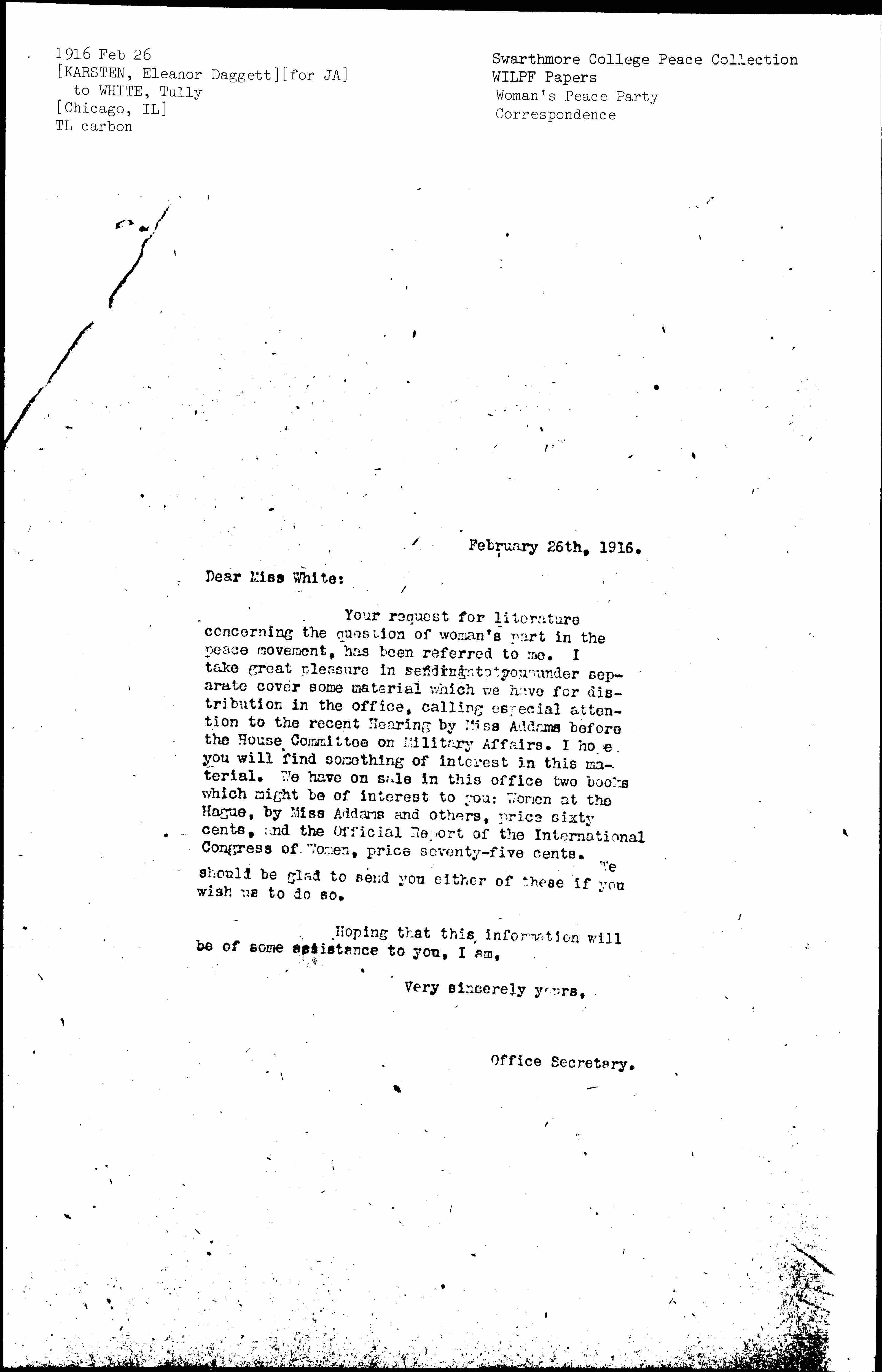 Your request for literature concerning the question of woman's part in the peace movement, has been referred to me. I take great pleasure in sending to you under separate cover some material which we have for distribution in the office, calling especial attention to the recent Hearing by Miss Addams before the House Committee on Military Affairs. I hope you will find something of interest in this material. We have on sale in this office two books which might be of interest to you: Women at The Hague, by Miss Addams and others, price sixty cents, and the Official Report of the International Congress of Women, price seventy-five cents.