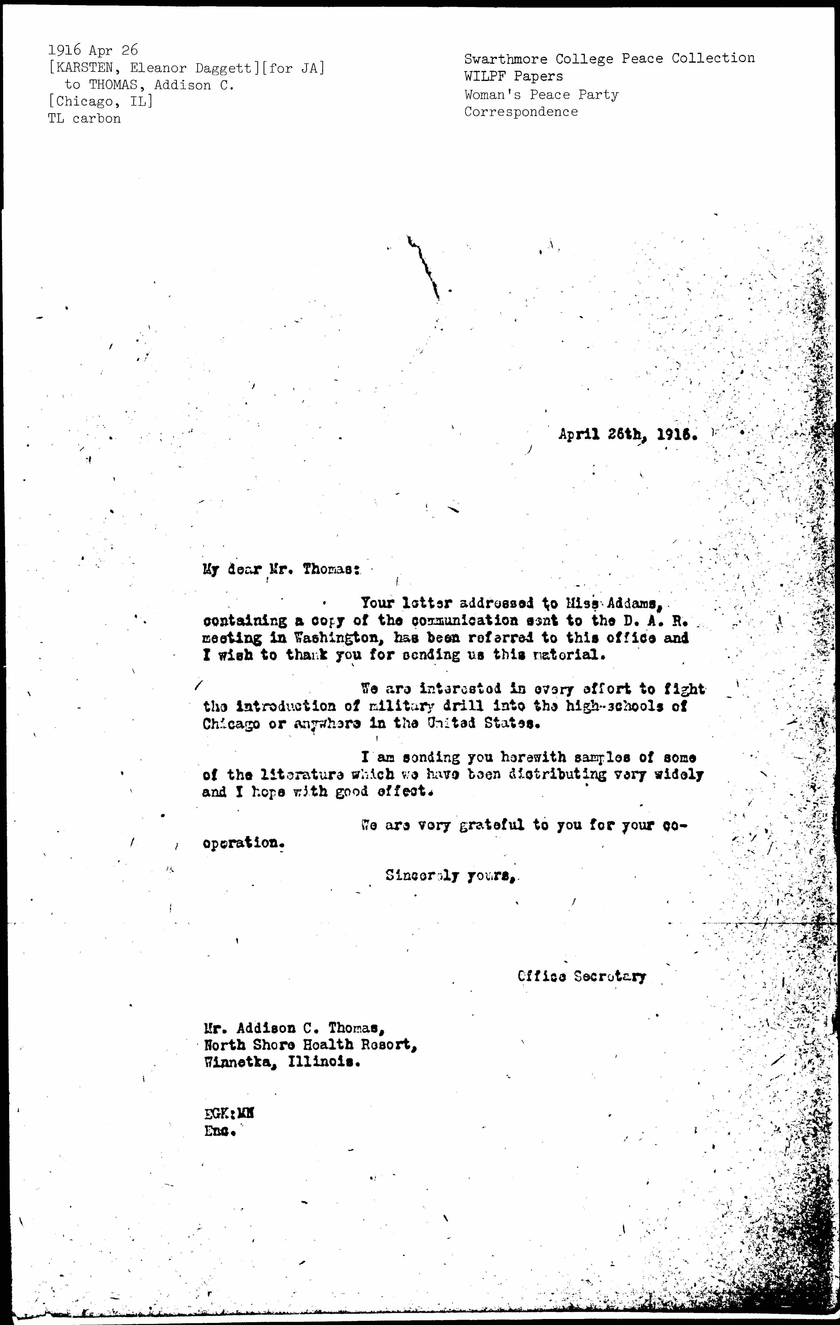 Your letter addressed to Miss Addams, containing a copy of the communication sent to the D.A.R. meeting in Washington, has been referred to this office and I wish to thank you for sending us this material.