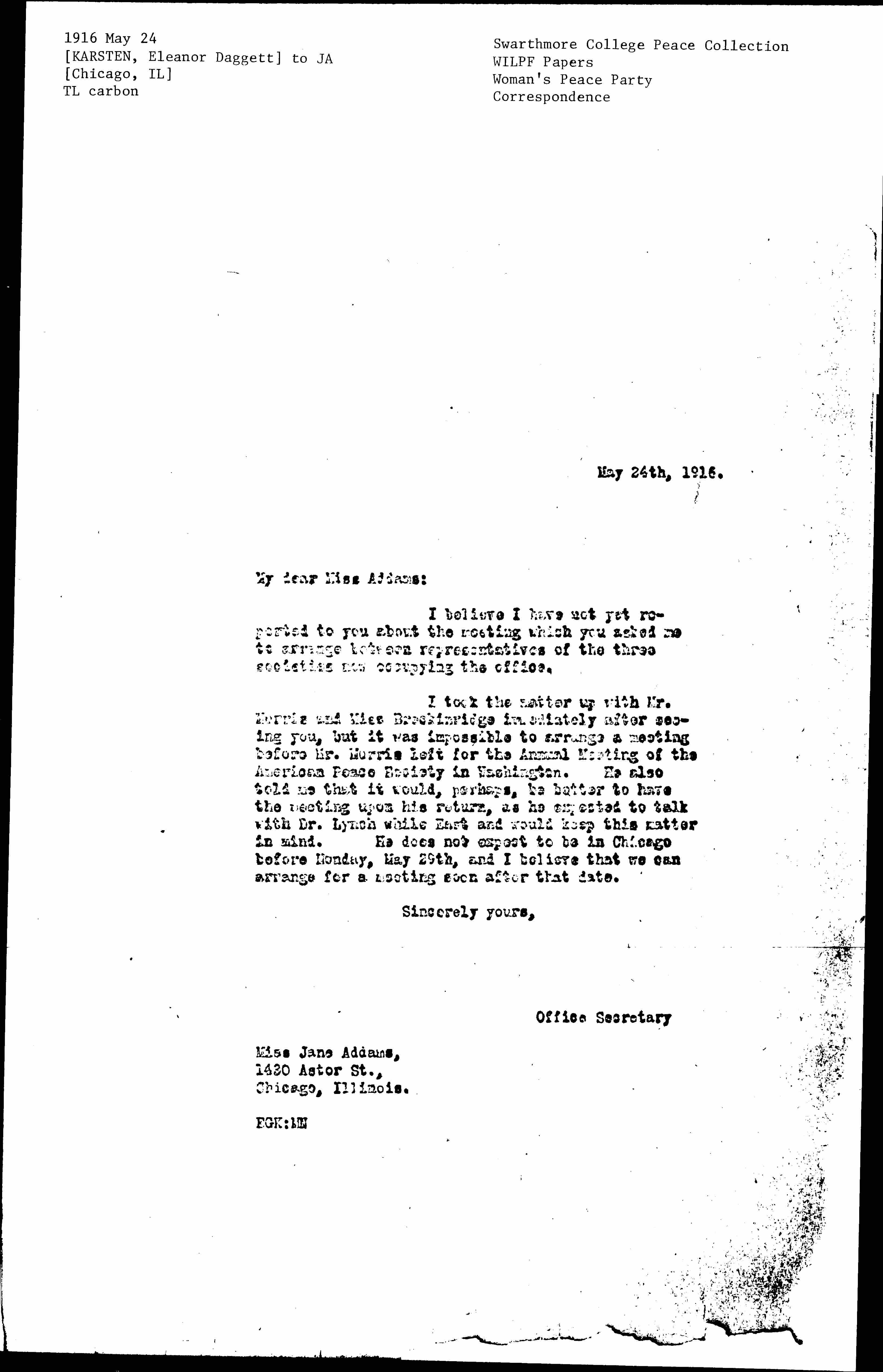 I took the matter up with Mr. Morris and Miss Breckinridge immediately after seeing you, but it was impossible to arrange a meeting before Mr. Morris left for the Annual Meeting of the American Peace Society in Washington. He also told me that it would, perhaps, be better to have the meeting upon his return, as he expected to talk with Dr. Lynch while East and would keep this matter in mind. He does not expect to be in Chicago before Monday, May 29th, and I believe that we can arrange for a meeting soon after that date.