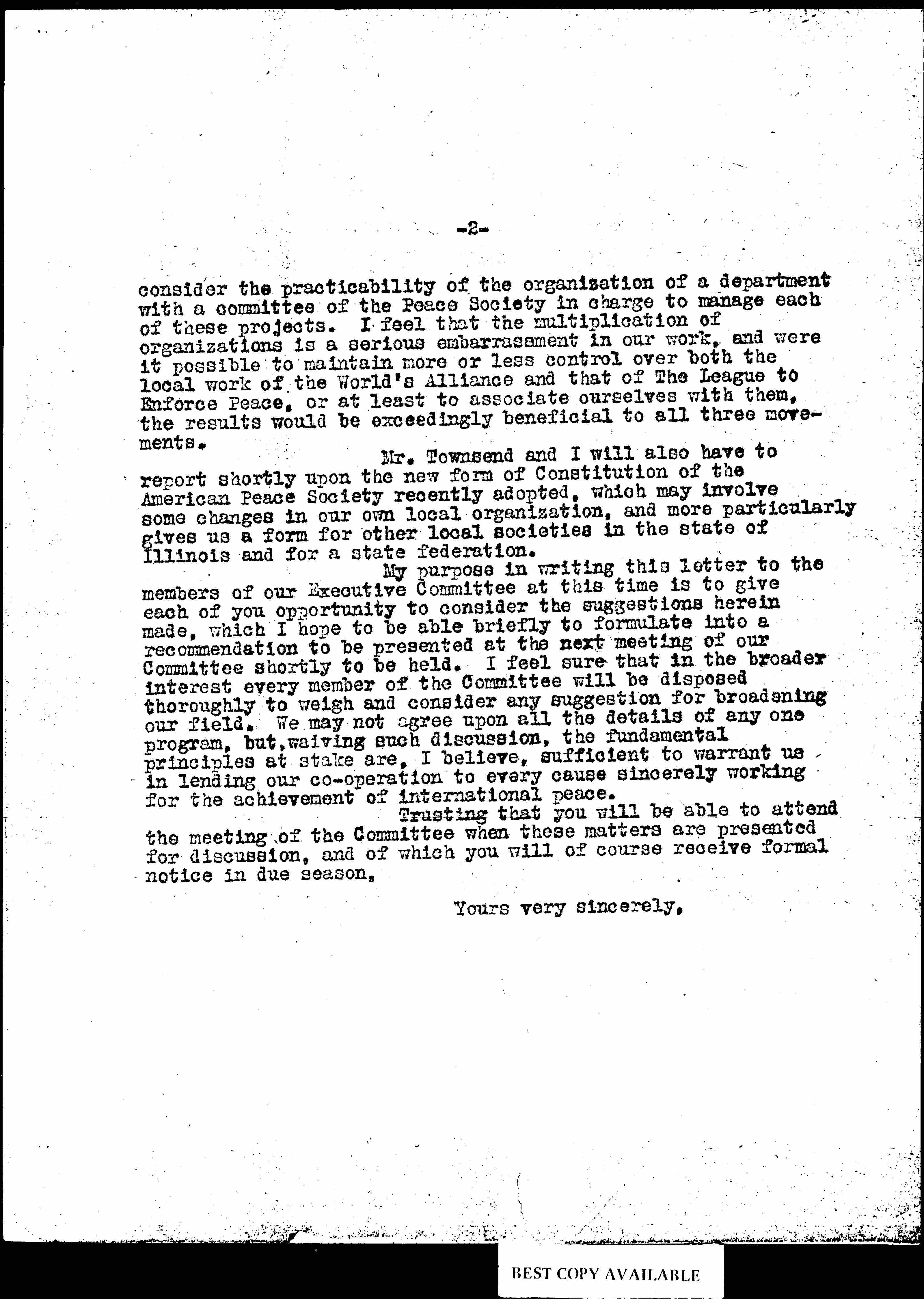 Let me then suggest the feasibility on the part of the Chicago Peace Society to take up both these branches of work. My thought is that the Executive Committee might well appoint in each instance a special committee to [page 2] consider the practicability of the organization of a department with a committee of the Peace Society in charge to manage each of these projects. I feel that the multiplication of organizations is a serious embarrassment in our work, and were it possible to maintain more or less control over both the local work of the World's Alliance and that of The League to Enforce Peace, or at least to associate ourselves with them, the results would be exceedingly beneficial to all three movements.