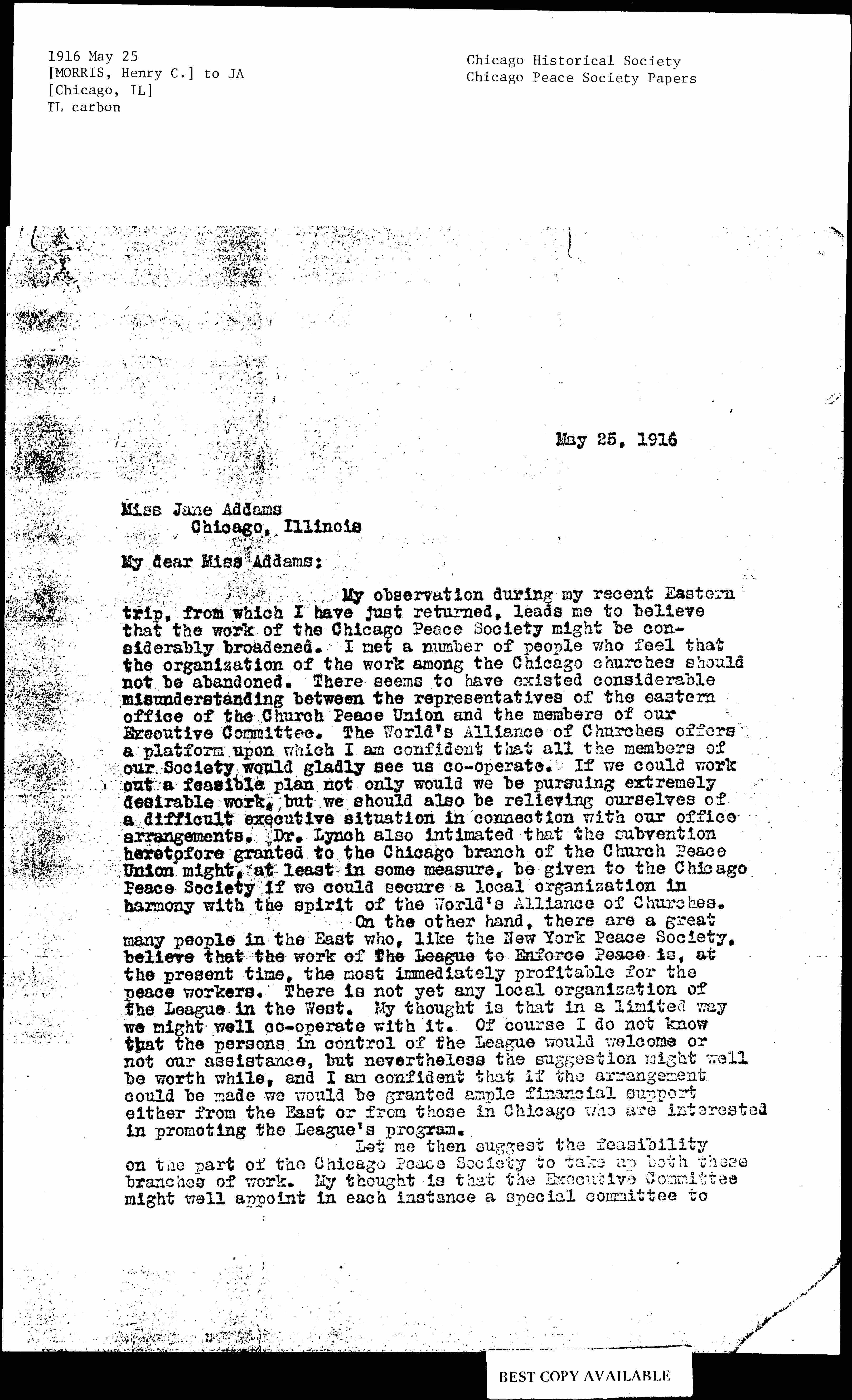 My observation during my recent Eastern trip, from which I have just returned, leads me to believe that the work of the Chicago Peace Society might be considerably broadened. I met a number of people who feel that the organization of the work among the Chicago churches should not be abandoned. There seems to have existed considerable misunderstanding between the representatives of the eastern office of the Church Peace Union and the members of our Executive Committee. The World's Alliance of Churches offers a platform upon which I am confident that all the members of our Society would gladly see us [cooperate]. If we could work out a feasible plan not only would we be pursuing extremely desirable work, but we should also be relieving ourselves of a difficult executive situation in connection with our office arrangements. Dr. Lynch also intimated that the subvention heretofore granted to the Chicago branch of the Church Peace Union might, at least in some measure, be given to the Chicago Peace Society if we could secure a local organization in harmony with the spirit of the World's Alliance of Churches.