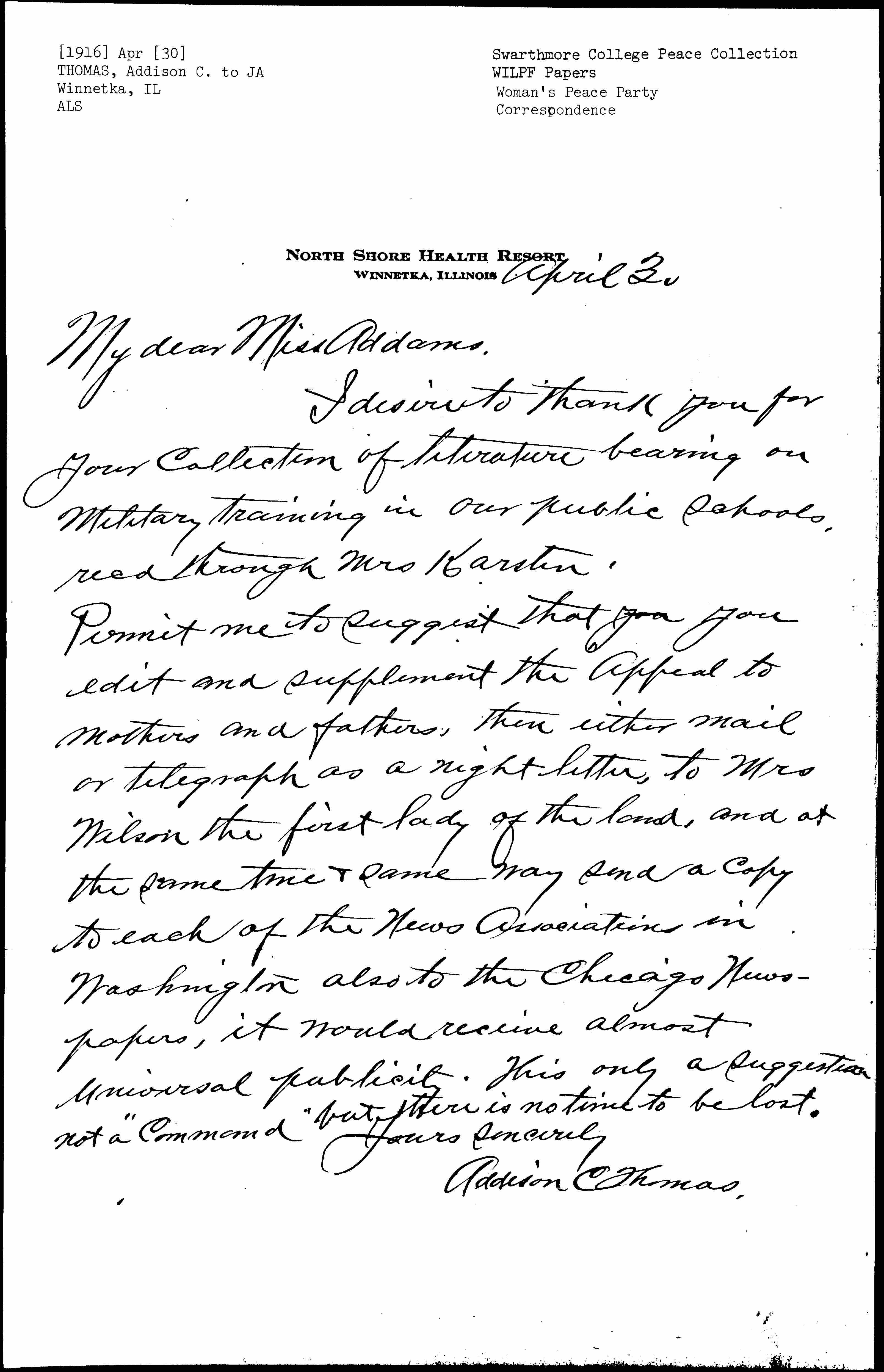 Permit me to suggest that [illegibl] you edit and supplement the appeal to mothers and fathers, then either mail or telegraph as a night letter, to Mrs Wilson the first lady of the land, and at the same time and & same way send a copy to each of the News Associations in Washington also to the Chicago Newspapers, it would receive almost universal publicity. This only a suggestion not a "Command" <but there is no time to be lost.>