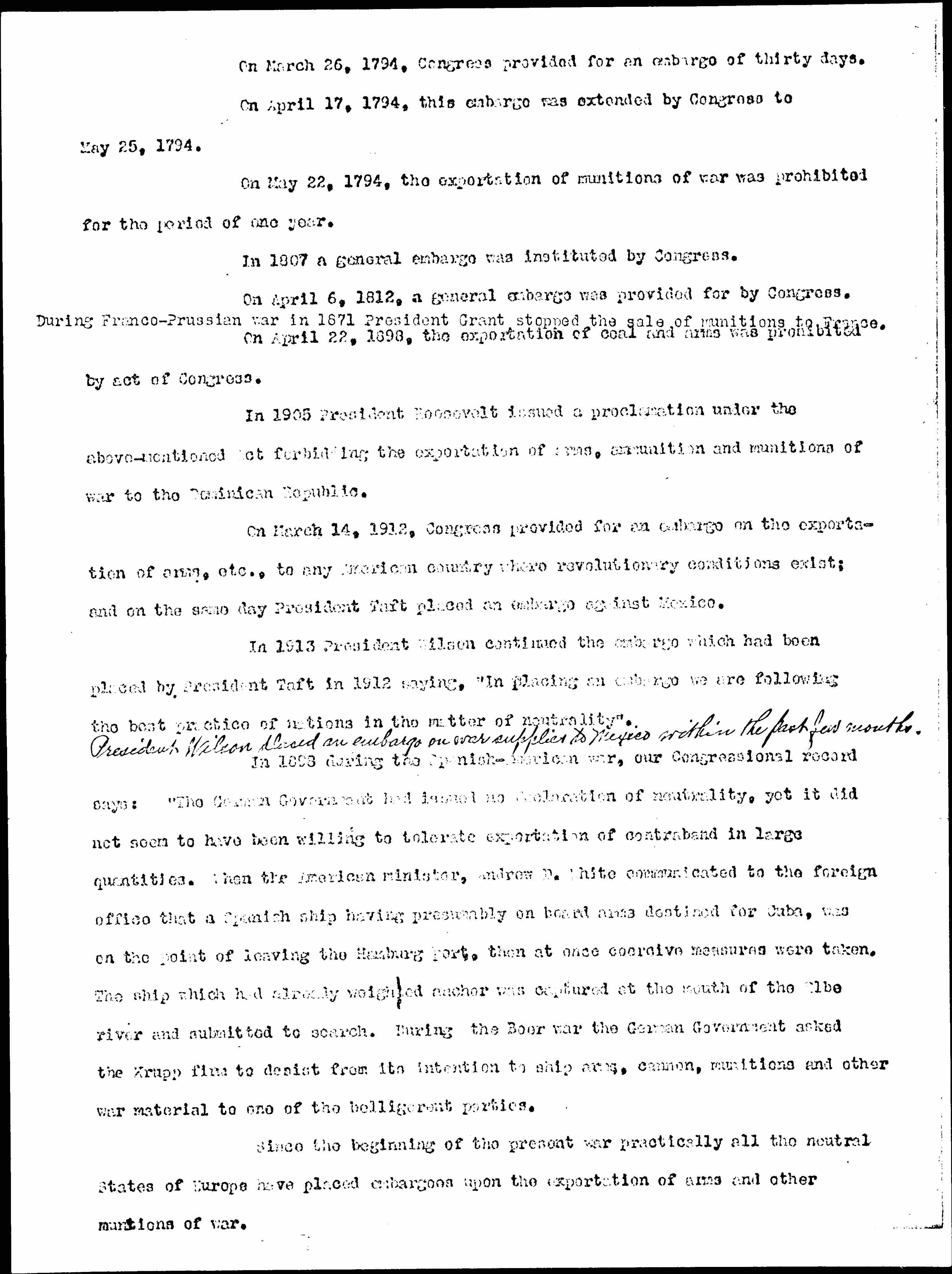 <President Wilson placed an embargo on war supplies to Mexico within the past few months.>