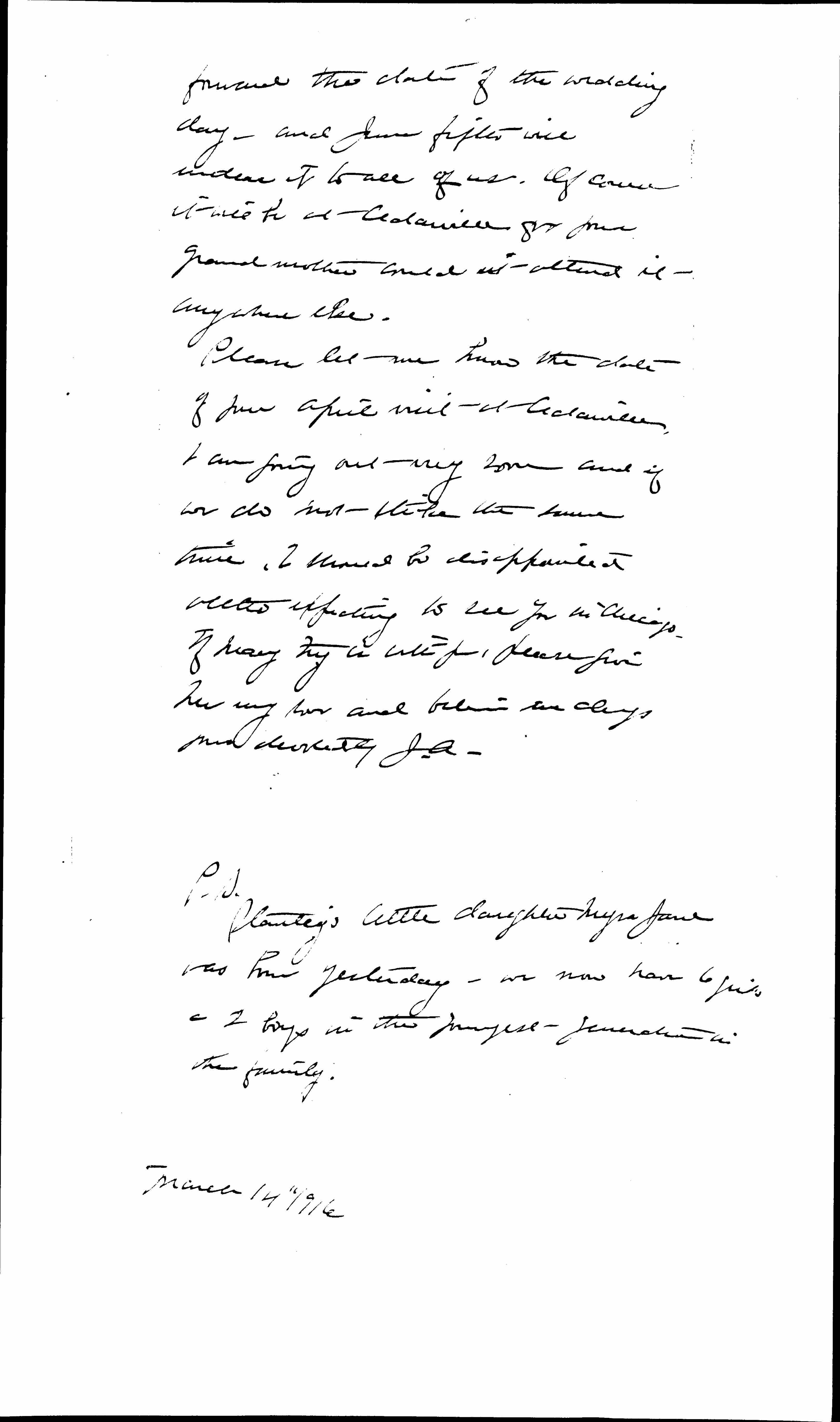 I am glad that you have moved [page 2] forward the date of the wedding day, and June fifth will endear it to all of us. Of course it will be at Cedarville for your grandmother couldn't attend it anywhere else.