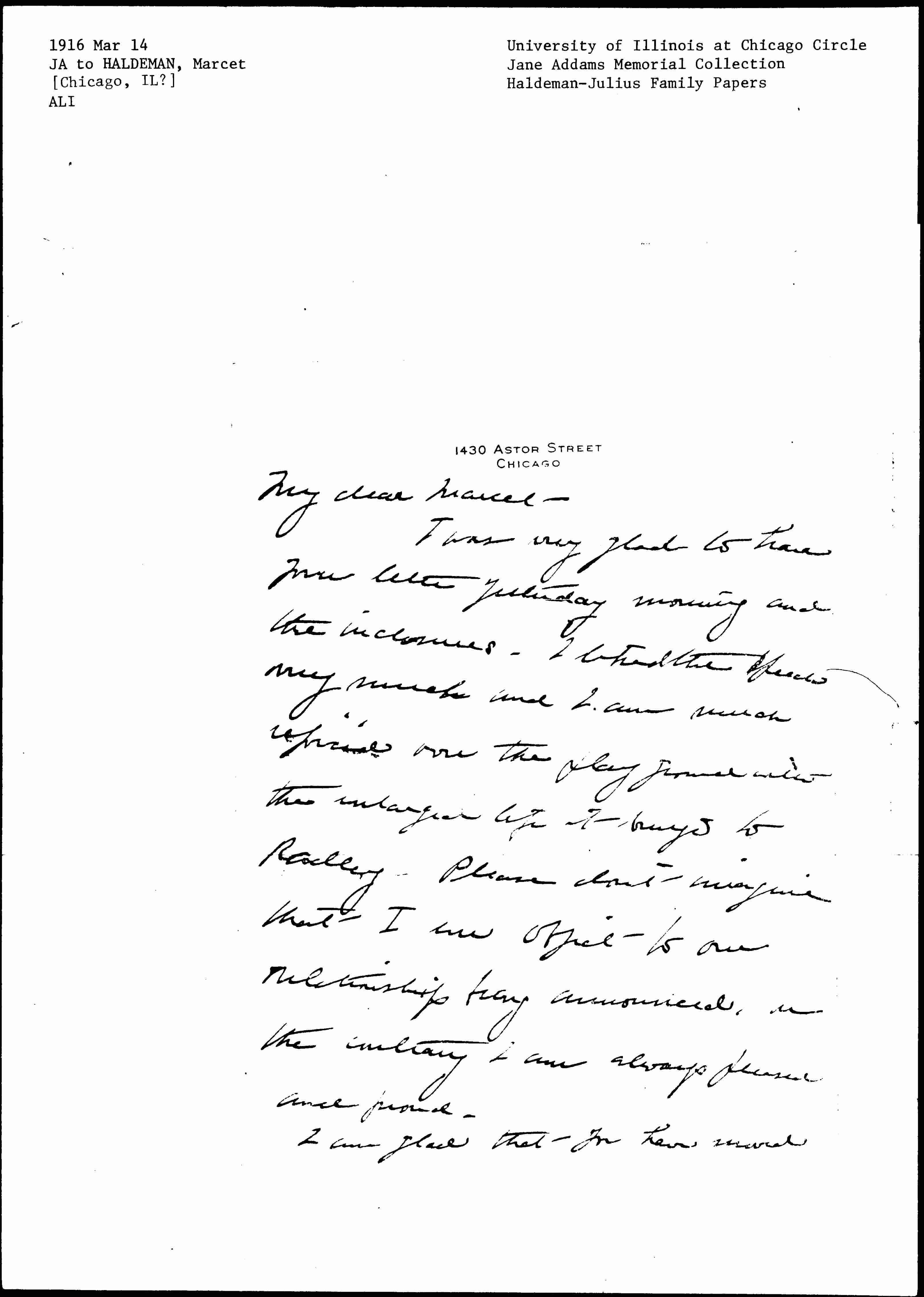 Please let me know the date of your April visit at Cedarville. I am going out very soon and if we do not strike the same time, I should be disappointed [although] expecting to see you in Chicago. If Mary Fry is with you, please give her my love and believe me always yours devotedly J. A.