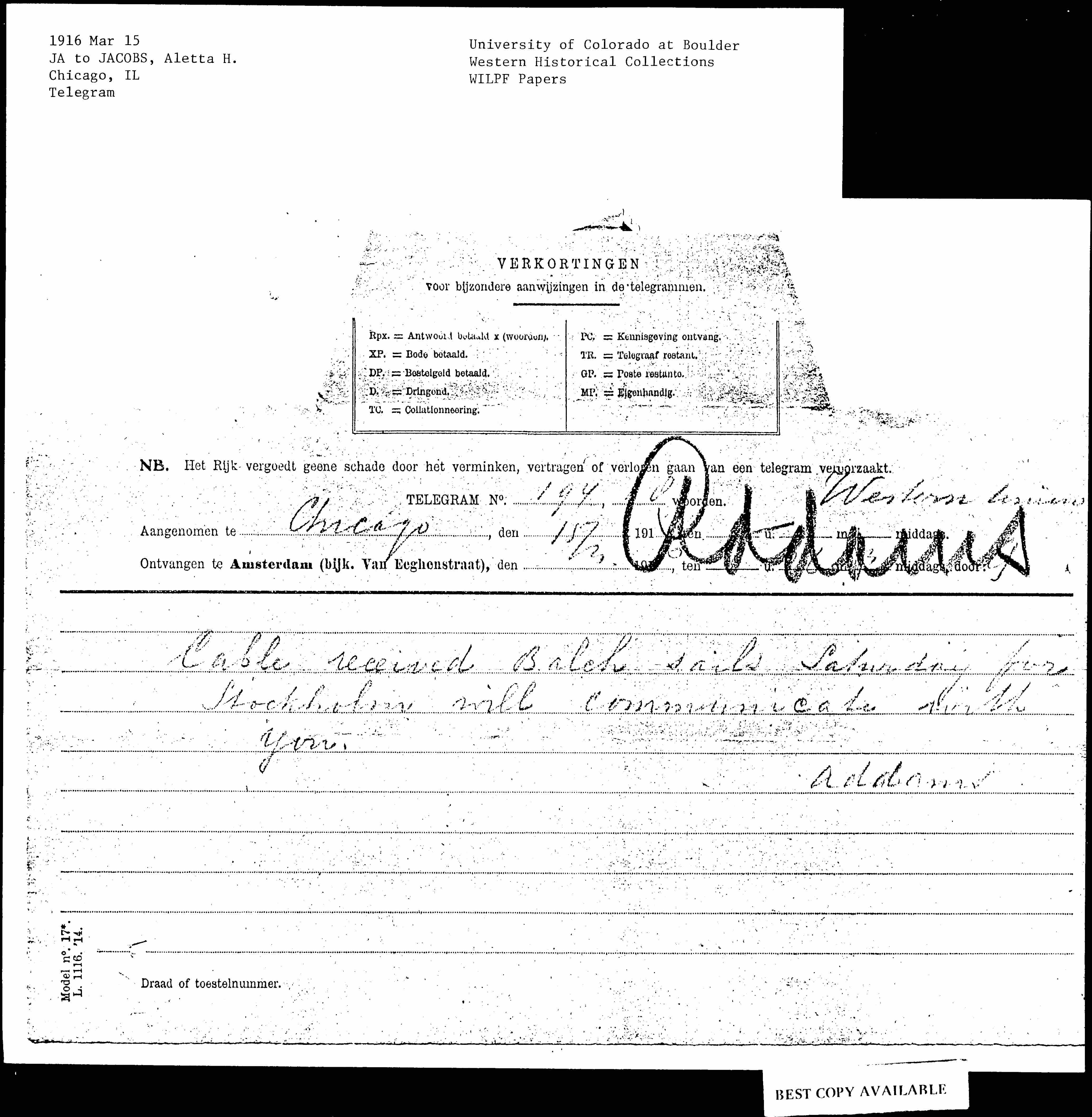 Cable received Balch sails Saturday for Stockholm will communicate with you.