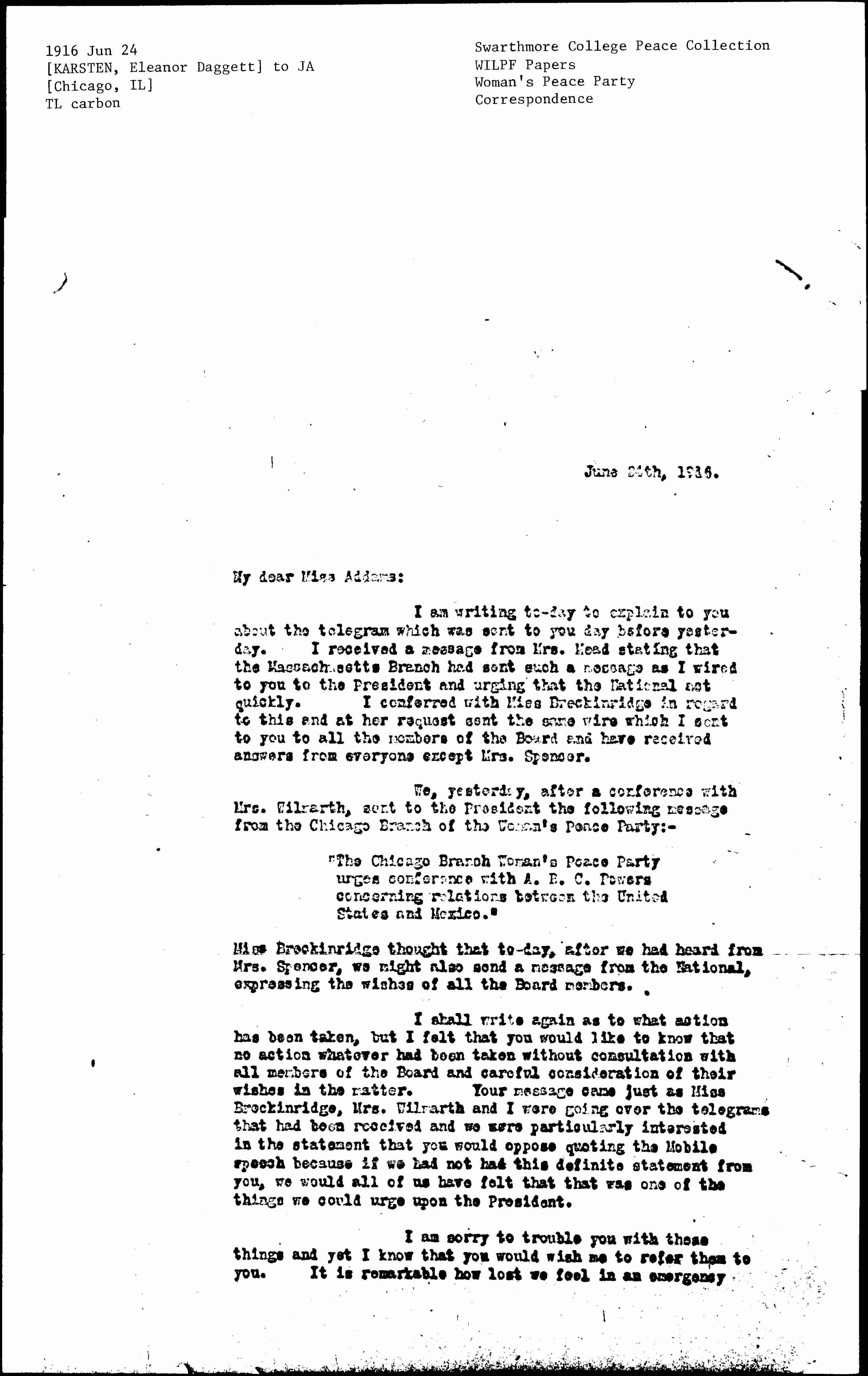 "The Chicago Branch Woman's Peace Party urges conference with A. B. C. Powers concerning relations between the United States and Mexico."