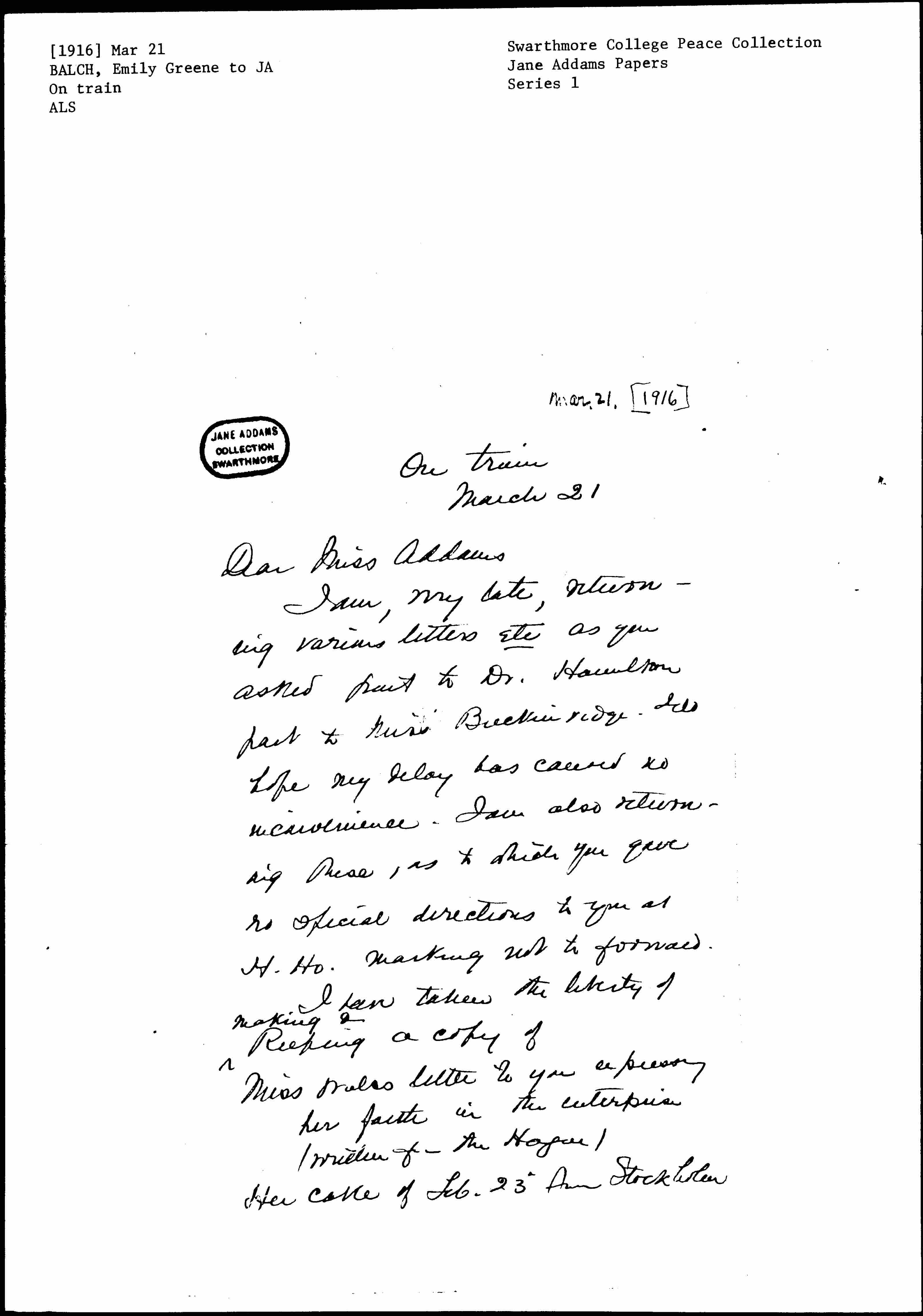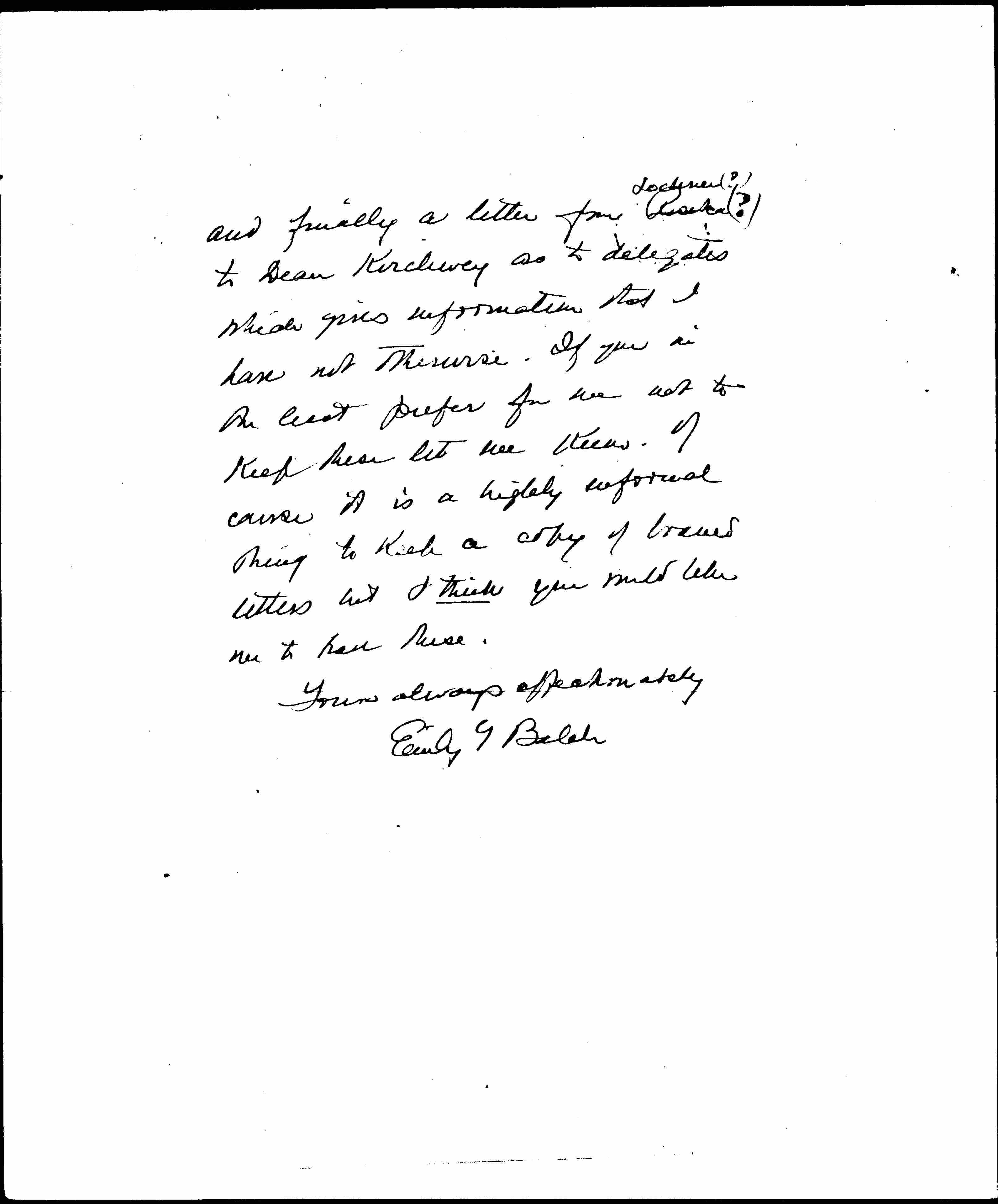I have taken the liberty of <making &> keeping a copy of Miss Wales letter to you expressing her faith in the enterprise (written from The Hague). Her cable of Feb. 23rd from Stockholm [page 2] and finally a letter from <Lochner(?)> Rosika (?) to Dean Kirchwey as to delegates which gives information that I have not otherwise. If you in the least prefer for me not to keep these let me know. Of course it is a highly informal thing to keep a copy of loaned letters but I think you would like me to have these.