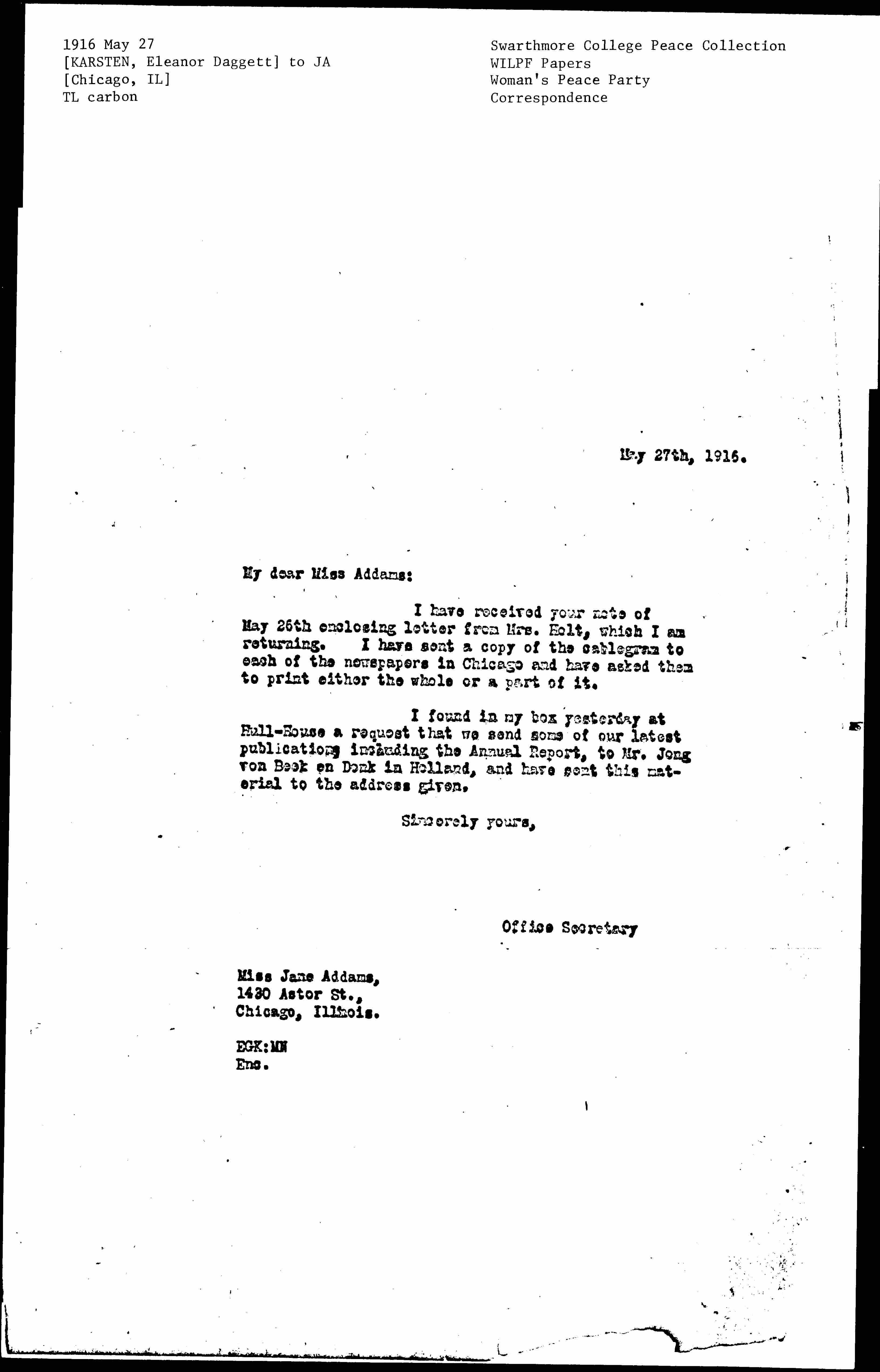 I found in my box yesterday at Hull-House a request that we send some of our latest publications including the Annual Report, to Mr. Jong [van] Beek en Donk in Holland, and have sent this material to the address given.