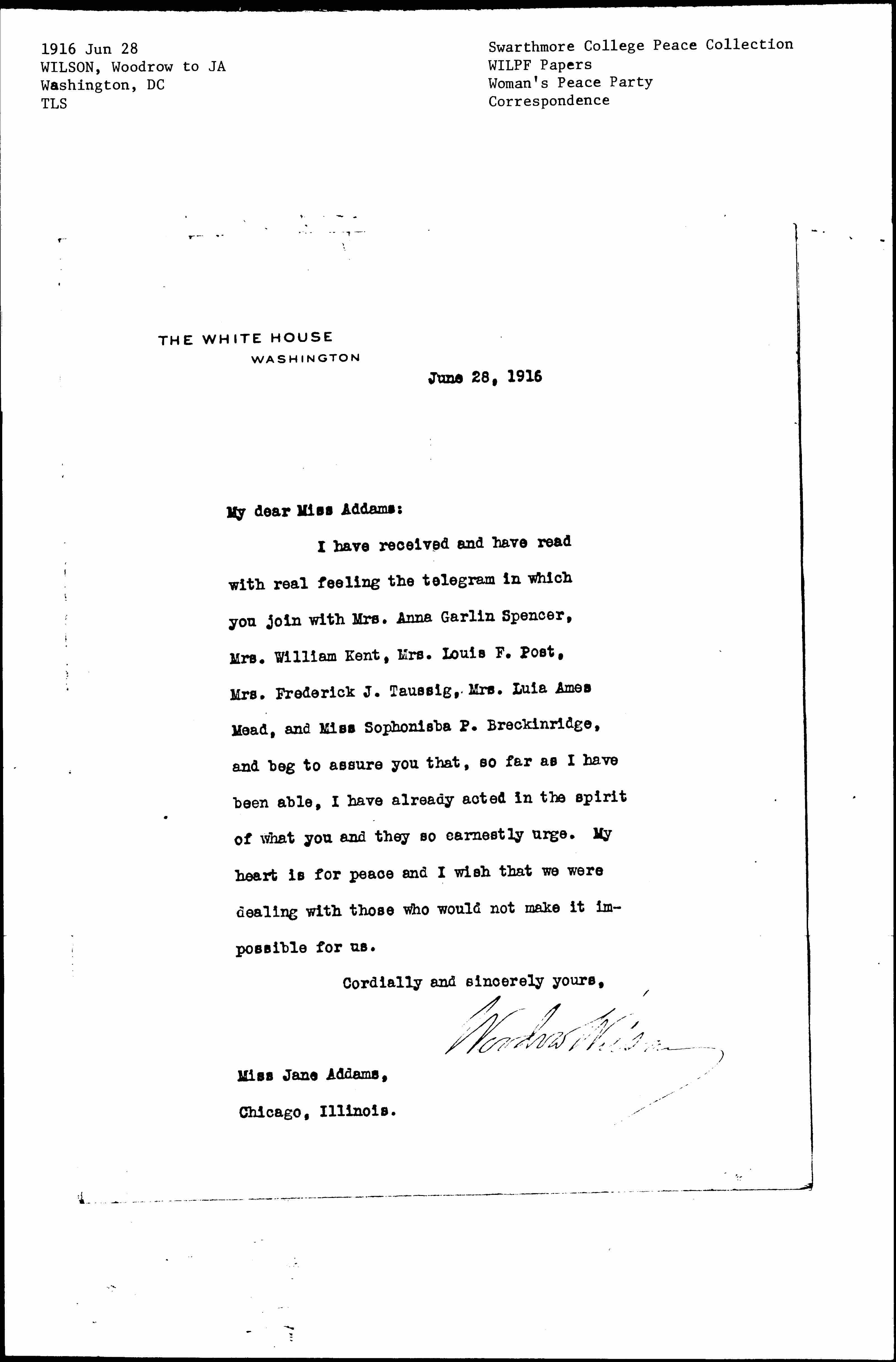 I have received and have read with real feeling the telegram in which you join with Mrs. Anna Garlin Spencer, Mrs. William Kent, Mrs. Louis F. Post, Mrs. Frederick J. Taussig, Mrs. [Lucia] Ames Mead, and Miss Sophonisba P. Breckinridge, and beg to assure you that, so far as I have been able, I have already acted in the spirit of what you and they so earnestly urge. My heart is for peace and I wish that we were dealing with those who would not make it impossible for us.