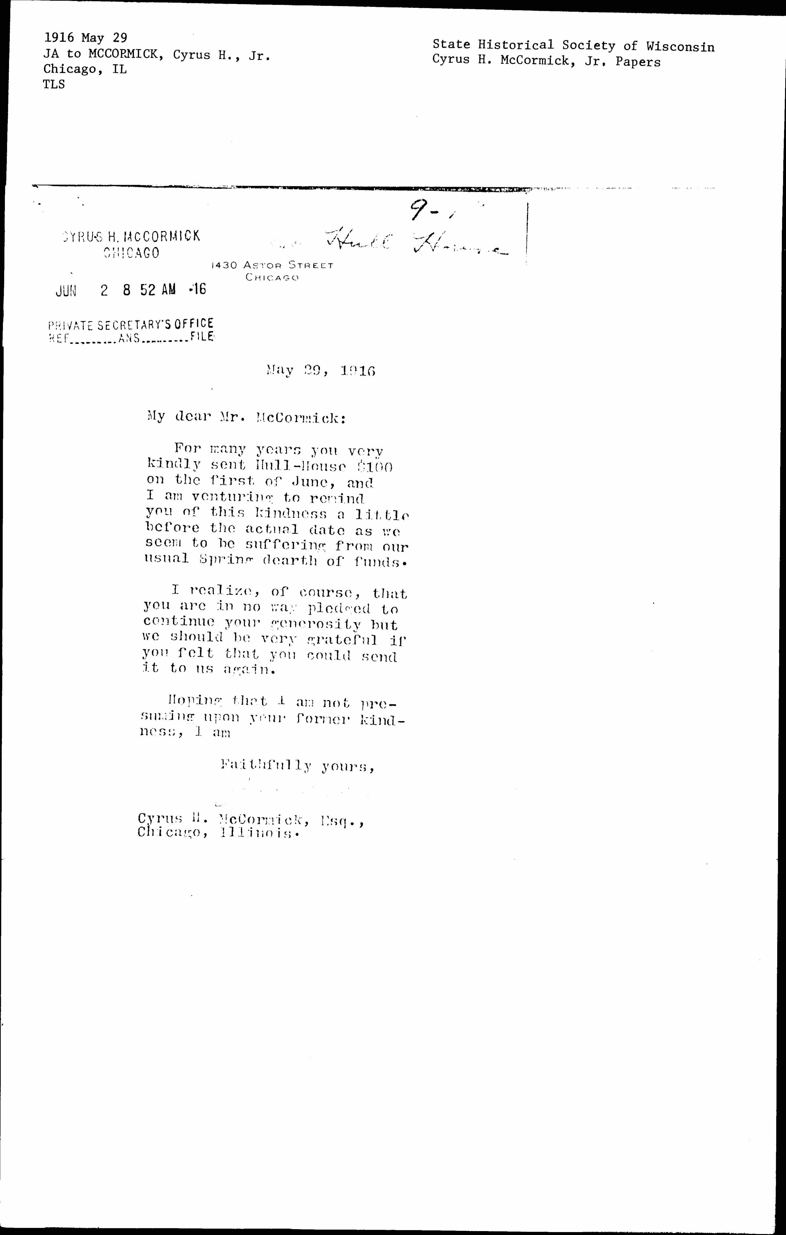 For many years you very kindly sent Hull-House $100 on the first of June, and I am venturing to remind you of this kindness a little before the actual date as we seem to be suffering from our usual Spring dearth of funds.